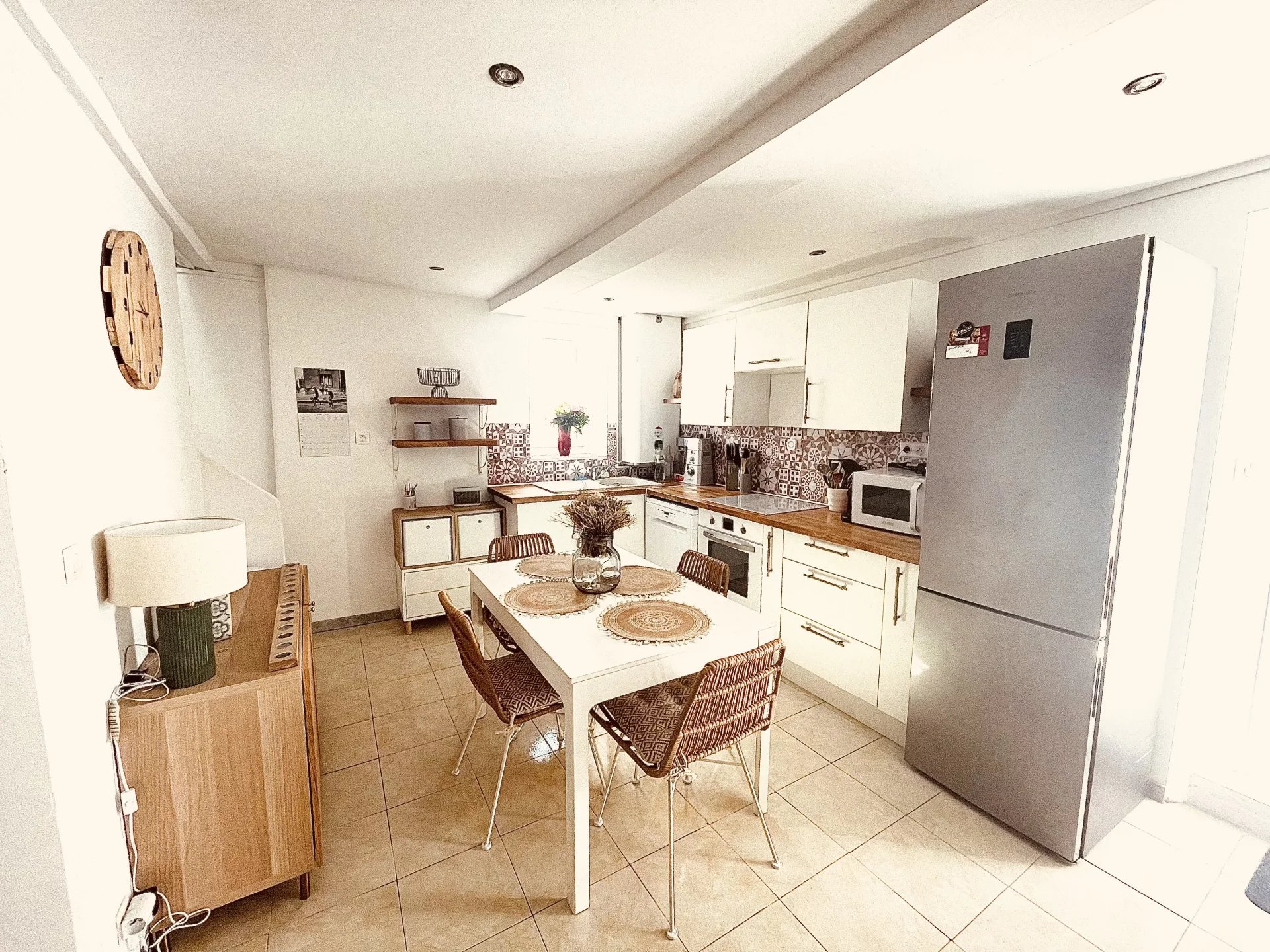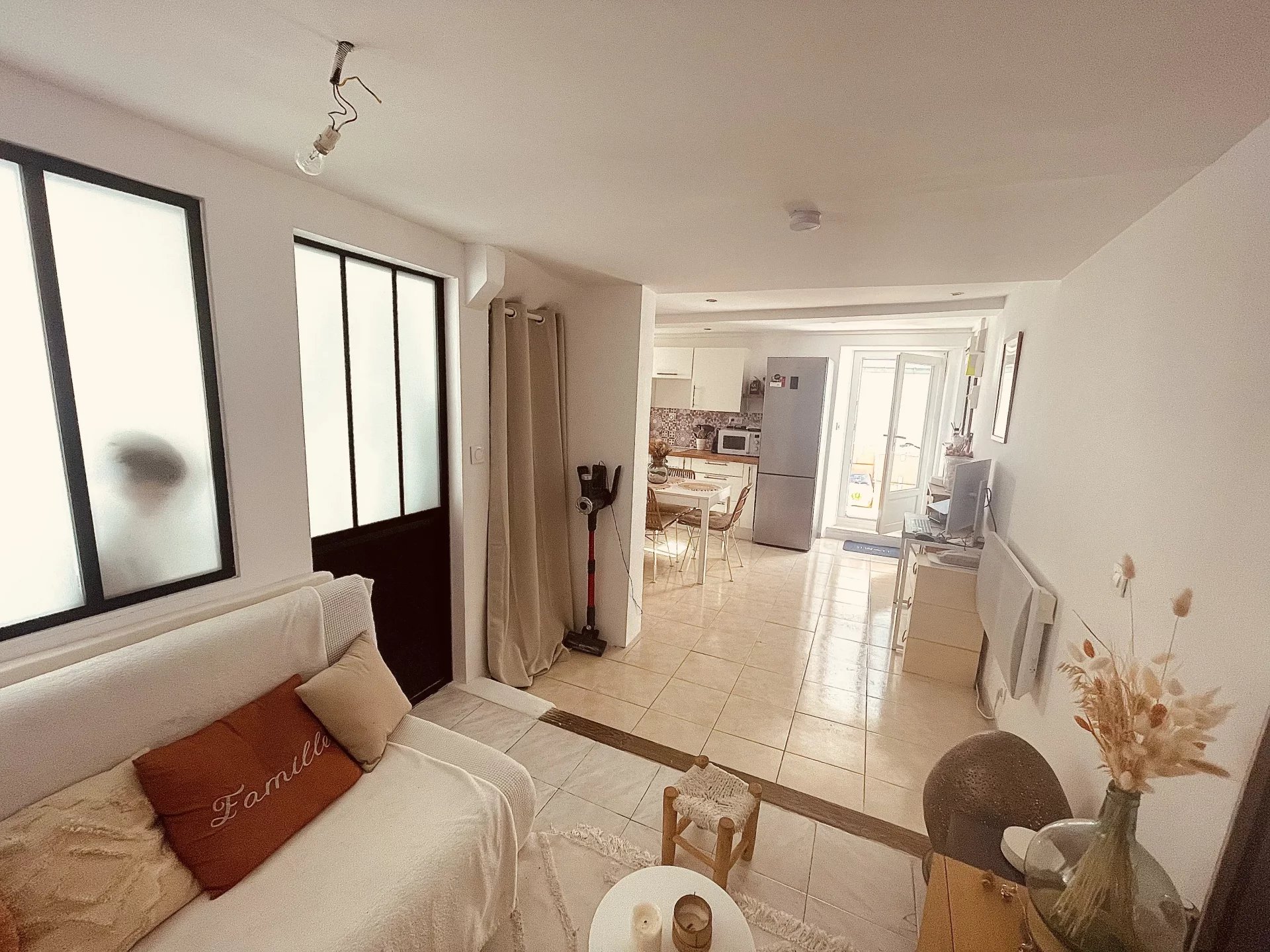 A vendre, Au coeur du village de Logis Neuf, maison de ville sur 2 niveaux avec extérieur. Au rdc, une grande pièce de vie en L distribue une cuisine avec salle à manger d'un côté et un salon de l'autre, ainsi qu'une salle de bains avec toilettes.