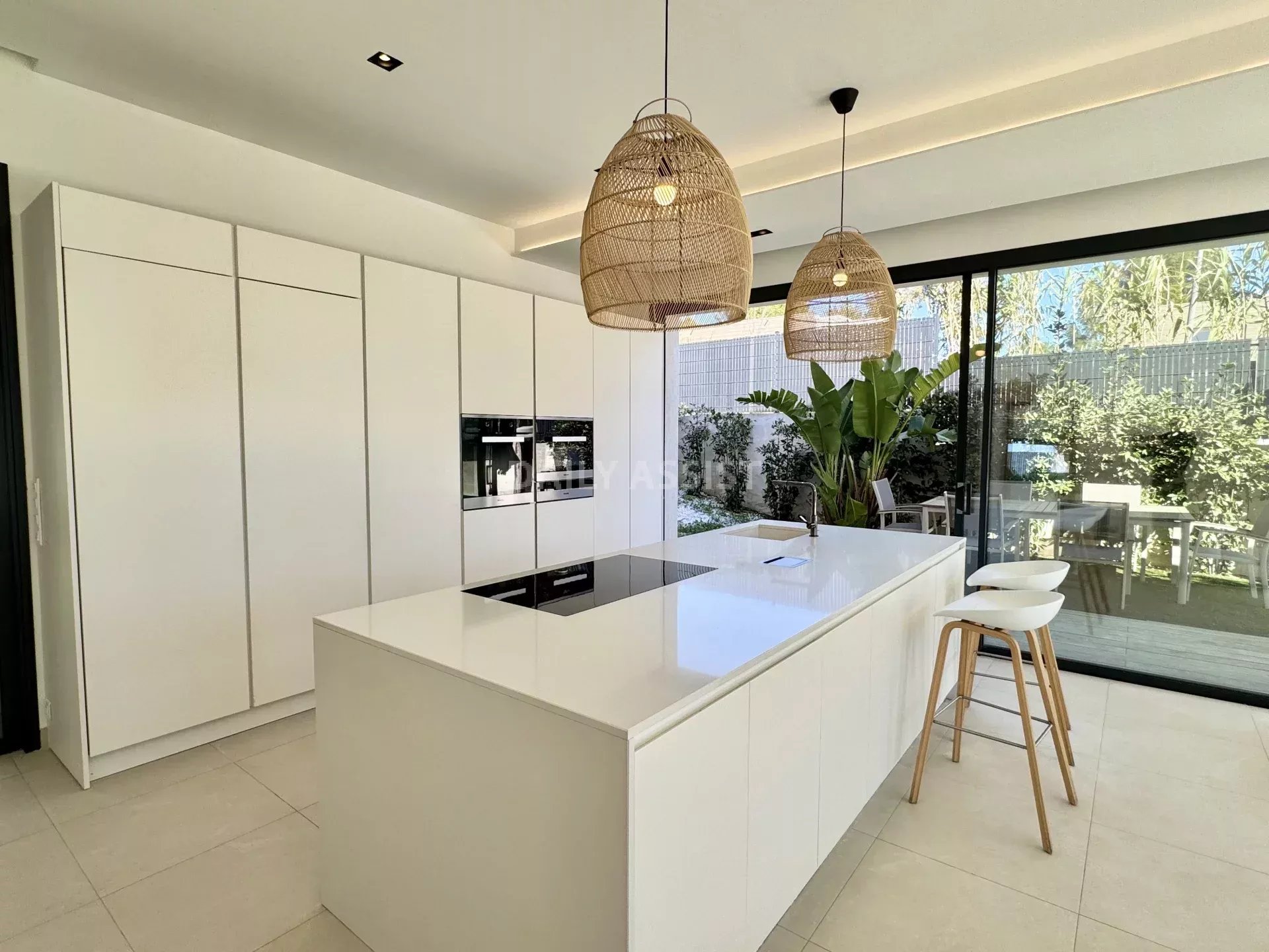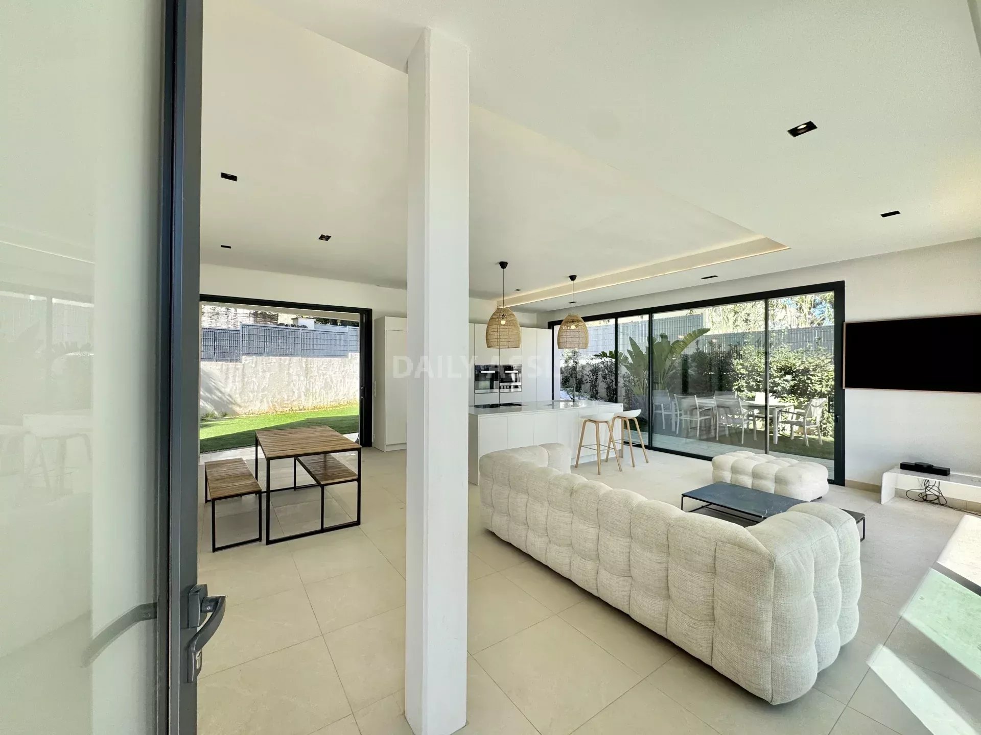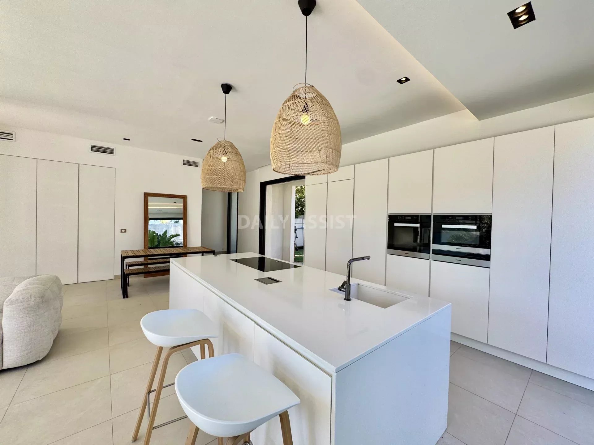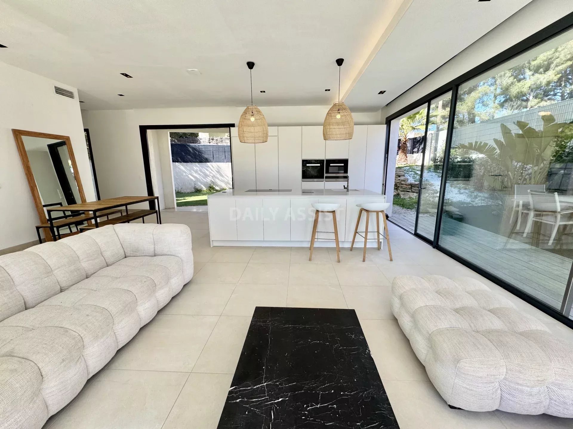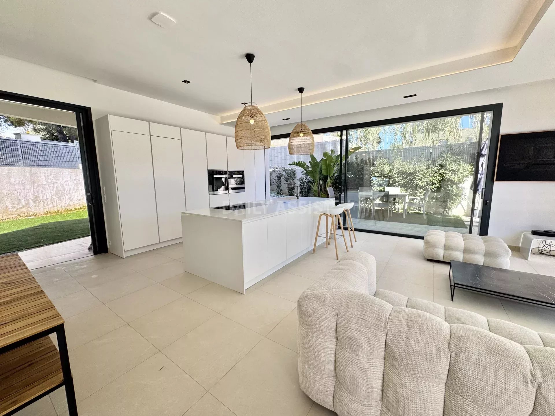 Édifiée sur trois niveaux, la maison propose de beaux volumes et une belle luminosité. Le rez-de-chaussée se compose d’un espace de vie convivial avec salon, salle à manger et cuisine ouverte entièrement équipée, avec électroménager haut de gamme. Cet espace s’ouvre directement sur l’extérieur, facilitant la vie quotidienne et les moments de détente.