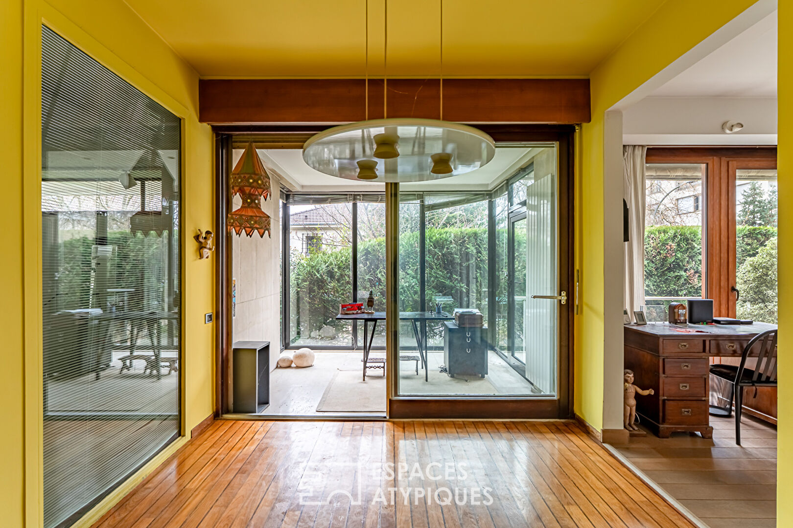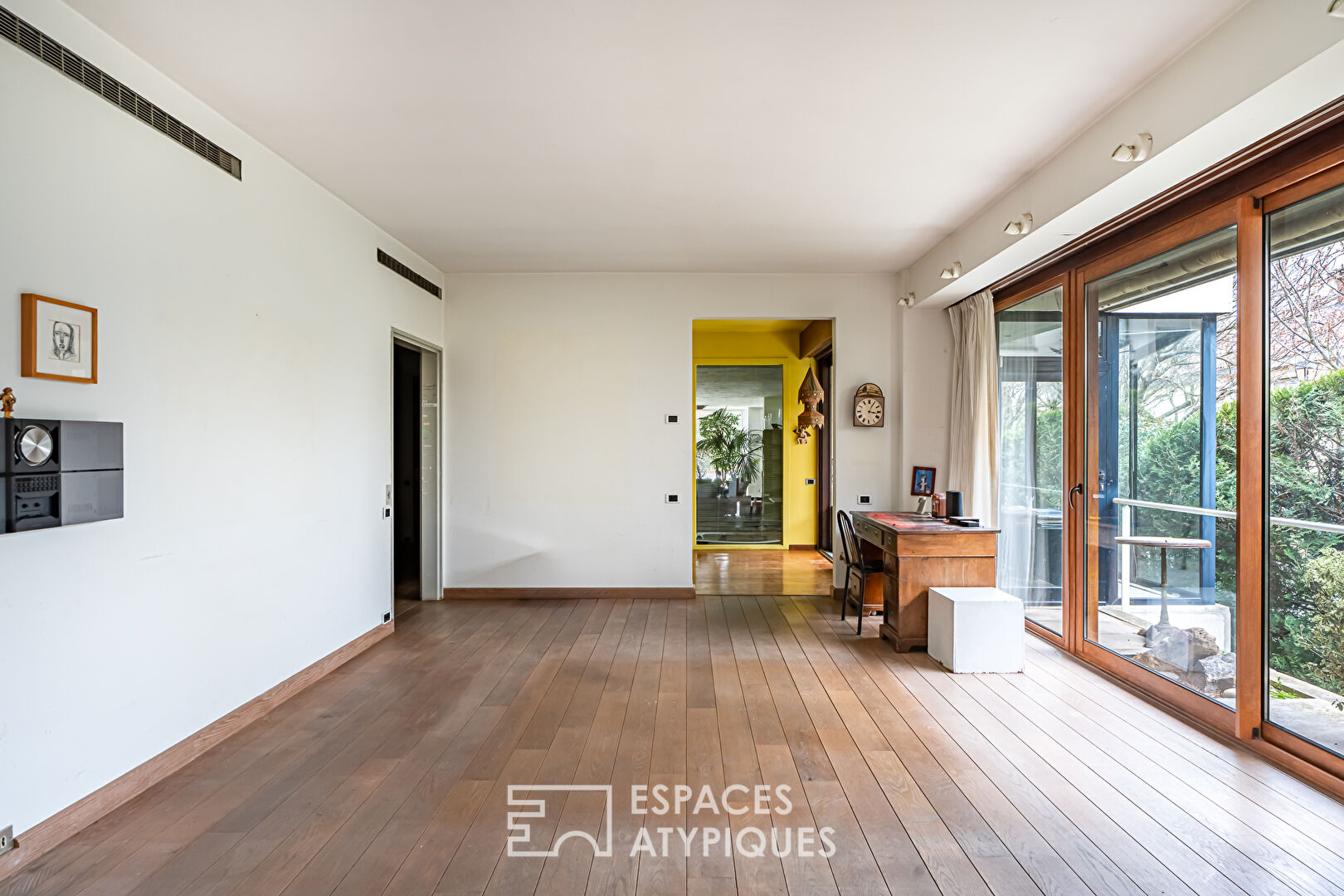 Une exclusivité Espaces Atypiques hauts de Seine. A l'abri des regards, dans un environnement calme de Saint-Cloud, à seulement 8 minutes de la gare du Val d'Or, cette maison de plain-pied dévoile une identité singulière sur 264,71m2 Carrez. Conçue à l'origine comme une maquette grandeur nature dans le but de commercialiser la résidence voisine, elle porte en elle une histoire atypique et une architecture assumée. Dès l'entrée, le ton est donné. Une vaste pièce de 98,96m2 Carrez, anciennement le bureau de vente, ouvre la visite. Espace brut, indépendant, inspirant? il offre un terrain d'expression rare : atelier d'artiste, espace de réception, extension du lieu de vie ou projet professionnel. Ici, tout reste à imaginer. La maison développe ensuite 165,75,71 m² Carrez, entièrement de plain-pied, avec une organisation fluide et lisible. Une entrée dessert sur la gauche, une double réception largement vitrée, ouverte sur le jardin, s'articulant autour d'une cheminée et d'une loggia. La lumière y circule déjà généreusement, et ne demande qu'à être révélée davantage pour jouer des perspectives et distiller une luminosité naturelle dans toute la maison. Sur la droite, une cuisine dinatoire aux proportions idéales, prolongée par une buanderie, une chaufferie et un point d'eau, attend une réinterprétation contemporaine. Dans le prolongement, un dégagement central dessert l'espace nuit aujourd'hui constitué de quatre chambres, dont une suite parentale avec dressing et salle de bains avec WC, une salle de bains indépendante et deux WC. A l'extérieur, le jardin de plus de 800 m², paysagé et entièrement clos, enveloppe la maison. Sa principale exposition Ouest promet une lumière douce en fin de journée et prolonge naturellement les espaces de vie vers l'extérieur. Non mitoyenne, en copropriété mais totalement indépendante avec de faibles charges, la maison dispose également de deux grandes places de stationnement. Entièrement à rénover, elle constitue une base idéale pour un projet familial hors normes. Volumes, circulation, lumière, potentiel d'extension et d'aménagement? tout est réuni pour révéler un lieu de vie singulier, en résonance avec l'architecture des années 70. Ici, rien n'est figé. Tout est à repenser, à sublimer, à s'approprier. Une maison pour ceux qui aiment créer plutôt que simplement habiter. Une opportunité rare de à découvrir pour ce qu'elle est aujourd'hui et surtout pour ce qu'elle peut devenir demain. Bien soumis au régime de la copropriété CLASSE ENERGIE : F / CLASSE CLIMAT : D Montant moyen estimé des dépenses annuelles d'énergie pour un usage standard, établi à partir prix moyens des énergies indexés sur les années 2021, 2022, 2023 (abonnements compris) : entre 6 850 euros et 9 330 euros. Les informations sur les risques auxquels ce bien est exposé sont disponibles sur le site Géorisques : https://www.georisques.gouv.fr Contact: Matthieu 06 13 81 26 54 (5.00 % honoraires TTC à la charge de l'acquéreur.) Copropriété de 75 lots - dont 32 lots habitation. Charges annuelles : 285 euros.