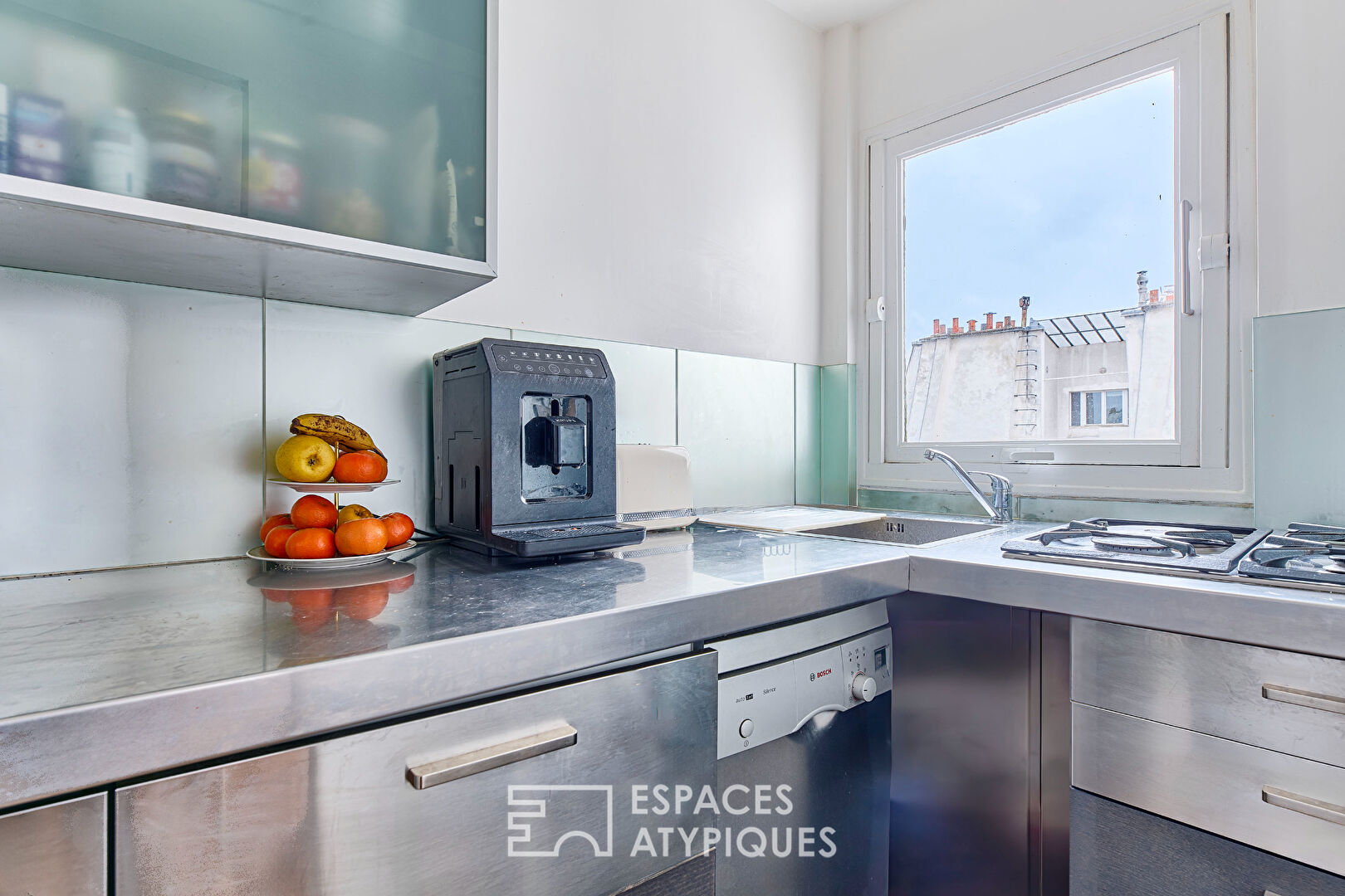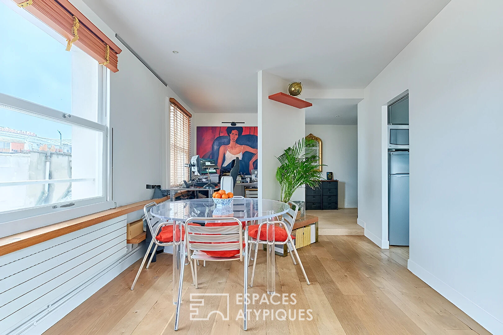 Situé en plein coeur du quartier Montorgueil, cet appartement de 60,05 m2 Carrez et sa terrasse de 18 m2 se trouvent au 6e étage par ascenseur, d'une belle copropriété bien entretenue. Il offre une sensation rare de liberté, d'ouverture et de calme grâce à sa luminosité et sa vue dégagée sur les toits de Paris. Une entrée avec rangements accueille un espace bureau et des toilettes. La pièce de vie de 33,5 m2 est entièrement baignée de lumière grâce à de larges fenêtres courant sur toute la longueur des façades. La double exposition crée une atmosphère aérienne, où le calme et la clarté dominent. Une cuisine semi-ouverte complète l'espace. Dans le prolongement du séjour, une chambre de près de 13 m2 avec rangements s'accompagne de sa salle de bains. Le véritable atout de ce lieu : la terrasse sans vis-à-vis de 18 m2 suspendue au-dessus de la ville, idéale pour profiter des beaux jours en toute tranquillité. Bien soumis au régime de copropriété. Métro Etienne Marcel ou Sentier (Lignes 3 et 4) Contact : Tiffany +33 7 57 17 59 76 Copropriété de 99 lots - dont 73 lots habitation. Charges annuelles : 2590 euros. TIFFANY KNAFO (EI) Agent Commercial - Numéro RSAC : 828 258 269 - PARIS.