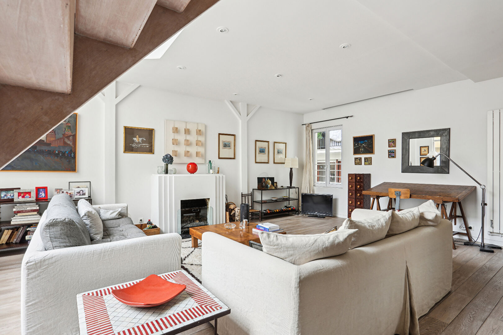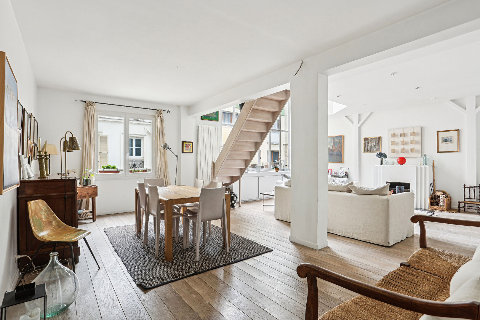 Proche de la rue Lepic et de ses commerces, du Moulin Rouge et de toute l'animation du 9e arrondissement, nous vous proposons un superbe atelier d'artiste de 117,44 m² Loi Carrez (120 m² au sol), niché au 3e étage avec ascenseur d'un magnifique immeuble Art Déco de 1930, conçu par l'architecte Ulysse Moussali. Ce bien, organisé sur deux niveaux, bénéficie d'une belle hauteur sous plafond de 5,30 m et a été aménagé avec des matériaux de qualité dans une esthétique raffinée. Dès l'entrée, vous découvrirez un espace de vie convivial de 50,83 m², comprenant une cuisine ouverte, une salle à manger et un salon lumineux et chaleureux, agrémenté d'une cheminée fonctionnelle. A l'étage, l'agencement modulable propose actuellement deux chambres confortables, une belle salle de bains et un grand dressing sur mesure. Cet espace peut aisément être réorganisé pour accueillir une troisième chambre, idéale pour une famille. Une cave complète ce bien. Copropriété sécurisée avec digicode et interphone. Copropriété de 21 lots - dont 21 lots habitation. Charges annuelles : 8100 euros.