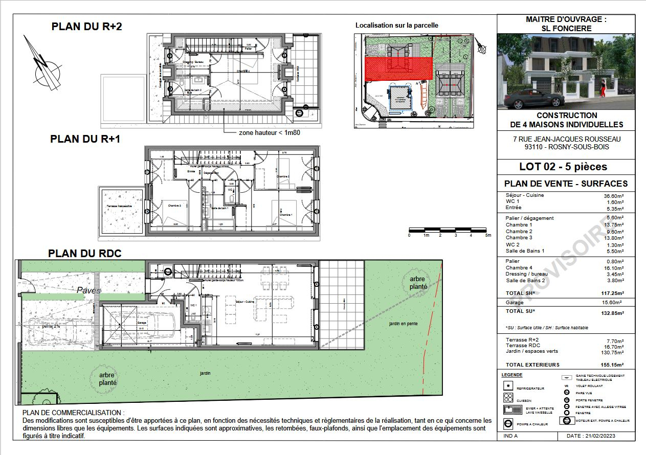 Située dans un environnement pavillonnaire calme et recherché, rue Jean-Jacques Rousseau à Rosny-sous-Bois, cette maison récente de 117 m² habitables, édifiée sur un terrain de 207 m², offre un cadre de vie agréable alliant confort, modernité et fonctionnalité. Dès l'entrée, vous découvrirez des espaces bien agencés et une circulation fluide, pensés pour répondre aux besoins d'une vie de famille. Au rez-de-chaussée, une entrée dessert un WC indépendant ainsi qu'un bel espace de vie de 37 m² comprenant un séjour lumineux et une cuisine ouverte, aménagée et entièrement équipée. Cet espace, convivial et chaleureux, s'ouvre directement sur une terrasse et un jardin exposés sud-est, offrant une belle luminosité tout au long de la journée. Au premier étage, un palier distribue trois chambres confortables, une salle de bain ainsi qu'un WC séparé. Cet étage constitue un espace nuit parfaitement adapté aux enfants ou aux invités. Le deuxième étage est entièrement dédié aux parents et accueille une suite parentale de 16 m² comprenant un dressing, une salle de bain privative et un accès à une terrasse de 8 m² exposée sud-est, idéale pour profiter d'un espace extérieur intime. Un garage ainsi qu'une place de stationnement extérieure complètent ce bien. La maison bénéficie de prestations de qualité, avec notamment du parquet massif, des volets roulants électriques et une pompe à chaleur. Elle est conforme aux normes RT2012, garantissant une bonne performance énergétique et un confort thermique optimal. Implantée dans un quartier résidentiel apprécié, la maison se situe à proximité des écoles, des commerces, des transports et des principaux axes, facilitant le quotidien. Ce bien conviendra parfaitement à une famille à la recherche d'un logement moderne, fonctionnel et sans travaux, dans un cadre de vie agréable. Disponible 4T26