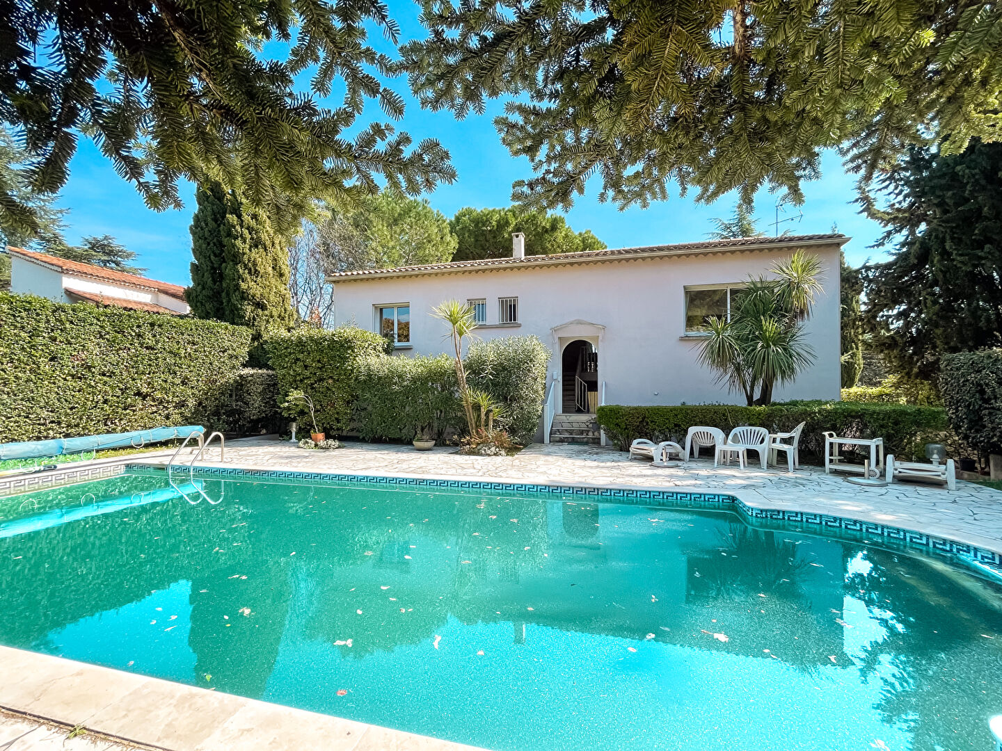 Maison de charme des années 70', 6 pièces + garage, d'environ 175m2 habitables. Bâtie sur un terrain de 929m2 avec piscine, terrasse et cuisine d'été. Au rez-de-chaussée, une vaste entrée mène vers un bel escalier et un premier espace nuit composé de 3 chambres de 10 et 11m2, d'une salle de bains et d'un wc indépendant. A l'étage, un demi-palier donne accès au jardin puis à la suite, le palier dessert le salon-séjour traversant et très lumineux de 36m2, la cuisine équipée de 10m2, la salle à manger de 23m2 et un deuxième espace nuit avec un wc, une chambre de 16m2 avec placards et sa salle de bains. Dans la continuité des baies vitrées coulissantes du séjour et de la cuisine, une large terrasse ensoleillée et abritée de ±20m2 permet de profiter d'un bel espace repas extérieur à niveau. Également, un large garage de 28m2, une lingerie de 9m2 et une petite cave. Jardin autour des 4 faces de la maison avec piscine carrelée 11x5m, terrasse et cuisine d'été. A l'avant, de beaux espaces en pelouse et un aire de stationnement pour plusieurs véhicules à l'abri du portail. Maison saine, entièrement rénovée dans les années 90'. Idéalement située dans un quartier très prisé, proche du tramway, des commerces, des écoles et de l'Espace Trinquat - Nouvelle Arènes (4.03 % honoraires TTC à la charge de l'acquéreur.)