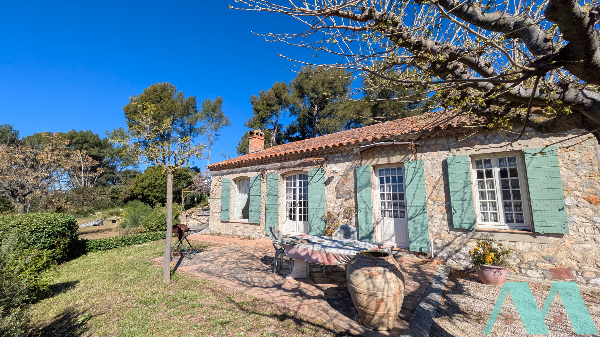 Développant environ 133m2 habitales, la maison séduira par son charme provençal, sa façade parée de pierres, volets traditionnels à lames croisées, double rang de génoise, fenêtres cintrées et poutres apparentes.