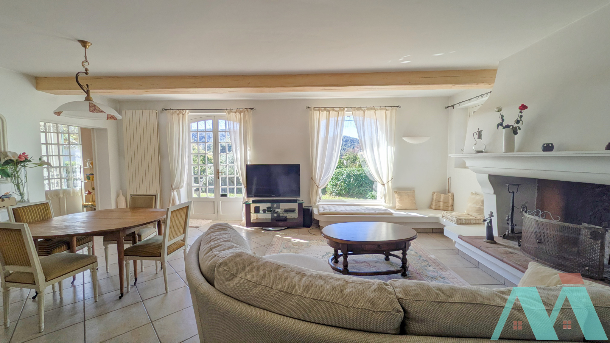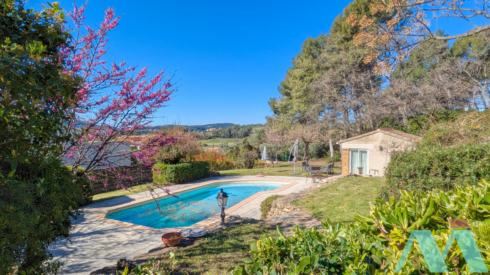 La jolie entrée dessert le séjour lumineux de près de 50m2 et la cuisine, le tout donnant sur la terrasse et sa vue dégagée sur le jardin, la piscine, et les collines en perspective. Vous bénéficierez de deux chambres avec chacune sa salle d'eau/bains, deux wc et une buanderie.