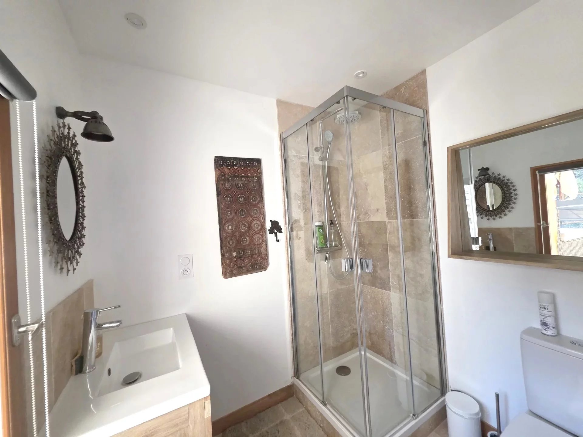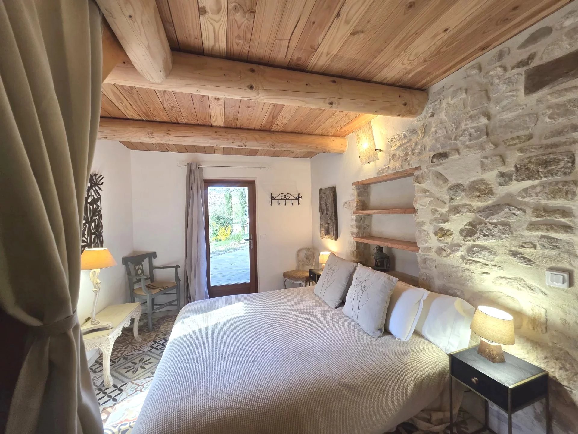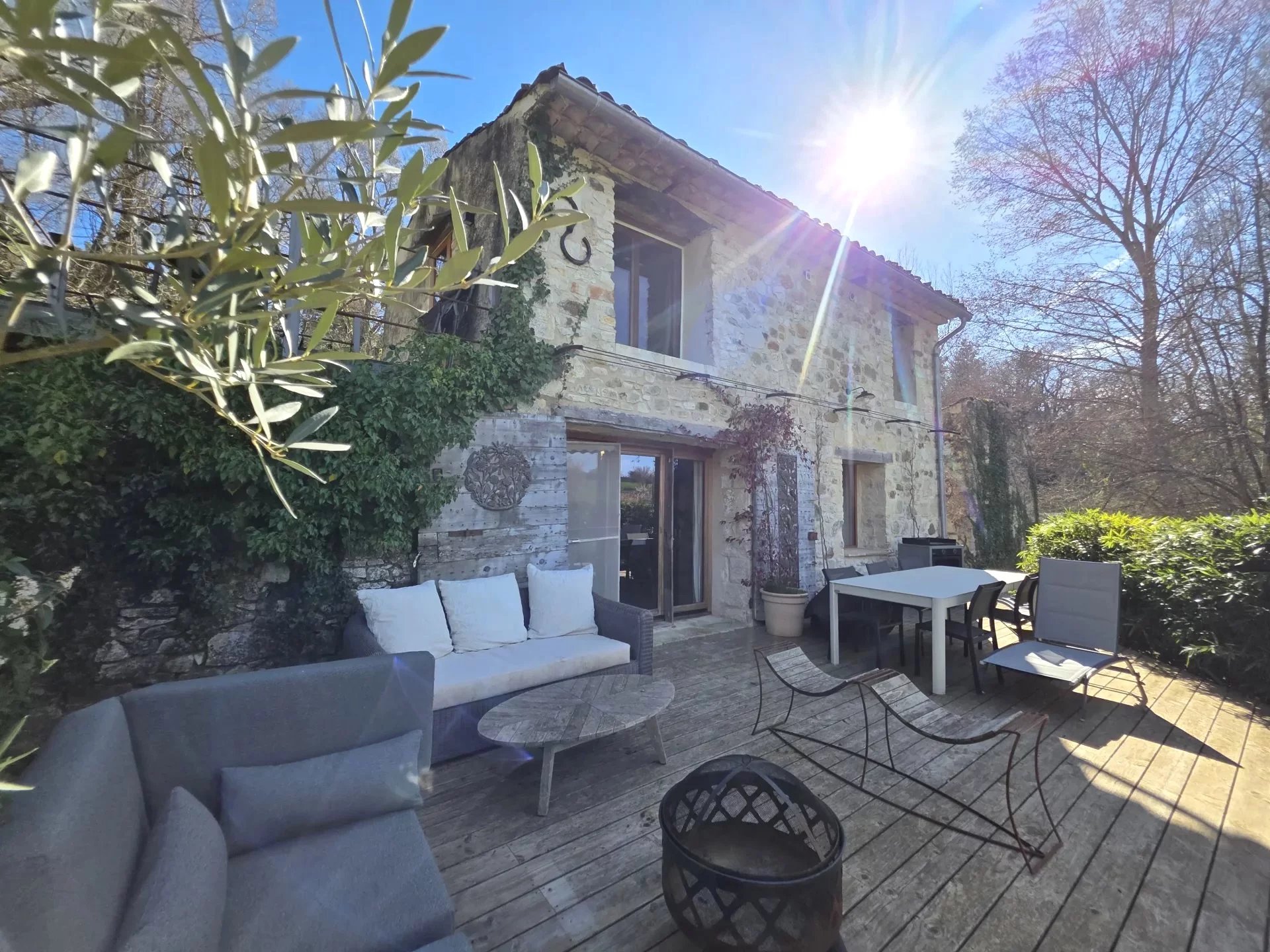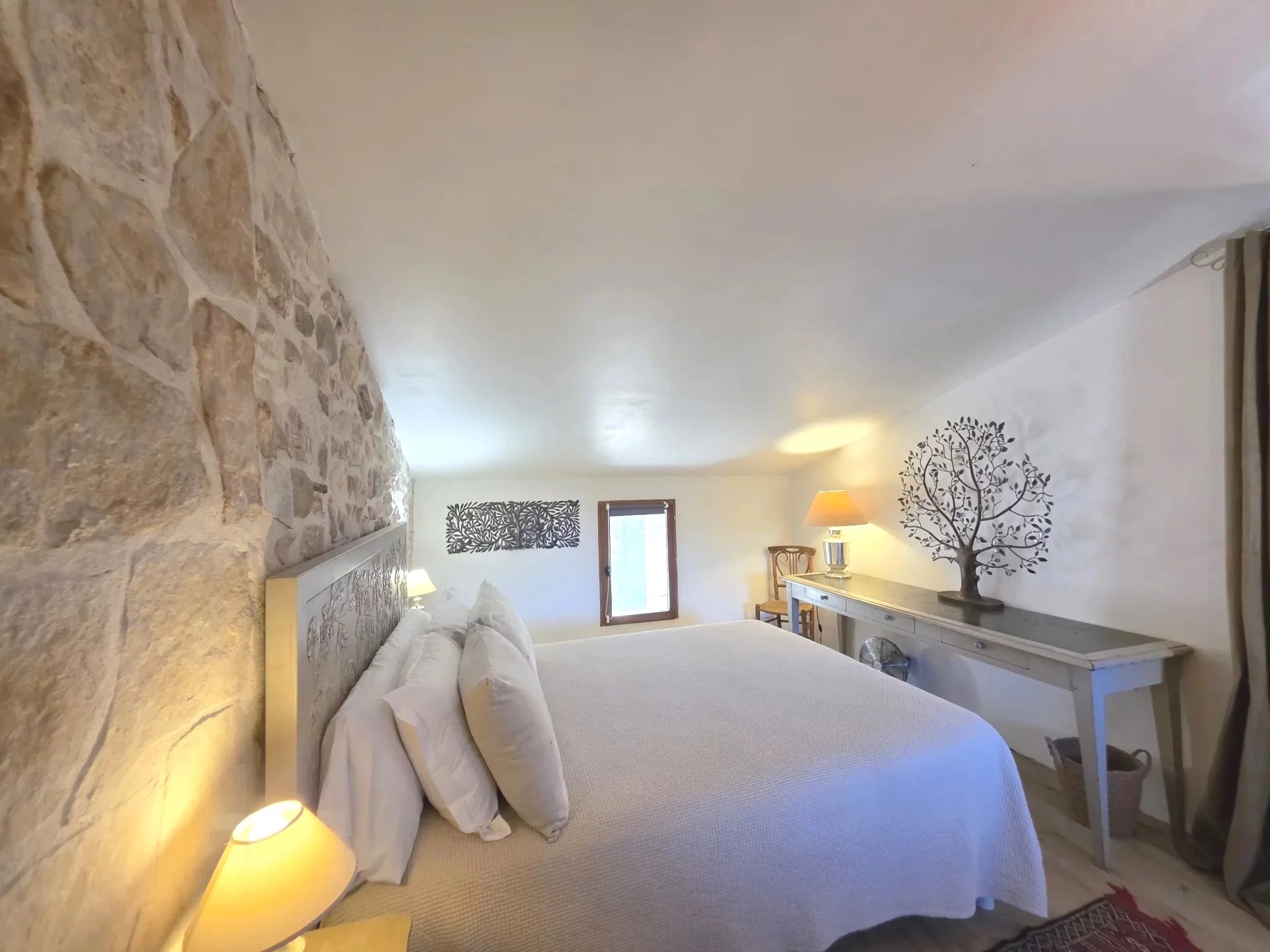 Dans le Parc naturel régional du Luberon, à 10 km d’Apt, découvrez cette belle maison en pierre ancienne entièrement rénovée (années 2010), posée sur un terrain arboré de 8000 m² avec source dans laquelle il est possible de ce rafraichir l'été et un ruisseau à Rustrel (petit village plein de charme), porte d'entrée du Colorado Provençal. Le cachet de la pierre, la vue sur les monts du Vaucluse et la modularité des espaces en font un bien rare qui peut être utilisé comme résidence principale, maison de vacances ou investissement type gîte et chambres d’hôtes. La maison principale dispose d'une pièce de vie agréable ouvrant sur deux terrasses avec une belle vue sur les Monts de Vaucluse, d'une cuisine semi-ouverte et équipée donnant sur une terrasse plein sud (côté forêt), ainsi que d'un salon secondaire avec kitchenette et une chambre de plain pied avec terrasse, une douche aménagée dans un ancien pigeonnier et un toilette indépendant. L'étage quant à lui dispose de trois chambres (dont une avec toilettes privatives et point d’eau), d'une salle de bain avec douche et baignoire, de toilettes séparés et d'un dressing. Deux des chambres de la maison principale bénéficient d’une terrasse privative avec un accès direct de l'extérieur. Actuellement divisible en gîte indépendant (séjour + coin cuisine, chambre au rez-de-chaussée et deux chambres à l’étage); le reste demeure privatif. L’ensemble de la maison principale est modulable selon vos projets. Sur le terrain vous serez charmés par deux cocons supplémentaires permettant d'ajouter deux chambres supplémentaires à la maison principale. Vous trouverez une roulotte toute équipée comprenant un coin nuit, une douche, une kitchenette et une terrasse. Et un chalet indépendant type studio, disposant d'un espace chambre, d'un coin cuisine, d'une douche, d'une belle terrasse et de toilettes sèches. Ces hébergements sont idéaux pour les amis, la famille ou de la location insolite. Cette maison saura vous séduire par son charme, sa vue dégagée, ses multiples expositions et son usage flexible au pied du Colorado provençal.