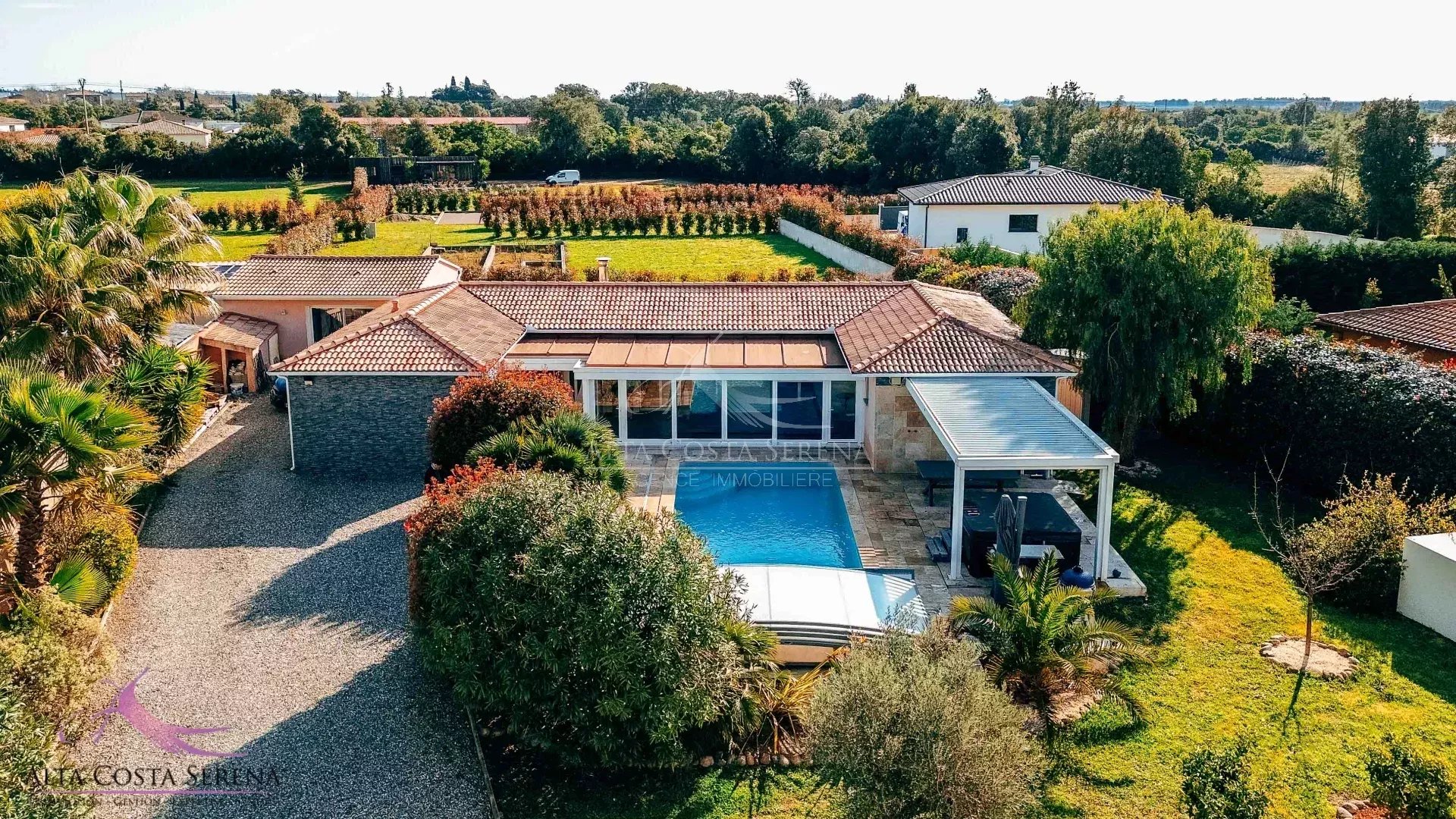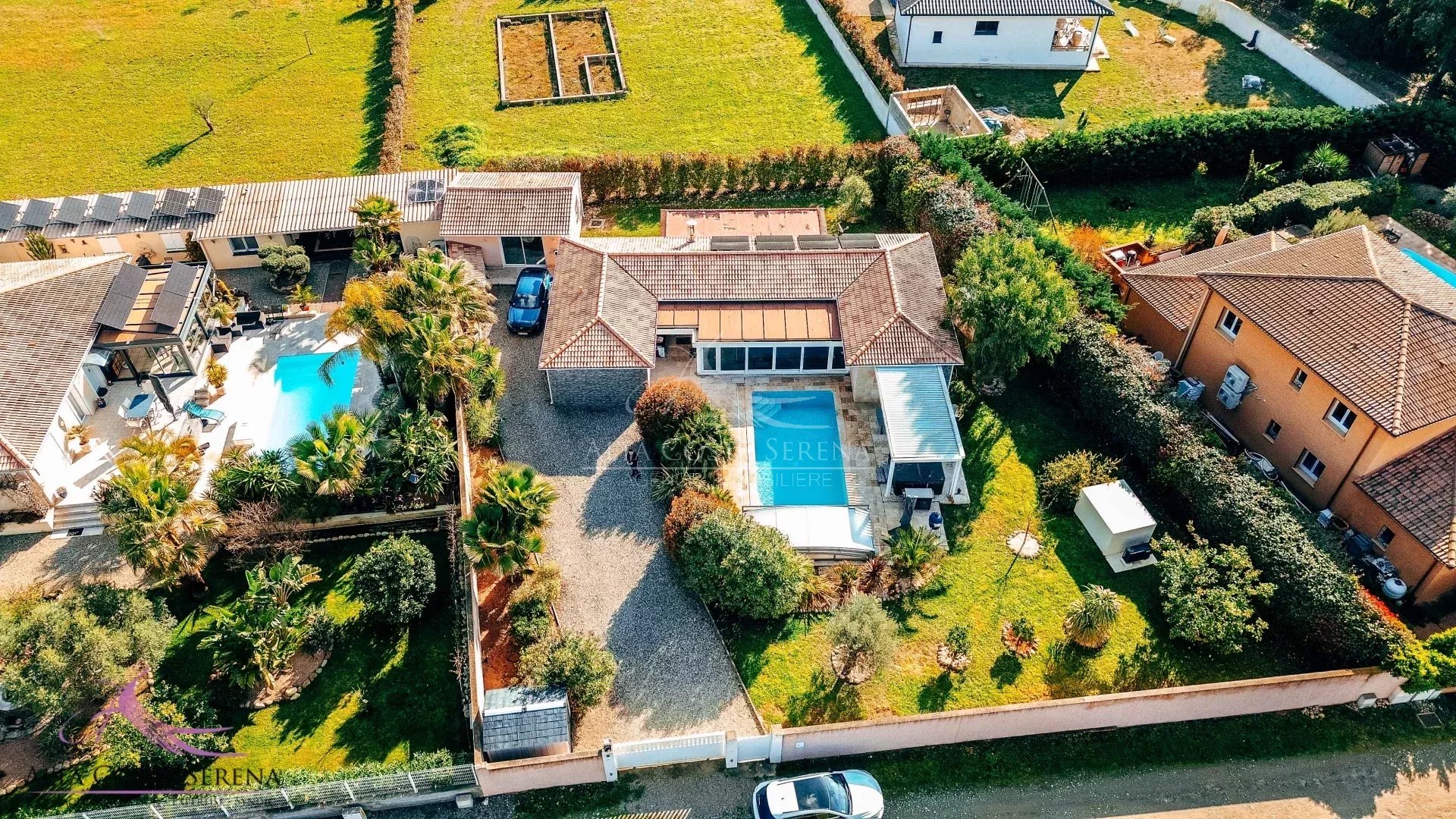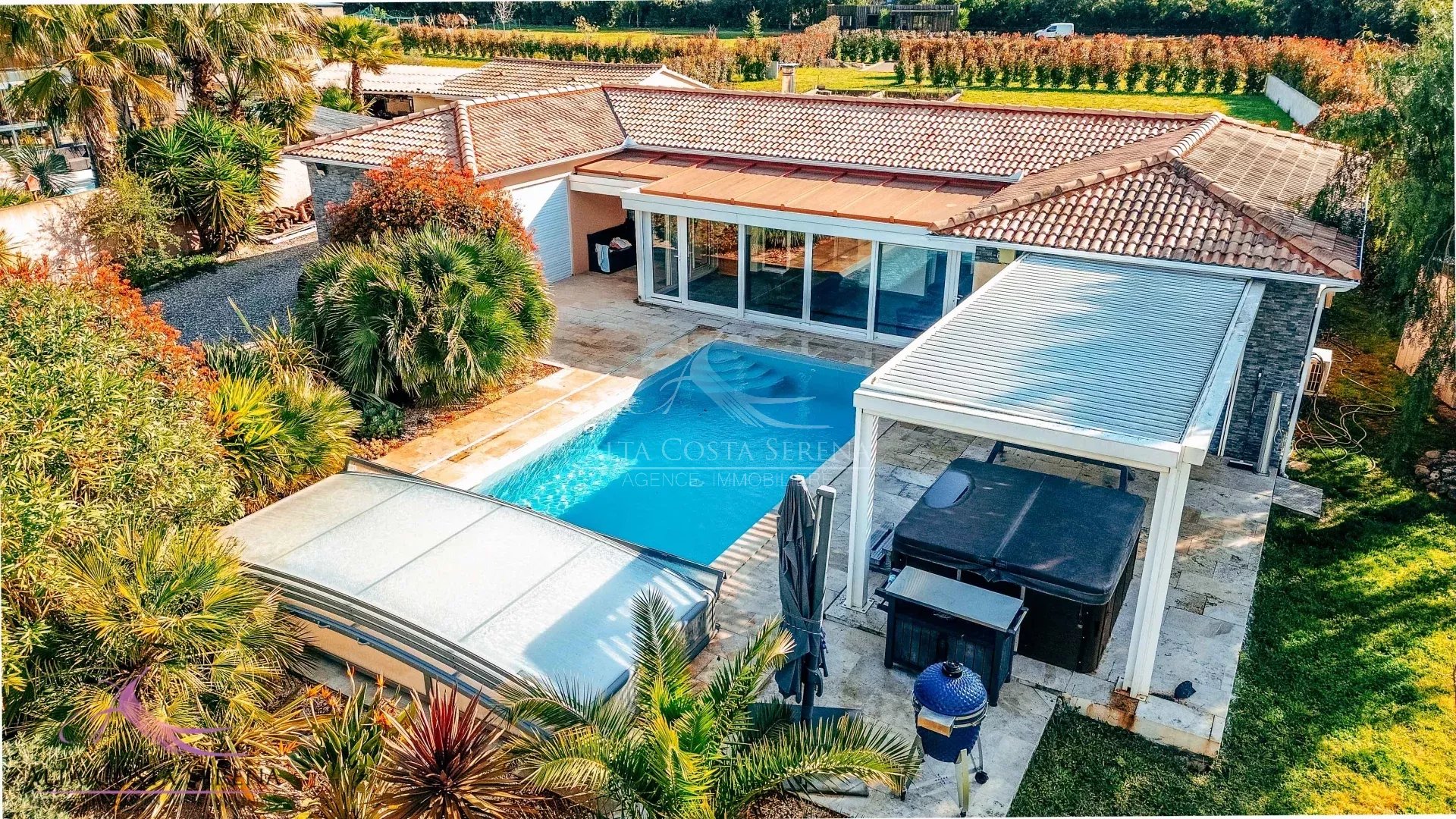 À l’extérieur, vous profiterez d’un terrain clos et arboré dans un environnement calme, avec piscine couverte au sel. Les équipements comprennent également la climatisation, une cheminée, un portail électrique, un jacuzzi, une pergola bioclimatique, des panneaux photovoltaiques et une borne de recharge pour véhicules électriques.