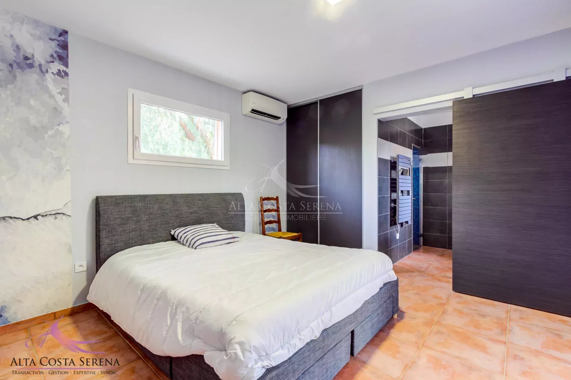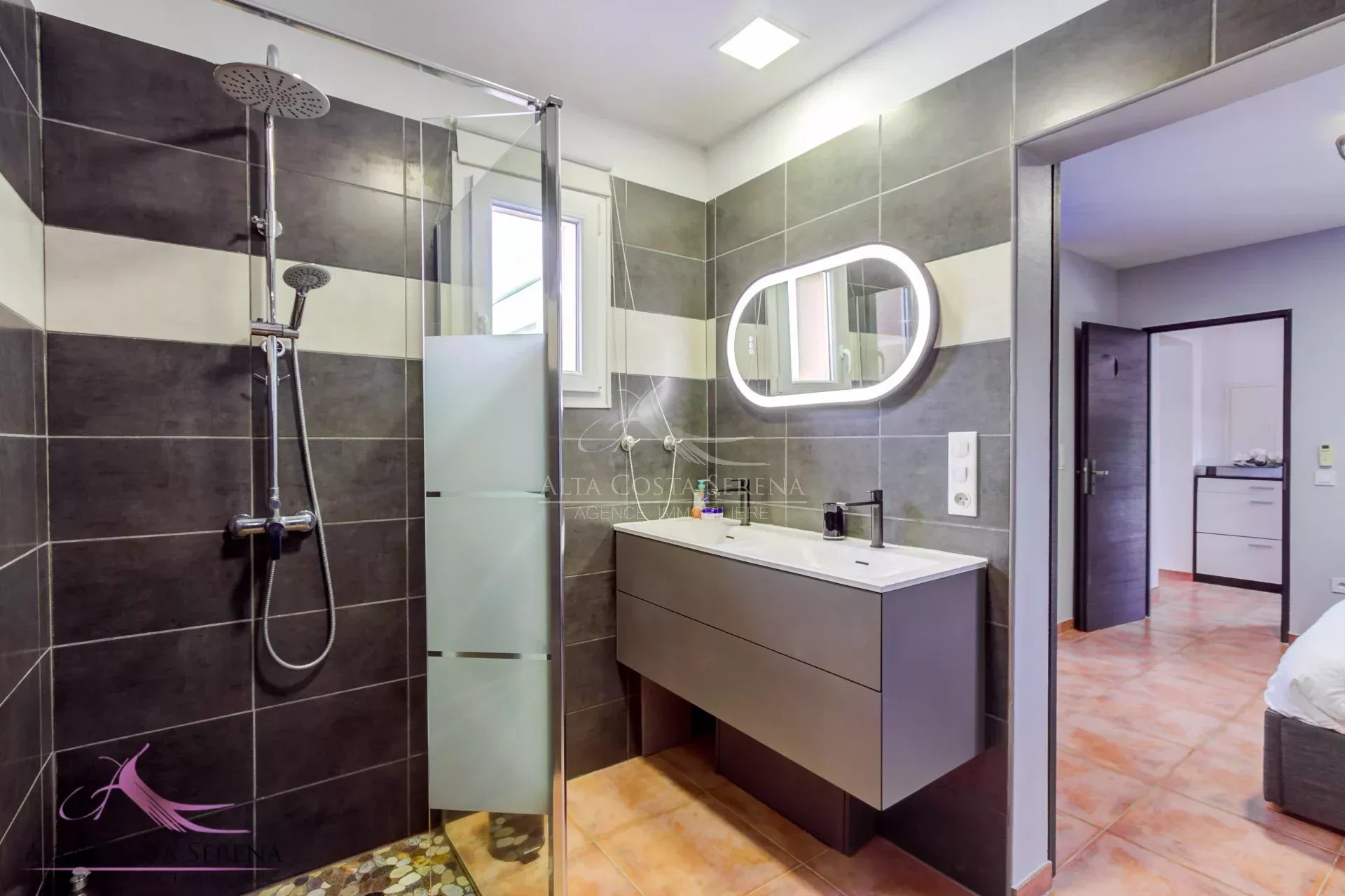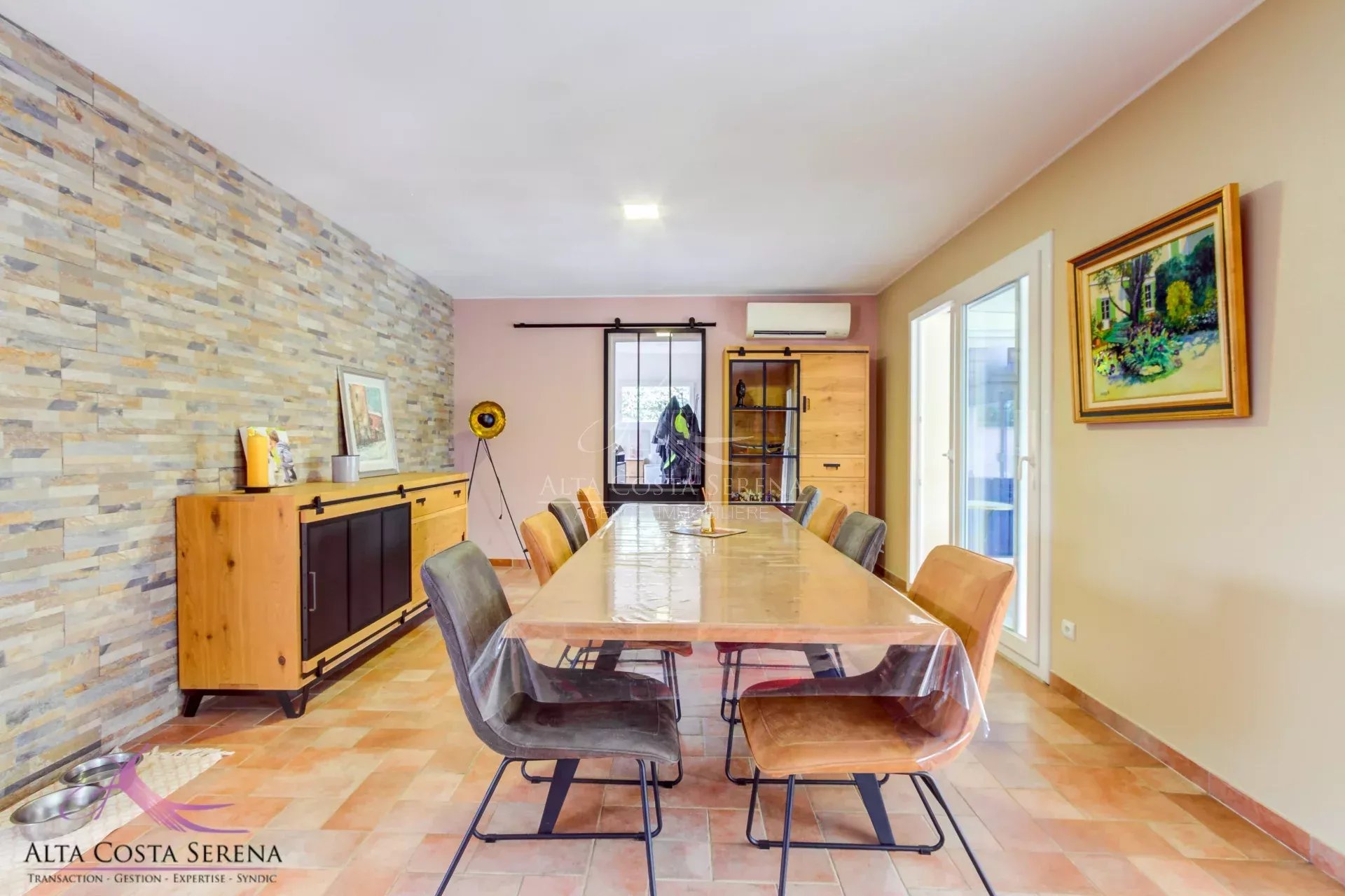 Maison de plain-pied construite en 2012, d’une superficie d’environ 174 m², offrant des prestations confortables et modernes. Elle se compose de trois chambres, dont une belle suite parentale avec hammam et salle d’eau. L’espace de vie comprend un salon–salle à manger lumineux de 38 m², ainsi qu’une cuisine moderne entièrement aménagée.