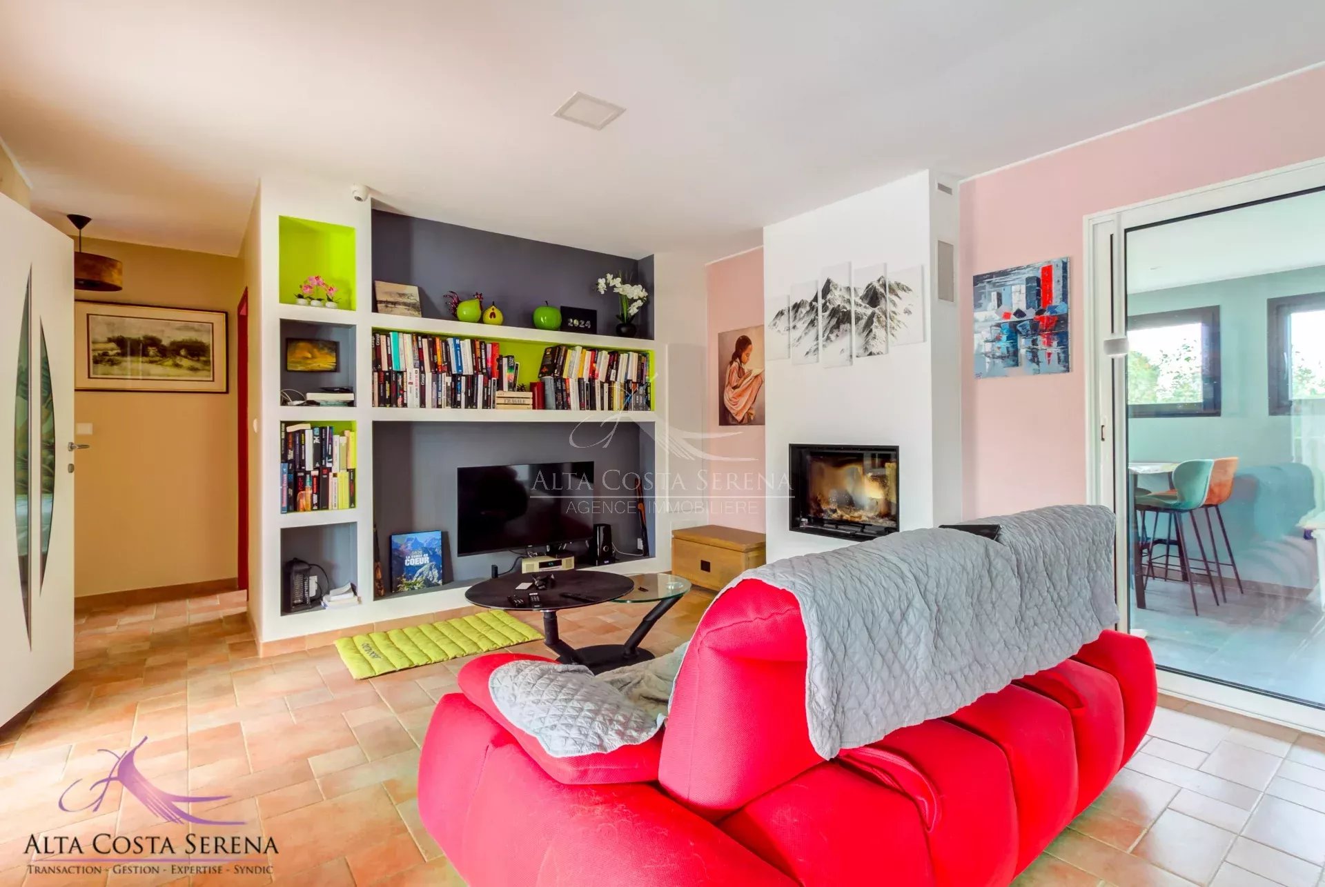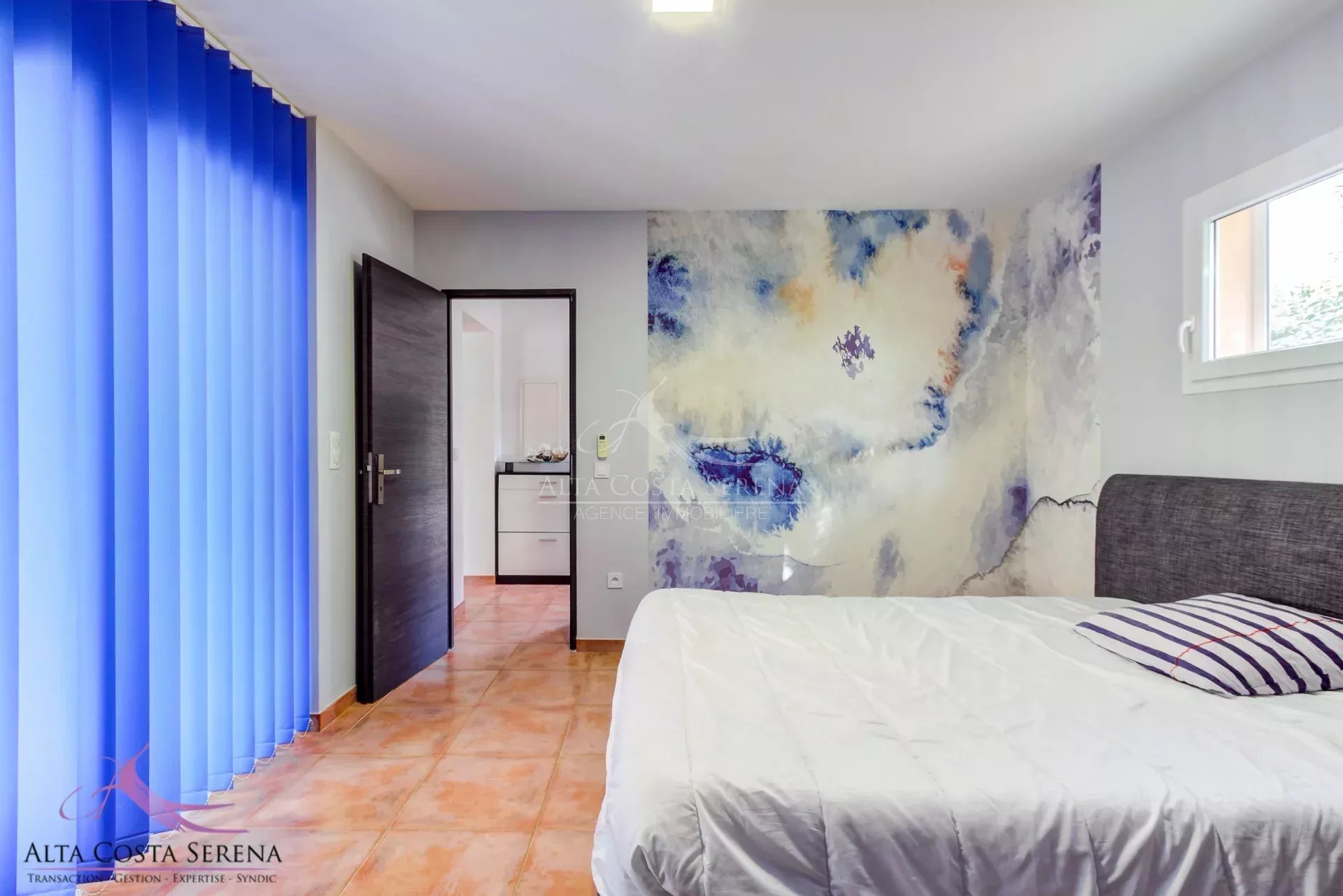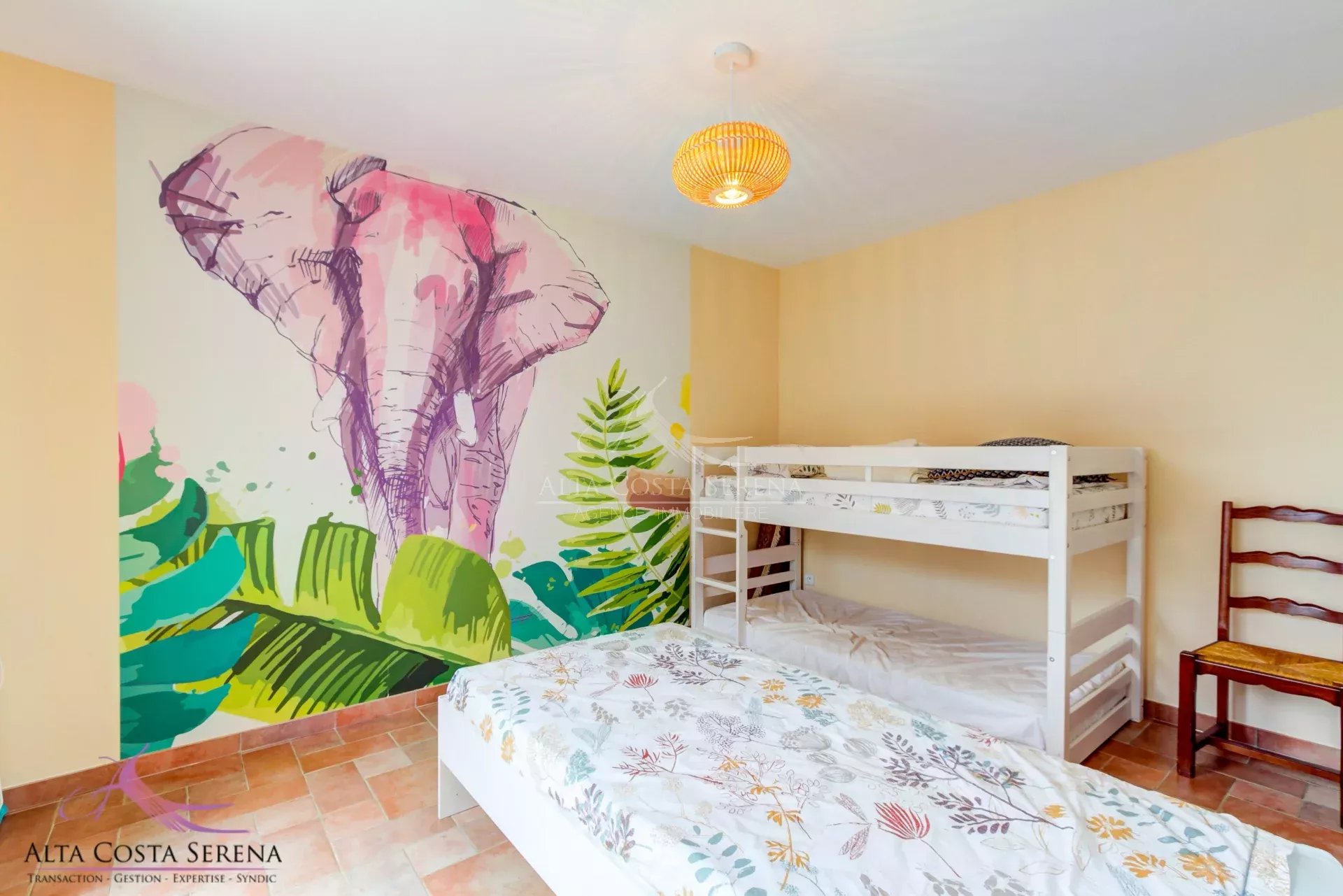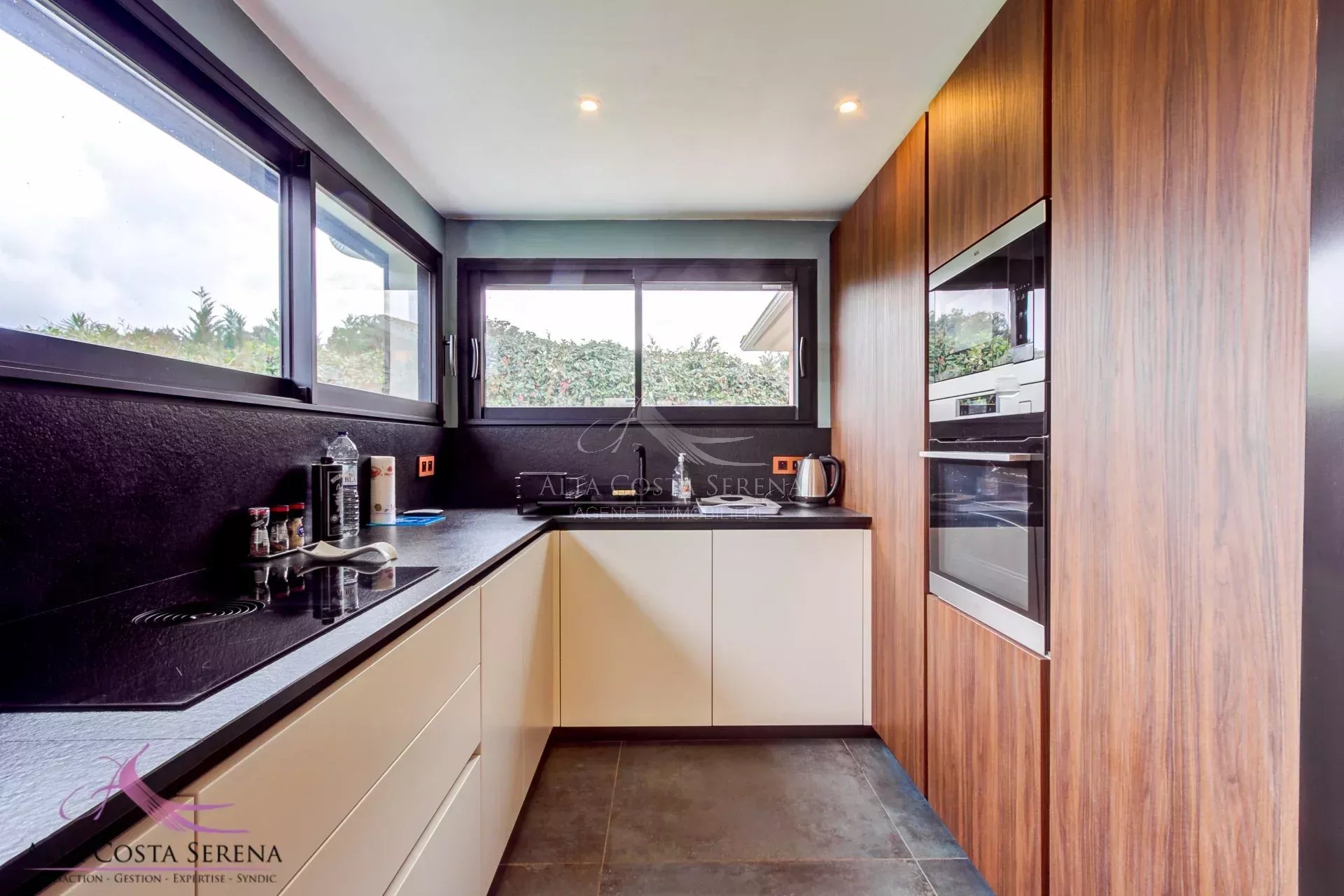 Maison de plain-pied construite en 2012, d’une superficie d’environ 174 m², offrant des prestations confortables et modernes. Elle se compose de trois chambres, dont une belle suite parentale avec hammam et salle d’eau. L’espace de vie comprend un salon–salle à manger lumineux de 38 m², ainsi qu’une cuisine moderne entièrement aménagée.