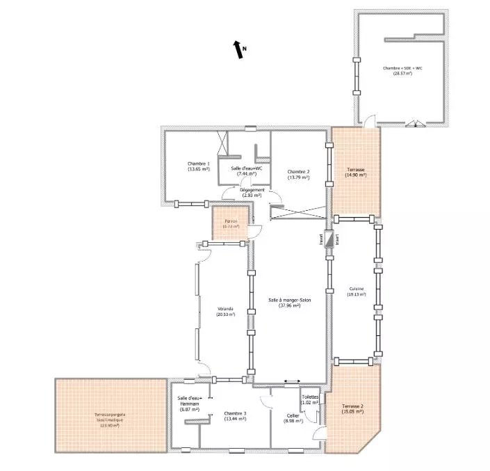 La maison dispose également d’une seconde salle d’eau avec WC, d’un WC indépendant et d’un cellier. Une véranda de 20 m² vient compléter l’espace de vie et s’ouvre sur un ensemble de terrasses totalisant 54 m².