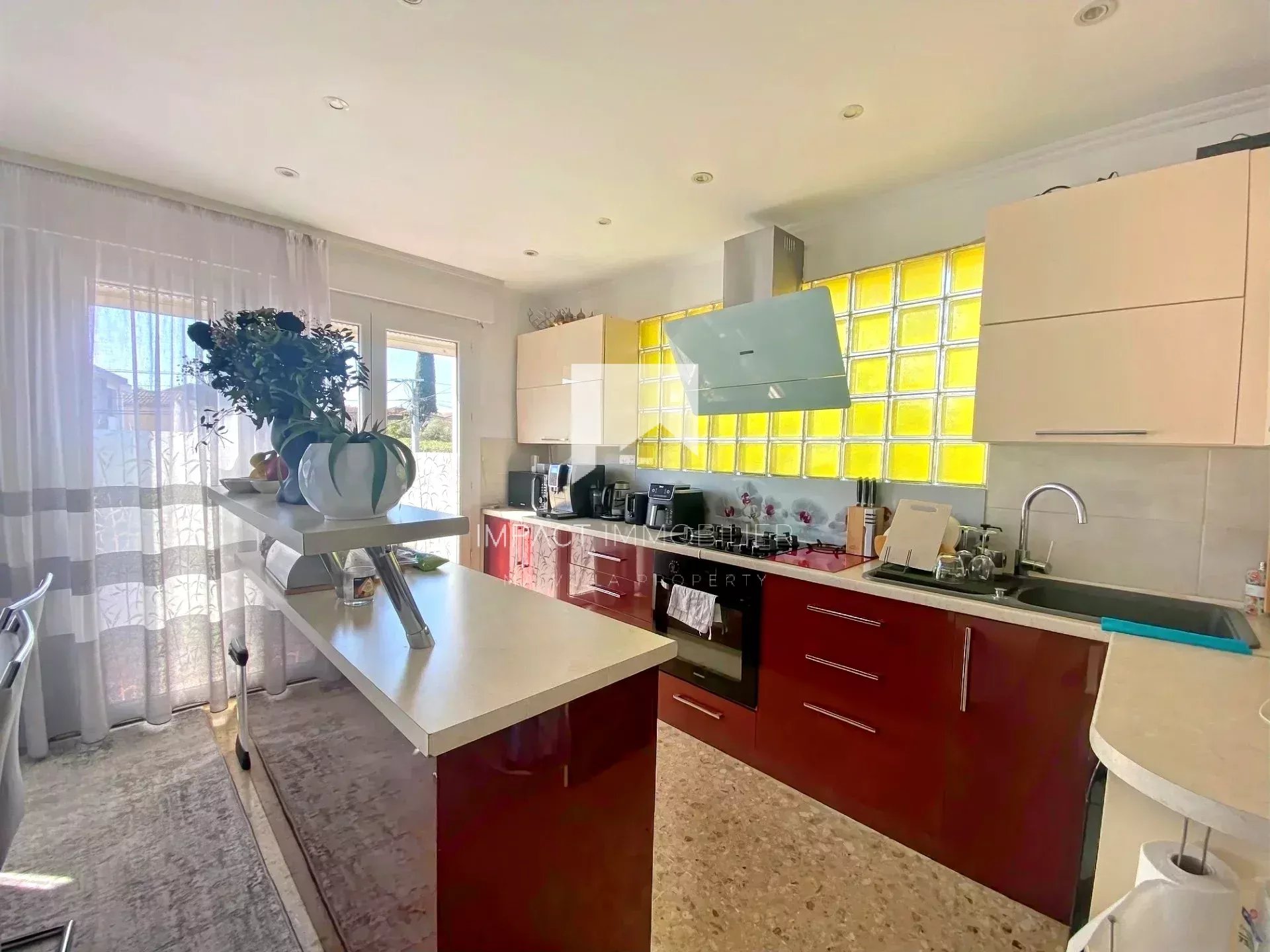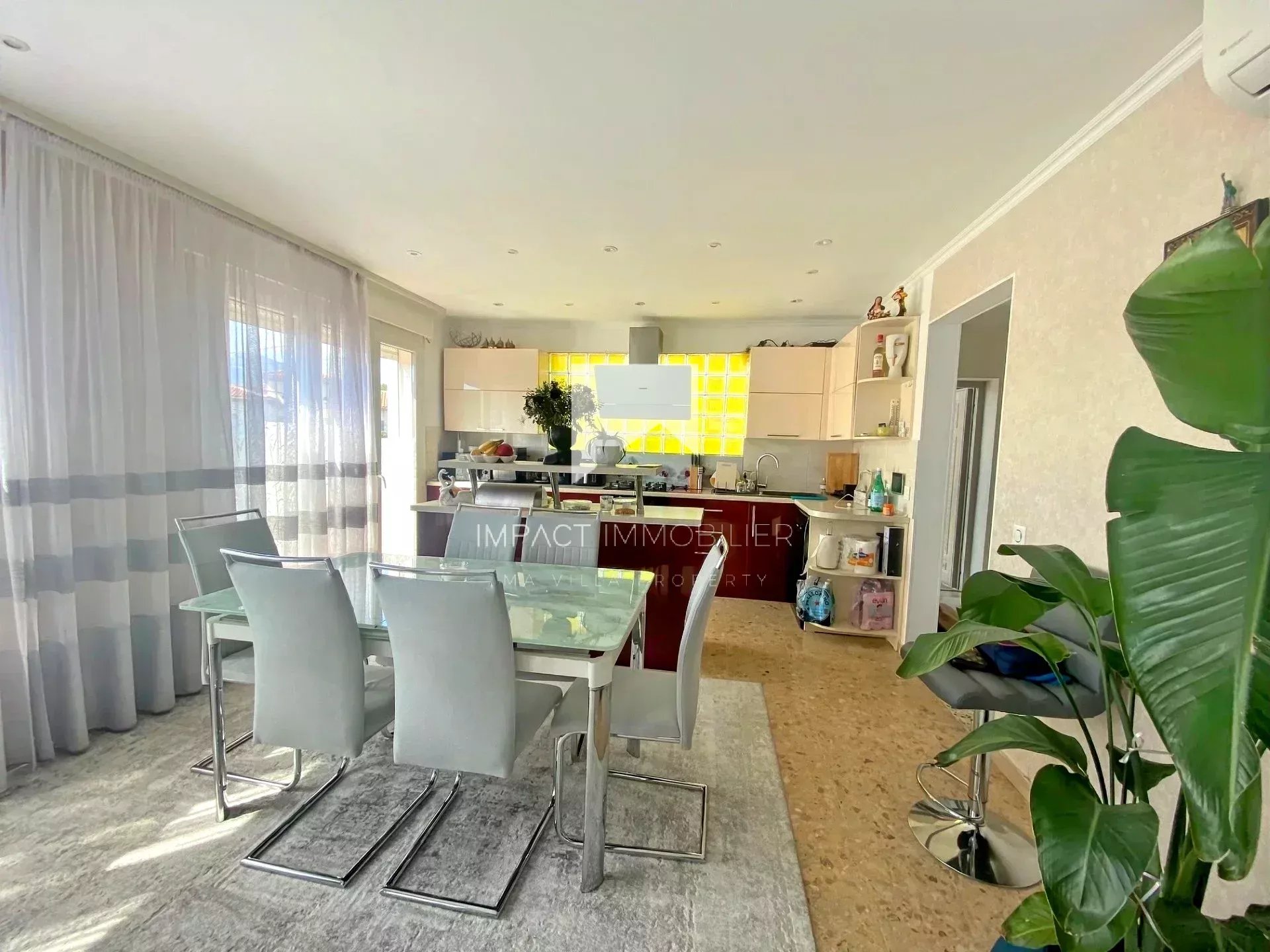 L’habitation, développée principalement au premier étage, s’ouvre sur une véranda, véritable sas de transition élégant et lumineux, puis sur une entrée desservant une pièce de vie d’environ 35 m² avec séjour et cuisine ouverte. Baigné de lumière grâce à son exposition plein sud, cet espace se prolonge naturellement vers une terrasse ensoleillée, idéale pour savourer pleinement l’art de vivre méditerranéen. Le séjour bénéficie en outre de la climatisation, pour un confort optimal en toute saison.