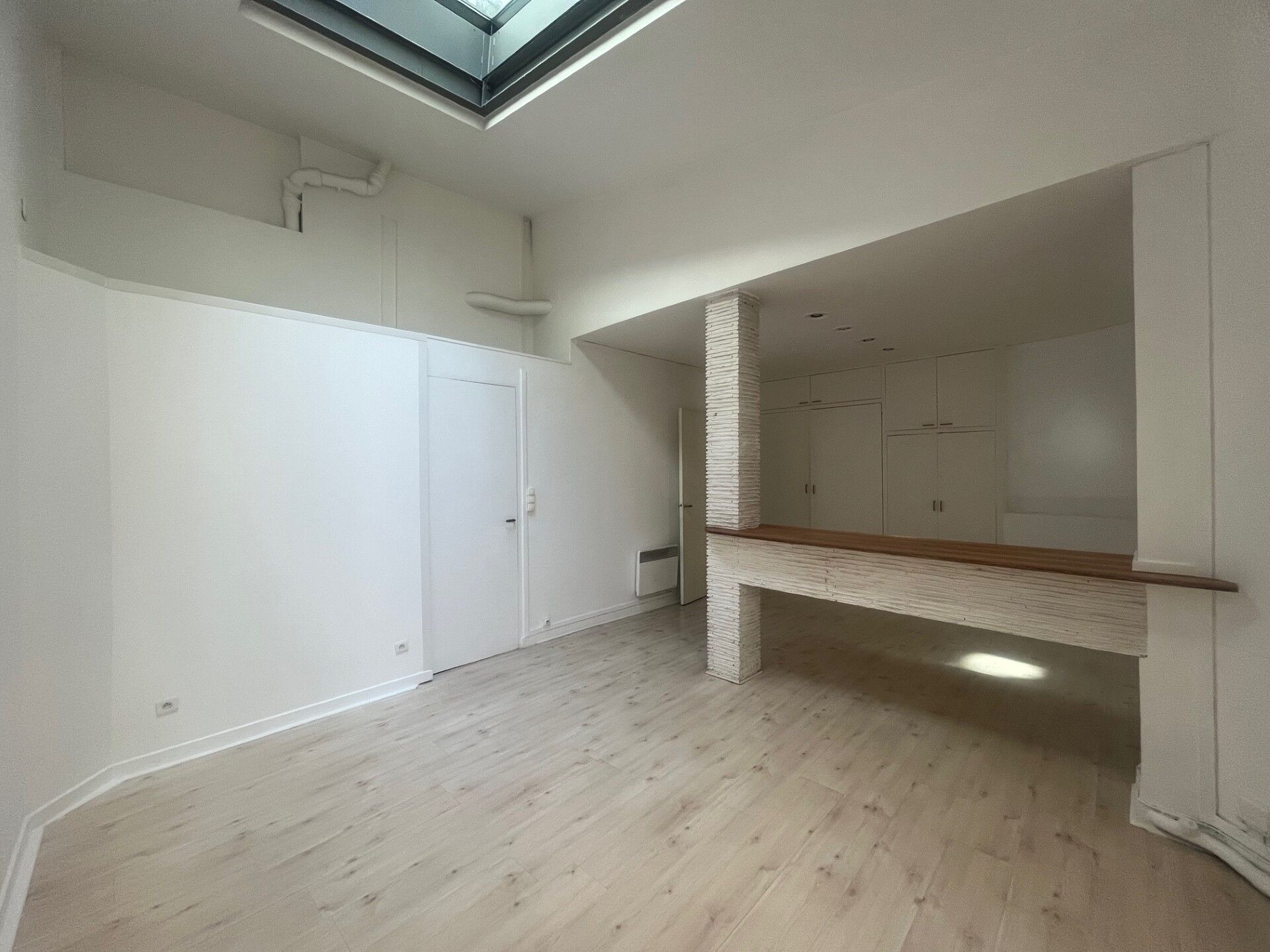 Il se compose d'une entrée avec rangements, d'une pièce de vie bénéficiant d'une belle hauteur sous plafond et d'une verrière apportant un éclairage zénithal en complément de la fenêtre, d'une petite cuisine séparée, ainsi que d'une salle d'eau avec WC.
