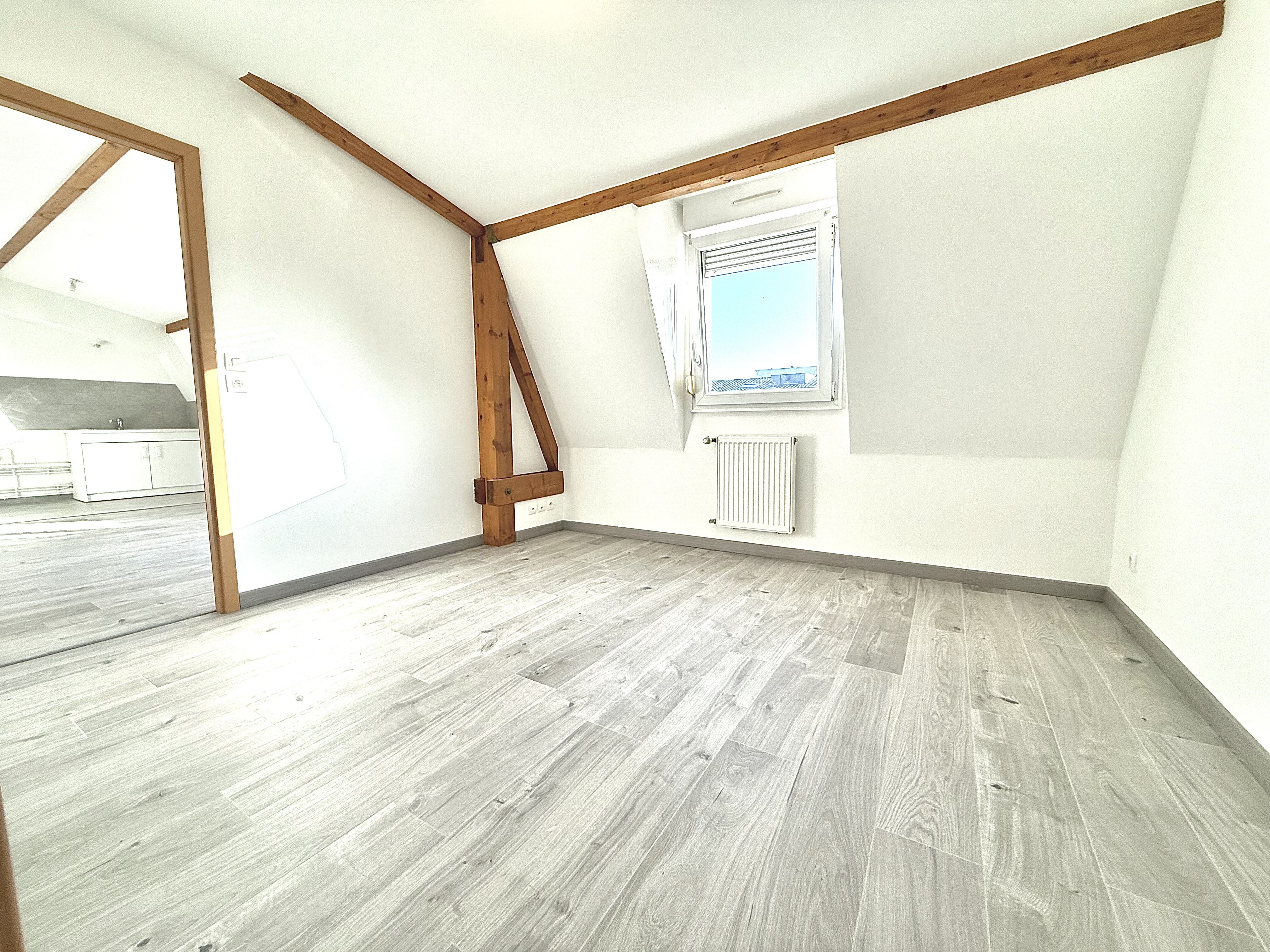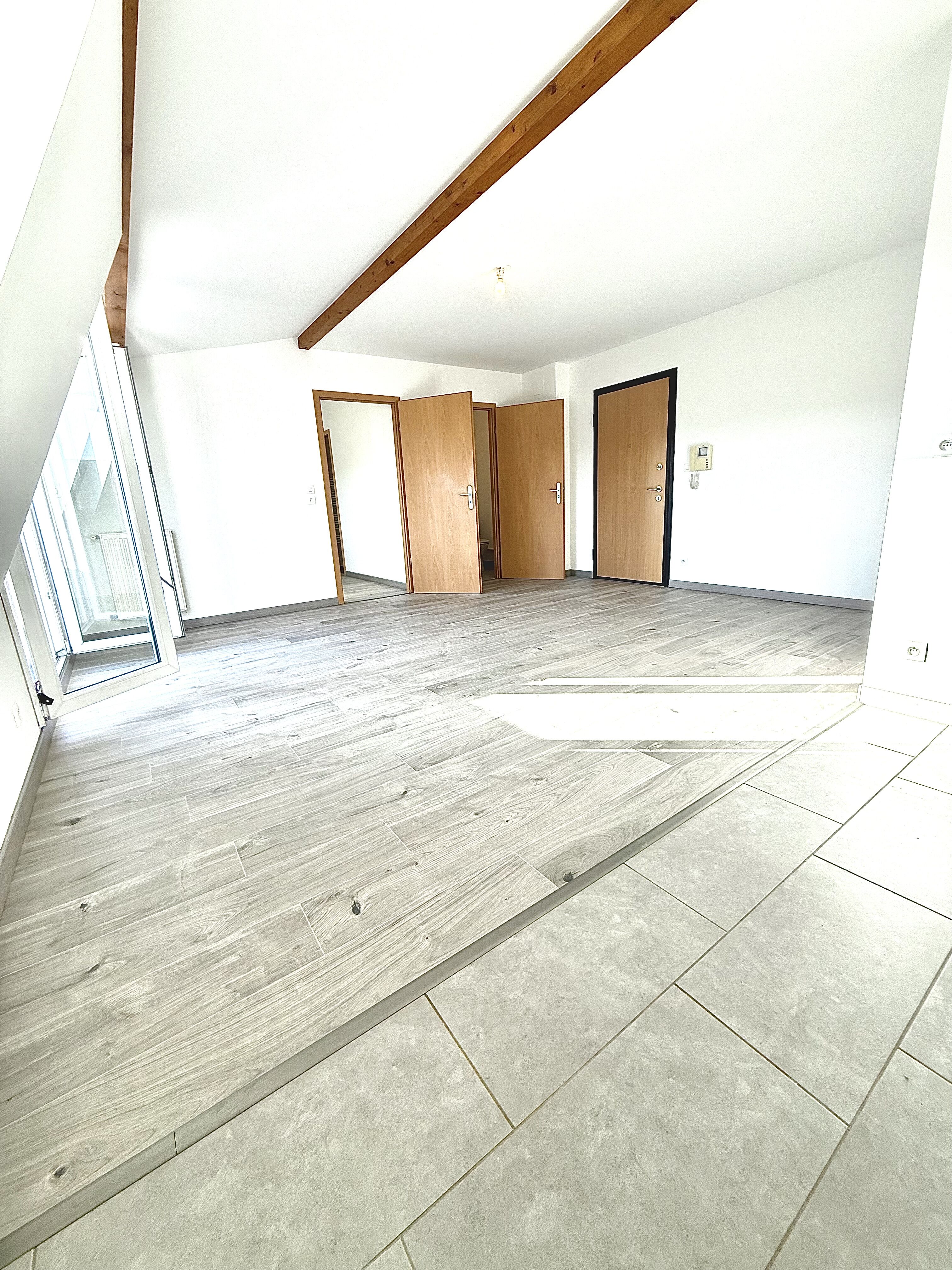 Cuisine carrelée ( à personnaliser) ouverte sur salon parquet, surface de l'ensemble environ 26 m², accès balcon