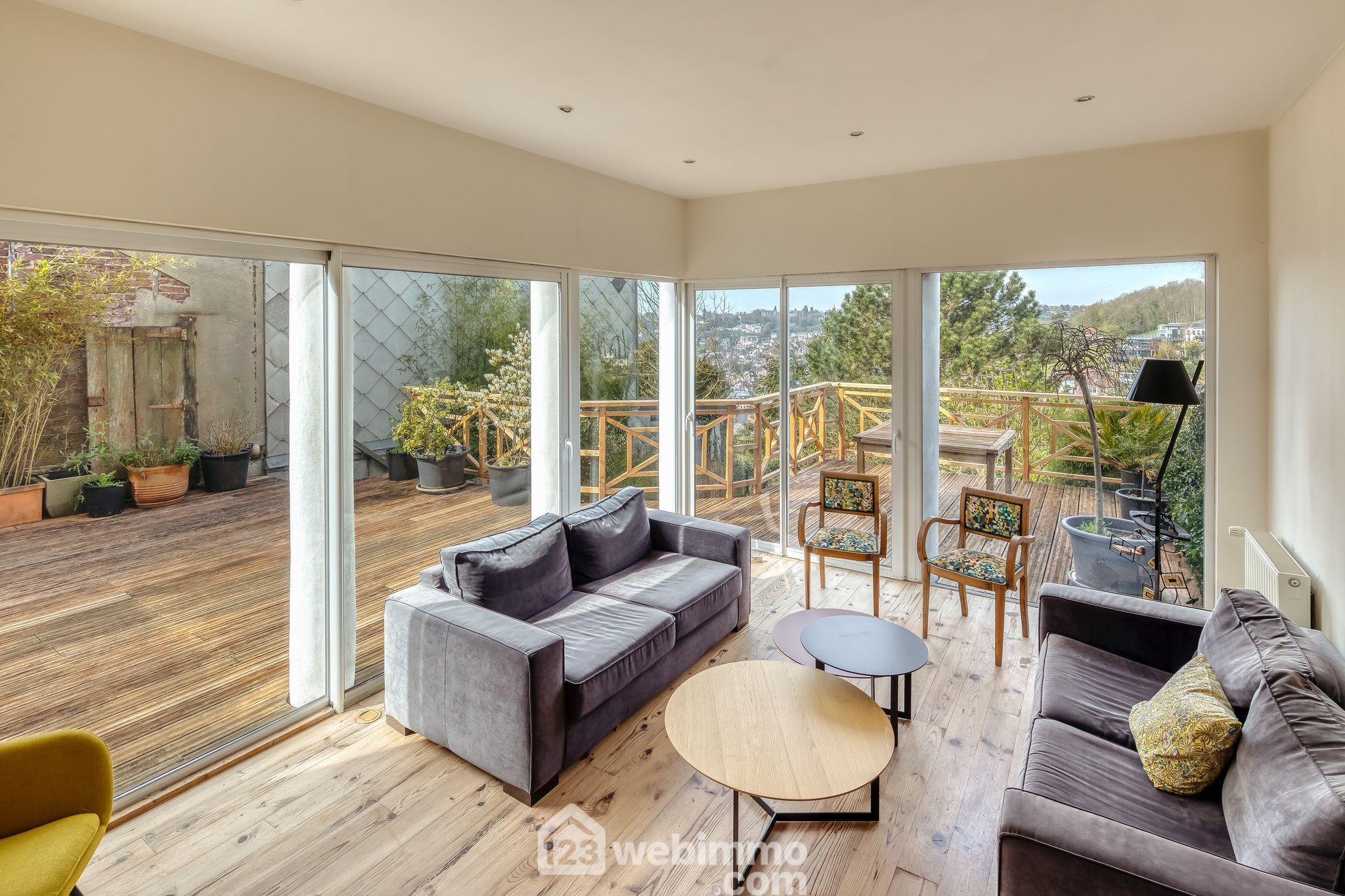 Votre agence 123webimmo vous présente : En exclusivité, découvrez cette élégante maison individuelle offrant une vue dégagée sur Rouen et le quartier Saint-André, idéalement située dans le quartier recherché du Mont-Fortin, à proximité immédiate de l'école Bernanos sur le bas de Bois Guillaume. Cette propriété séduit par sa luminosité, ses volumes harmonieux et sa vue dominante, qui lui confèrent un caractère unique. Le rez-de-chaussée s'ouvre sur une agréable première terrasse menant à l'entrée de la maison. Vous y découvrirez une cuisine indépendante, des wc ainsi qu'un bel espace de vie composé d'un séjour et d'une salle à manger baignés de lumière avec une vue sur le quartier Saint André. À l'étage, l'espace nuit propose deux chambres. L'une dispose de sa douche privative, tandis que la seconde bénéficie d'une pièce en enfilade pouvant idéalement faire office de bureau ou de dressing. Une salle de douche ainsi que des toilettes séparées complètent ce niveau. Le niveau inférieur accueille un deuxième salon chaleureux avec son mur en pierre et son accès direct à une seconde terrasse, une chambre supplémentaire, une salle de bain avec douche ainsi qu'une cave. Orientée sud-ouest, la maison profite d'une belle luminosité tout au long de la journée. Une cour permet le stationnement d'un véhicule et d'une moto. Enfin, un charmant jardin confidentiel vient parfaire ce bien rare, offrant un cadre de vie privilégié, comme un sentiment de maison de vacances à quelques minutes seulement du centre de Rouen, le bus F1 à proximité permet également de rejoindre rapidement le lycée Corneille et l'Hotel de ville de Rouen. Aucun travaux à prévoir - Classe énergétique D - Taxe foncière maitrisée 1649 ¤ Les informations sur les risques auxquels ce bien est exposé sont disponibles sur le site du gouvernement : https://www.georisques.gouv.fr.Informations LOI ALUR : Honoraires charge vendeur. (gedeon_28096_32906009)