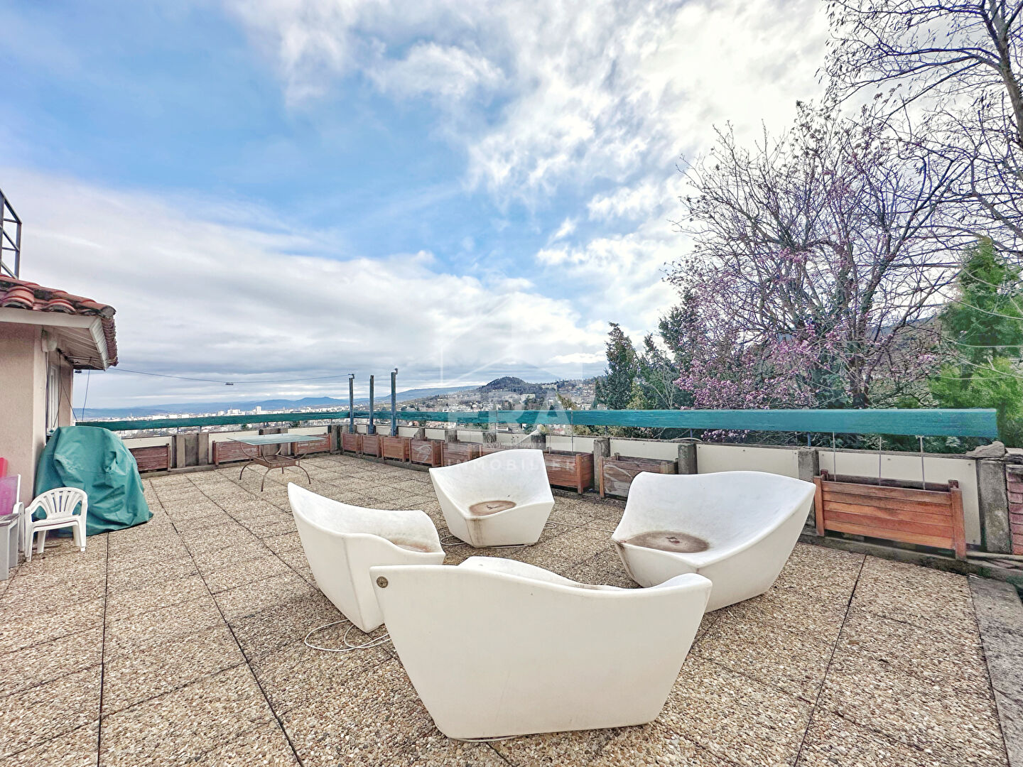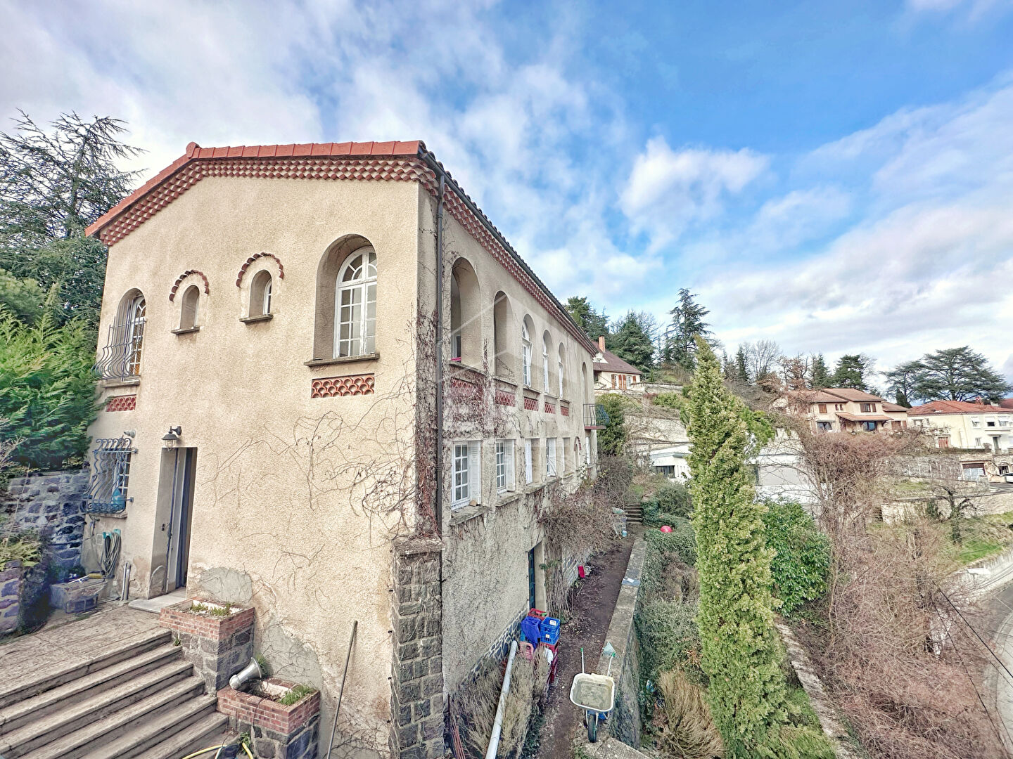 Votre agence ERA Montferrand République, spécialiste de l'immobilier du secteur, vous propose sur les hauteurs de Chamalières, quartier de l'avenue Thermale, dans un environnement résidentiel calme et particulièrement recherché, cette élégante villa de caractère de style palladien bénéficiant d'une vue panoramique exceptionnelle sur Clermont-Ferrand. Idéalement située à proximité immédiate des commodités tout en profitant d'un cadre privilégié, cette propriété rare développe environ 188 m² habitables et séduit dès l'entrée par ses volumes généreux et son cachet préservé. Vous serez charmé par les éléments anciens soigneusement conservés : parquet massif, cheminée, belles hauteurs sous plafond, fenêtres cintrées, qui confèrent à l'ensemble une véritable authenticité et un caractère unique. La maison offre un espace de vie lumineux et agréable comprenant un superbe salon avec accès direct au balcon et à la vue dégagée sur Clermont-Ferrand, une cuisine indépendante ouverte sur une salle à manger conviviale. L'espace nuit se compose de quatre chambres avec possibilité d'une cinquième, dont une suite parentale avec dressing, offrant un cadre idéal pour une vie de famille. A l'extérieur, le terrain aménagé en terrasses propose plusieurs espaces de vie distincts, parfaits pour profiter des beaux jours, ainsi qu'une agréable terrasse exposée plein Sud. Une cave et des dépendances viennent compléter ce bien, offrant des solutions de stockage ou des possibilités d'aménagement supplémentaires. Des travaux intérieurs sont à prévoir afin de révéler tout le potentiel de cette propriété et de l'adapter à vos envies. Côté technique, la maison dispose d'un chauffage au gaz avec chaudière récente, d'une climatisation ainsi que d'une toiture récemment rénovée. Un bien rare à Chamalières, alliant emplacement privilégié, vue exceptionnelle et cachet de l'ancien. (4.50 % honoraires TTC à la charge de l'acquéreur.)