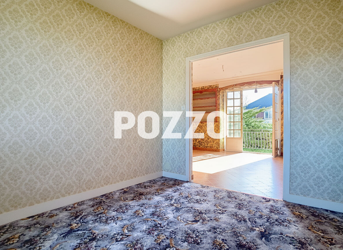 PONTORSON - A proximité des commerces : Maison sur sous-sol composée : - Au rez-de-chaussée : Entrée, séjour/salon avec balcon, cuisine aménagée, 2 chambres, salle de bains et wc. - A l'étage : 3 belles chambres, une salle d'eau avec wc. Sous-sol complet avec espace garage. Toiture isolée et tableau électrique récent.
