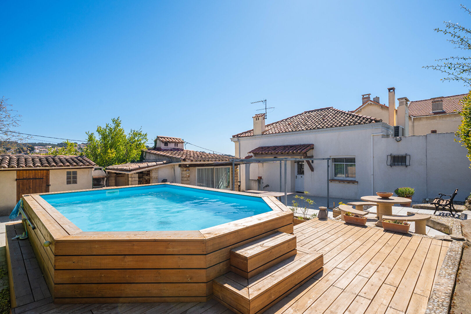 Nous vous proposons une maison située avenue de saint Antoine 13015 marseille. Sur une parcelle de 1000m2, vous découvrirez, en rdc, un grand garage, pouvant être aménagé, d environ 65m2 avec une salle d eau et un wc séparé. Au 1er étage avec une superficie d environ 120m2 composé d une entrée, une cuisine indépendante, une salle à manger s ouvrant sur une terrasse, un salon avec cheminée ouvrant sur une autre terrasse, une première chambre avec salle d eau, deux autres chambres partageant une deuxième salle d eau et un wc séparé. Sur le terrain, une dépendance avec cuisine d été, une grande piscine hors sol, et un stationnement pour environ 8/9 voitures. Maison saine Grégory Doukhan (EI) Agent Commercial - Numéro RSAC : - .