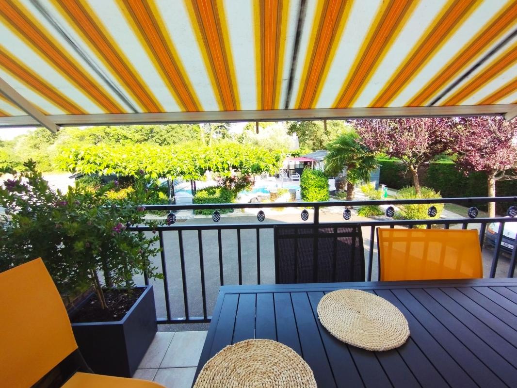 Un double accès par la cuisine et le séjour sur une terrasse surplombant la piscine.