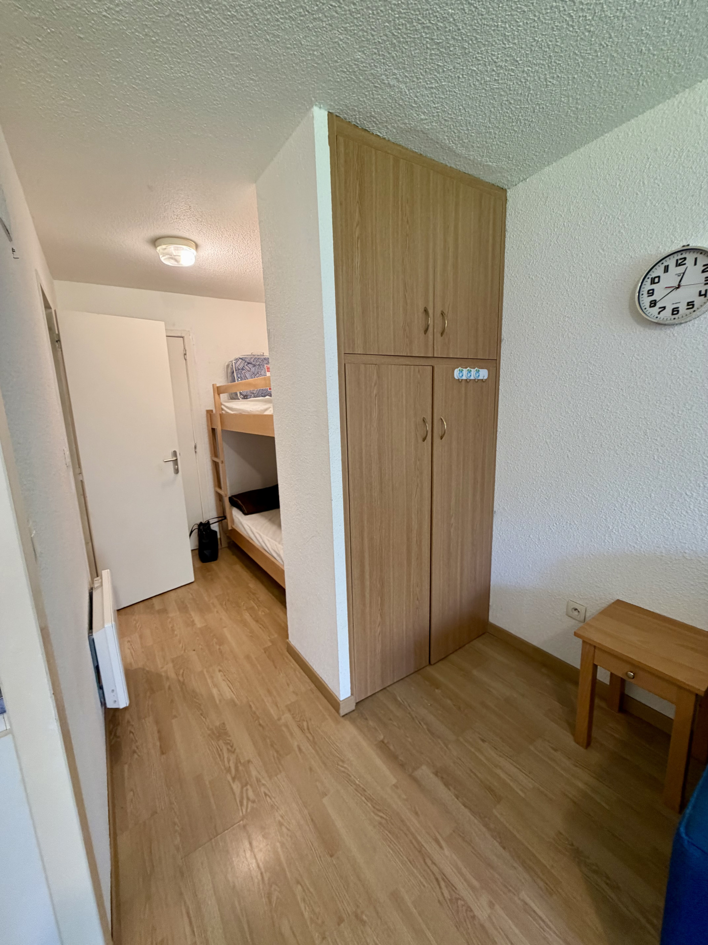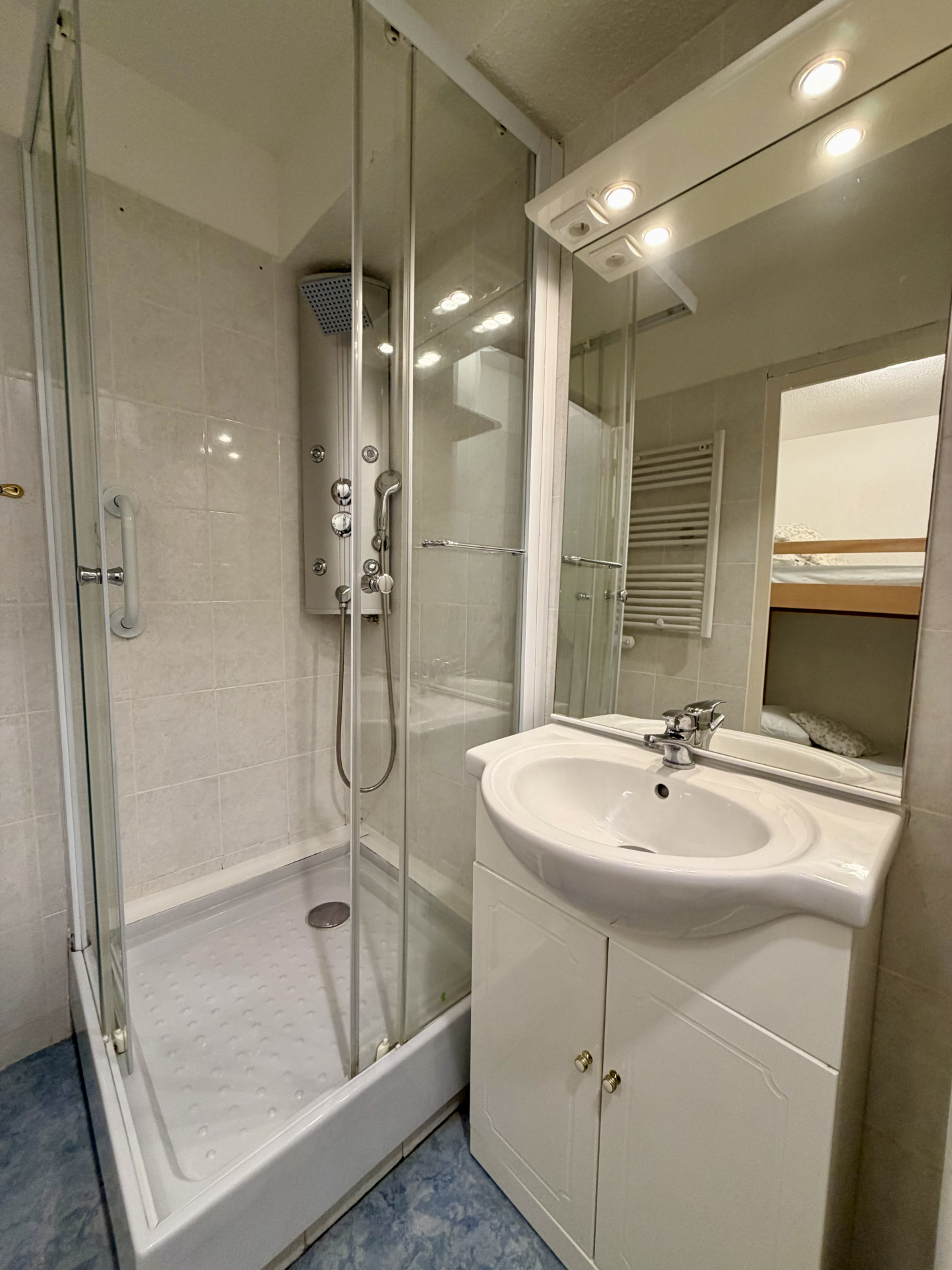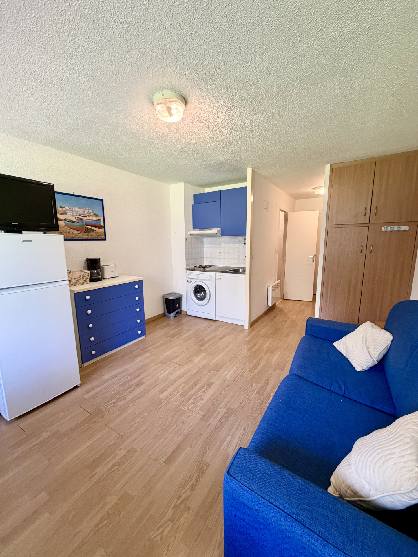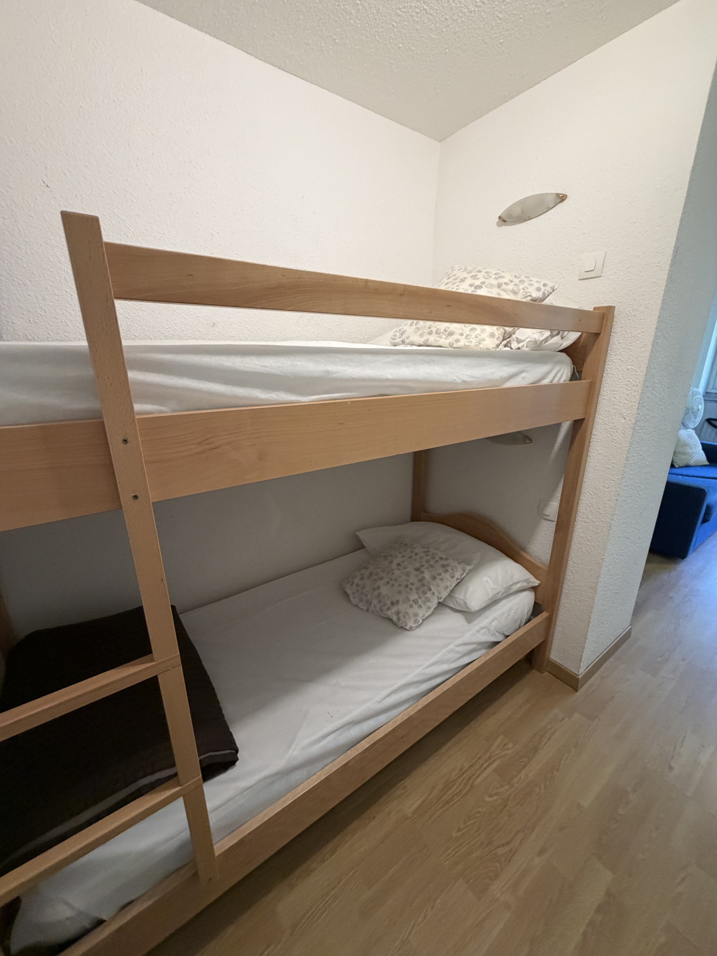 Composé d'un salon séjour avce canapé convertible , une kitchnette, un espace couchage avec 2 lits superposés, une salle d'eau WC , espace rangements.