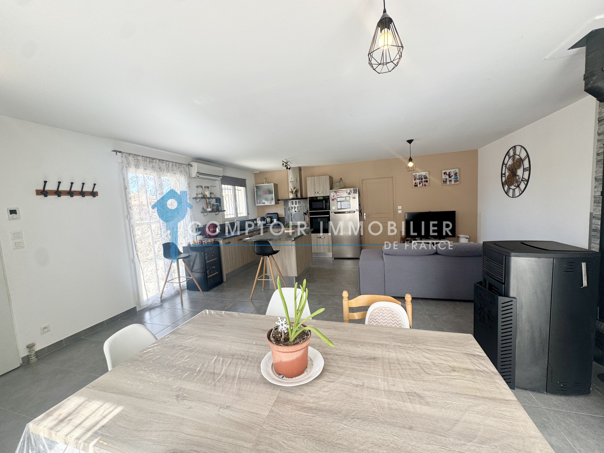 Le séjour est équipé d'un poêle à granulés ainsi que d'une climatisation réversible, pour un confort optimal en toute saison.