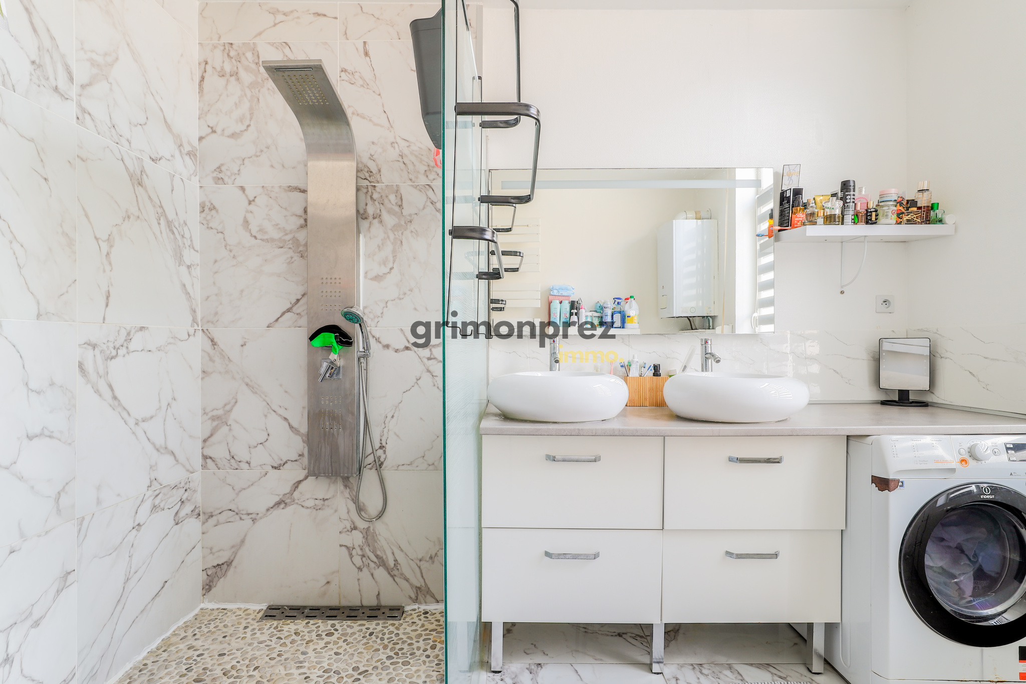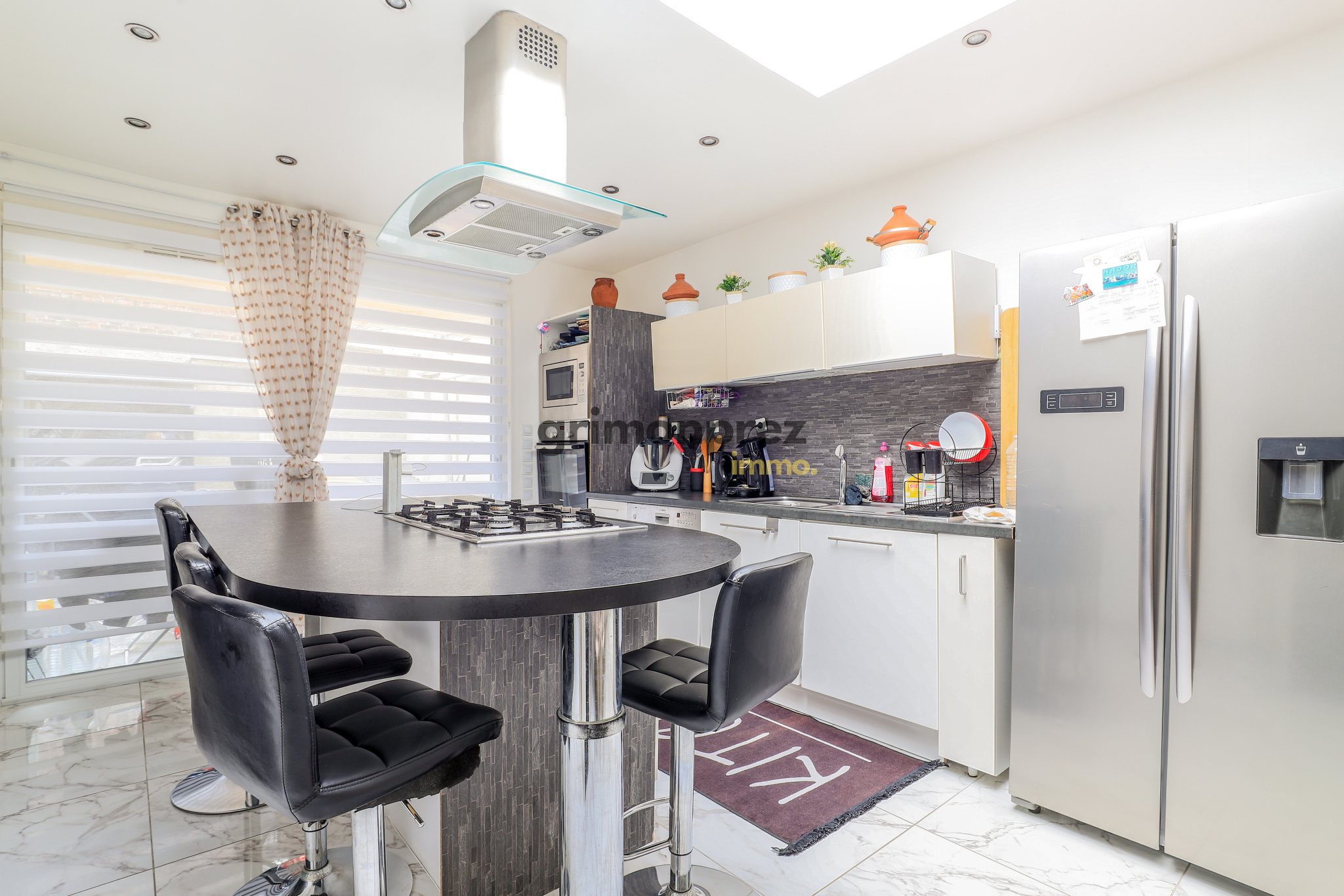 Le rez-de-chaussé vous acceuille avec un sas d'entrée pour séparer l'extérieur et l'intérieur de la maison ; Directement sur votre droite, l'unique point d'eau de la maison avec une douche à l'italienne, les WC et une double vasque parfaite pour une salle de bain familiale ; ensuite suivant une disposition classique ,en face le salon ouvert sur la salle à manger et la cuisine avec un bel ilôt central. Le rez-de-chaussé est très lumineux grâce à la présence de deux puits de lumière et puisqu'il donne sur un bel extérieur de 30m2. ( Un second accès à la maison est existant par ce même extérieur)