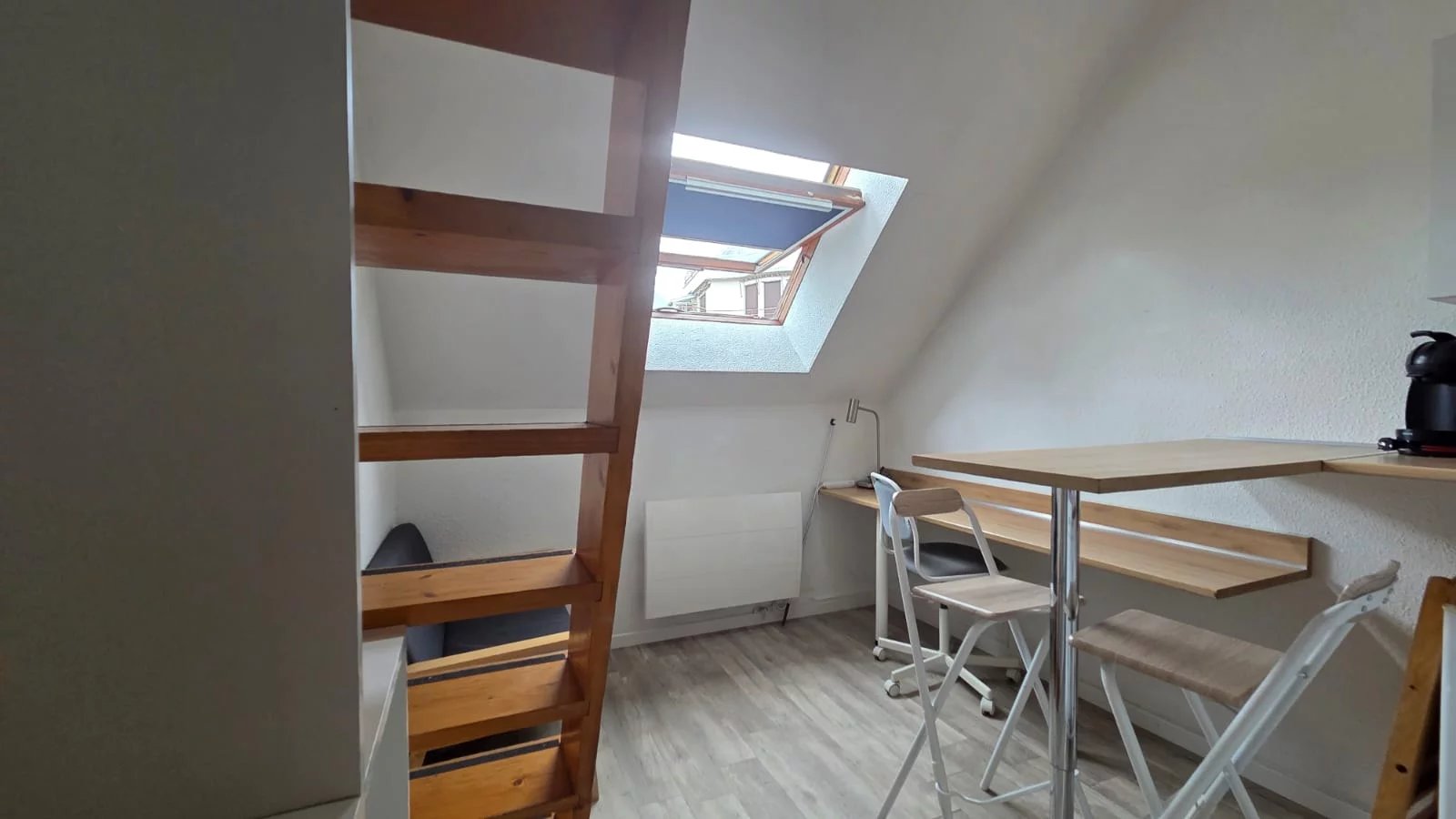 Situé au 6ᵉ et dernier étage d’un immeuble sécurisé avec ascenseur, ce studio meublé de 15.86m² avec mezzanine bénéficie d’une belle luminosité grâce à ses deux grands velux et d’une vue dégagée sur la Bastille.