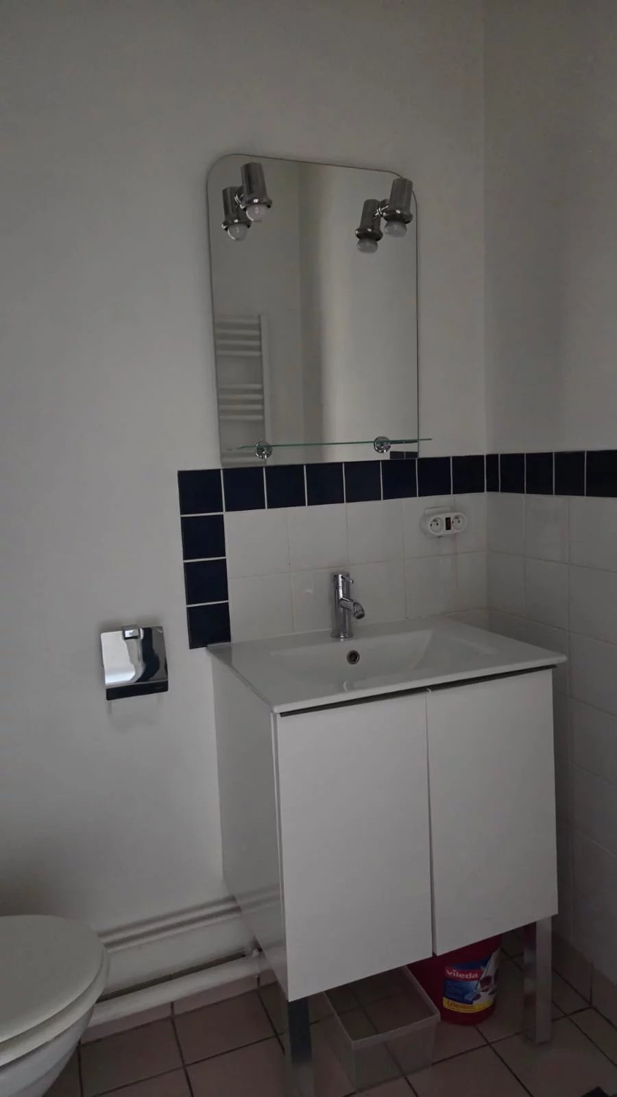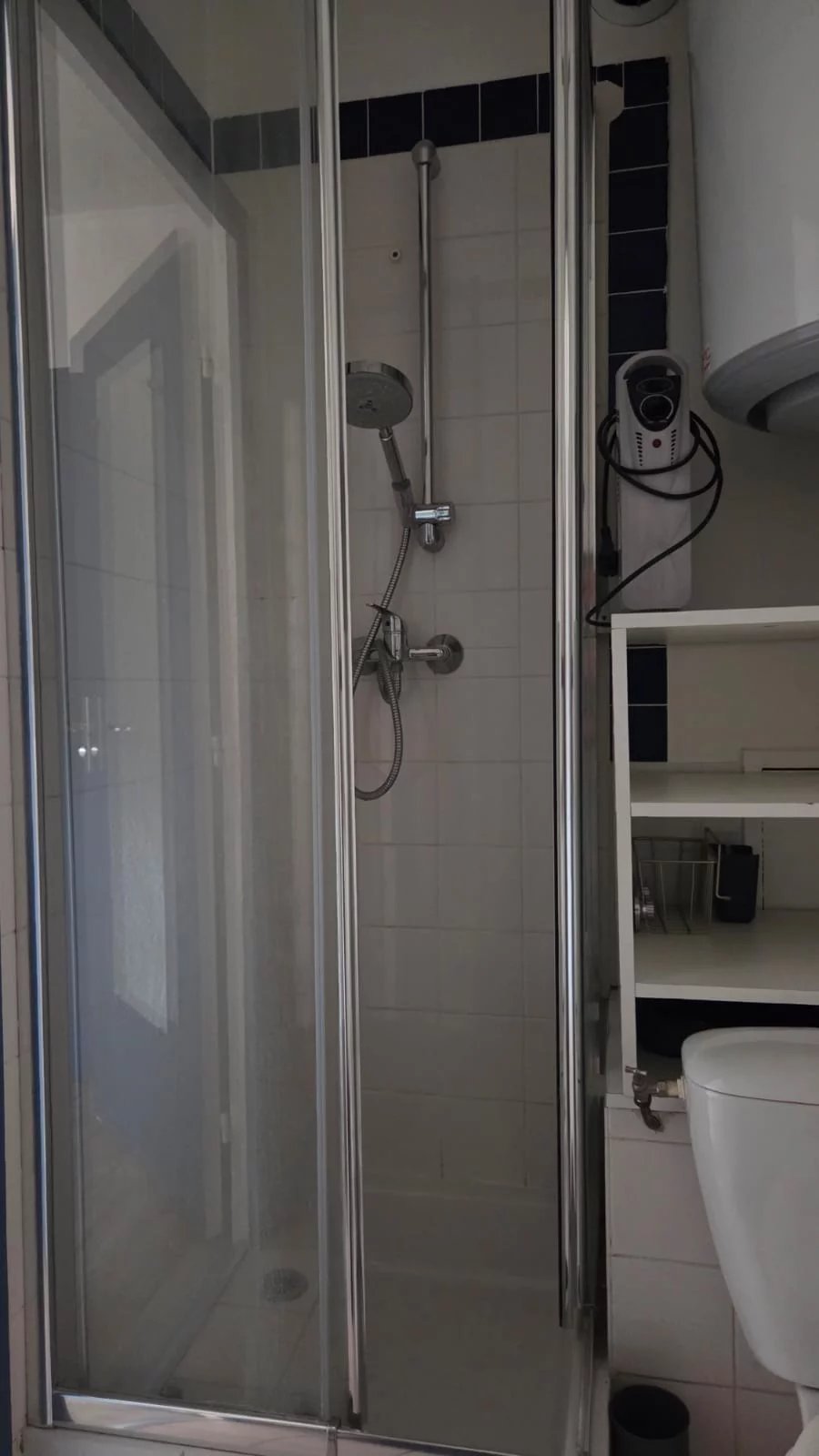 Salle d’eau avec douche, lavabo, meuble vasque et WC.