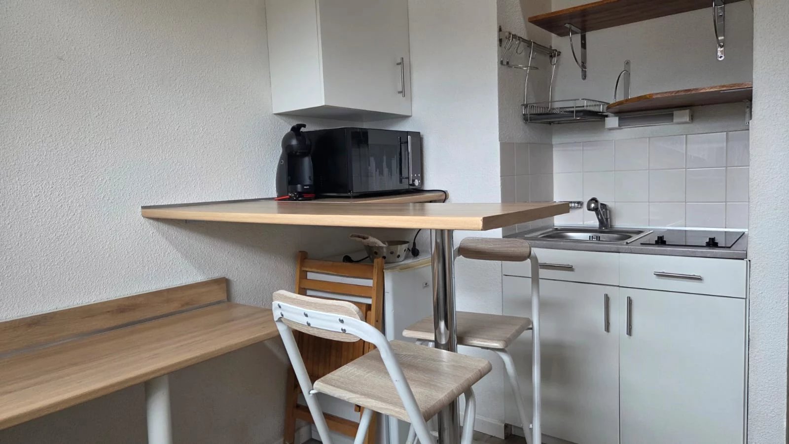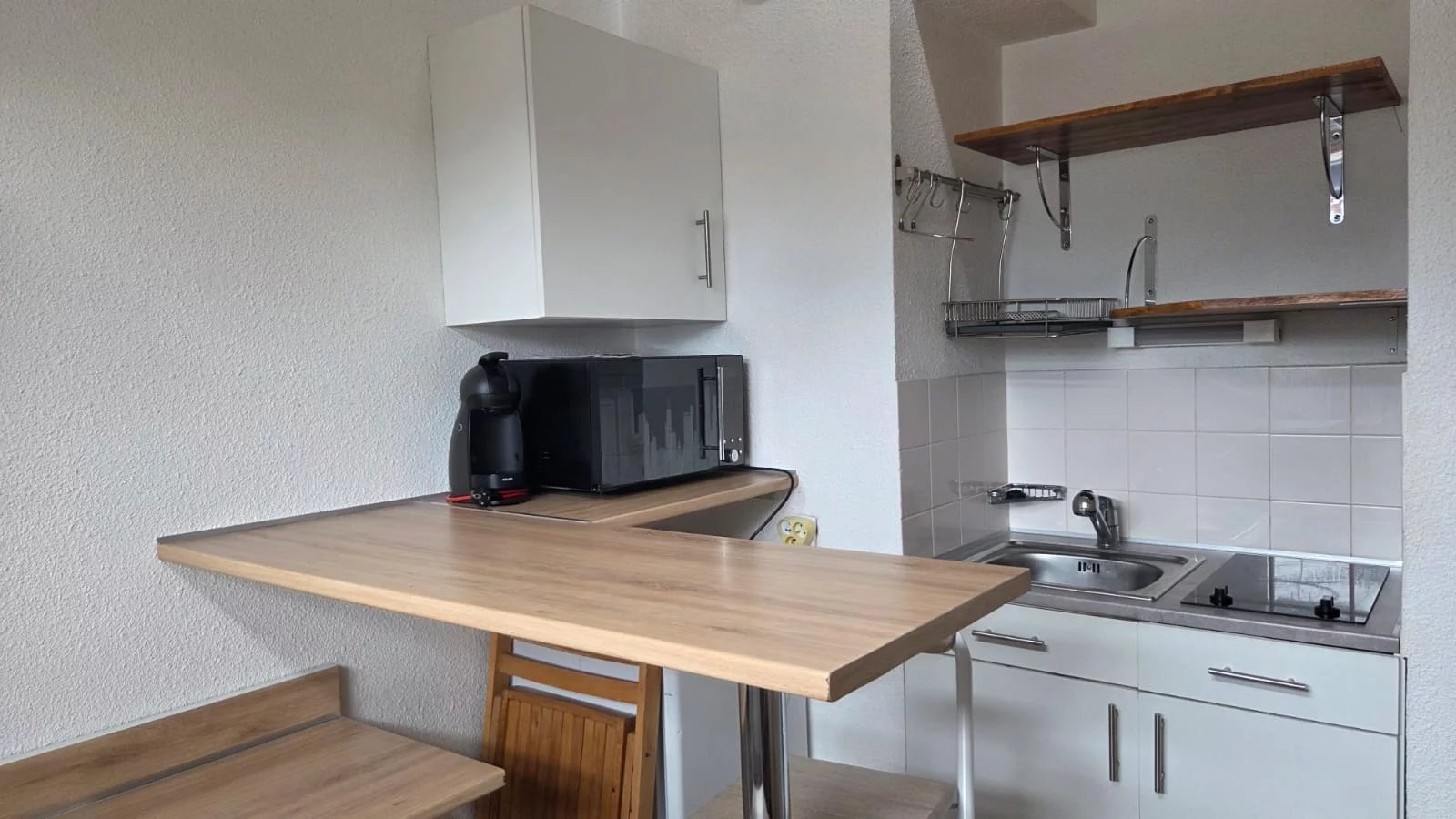 Le logement se compose d’une kitchenette équipée : évier, plaques de cuisson 2 feux, meubles de rangement, réfrigérateur, micro-ondes, vaisselles, couverts et ustensiles de cuisine, machine à café.