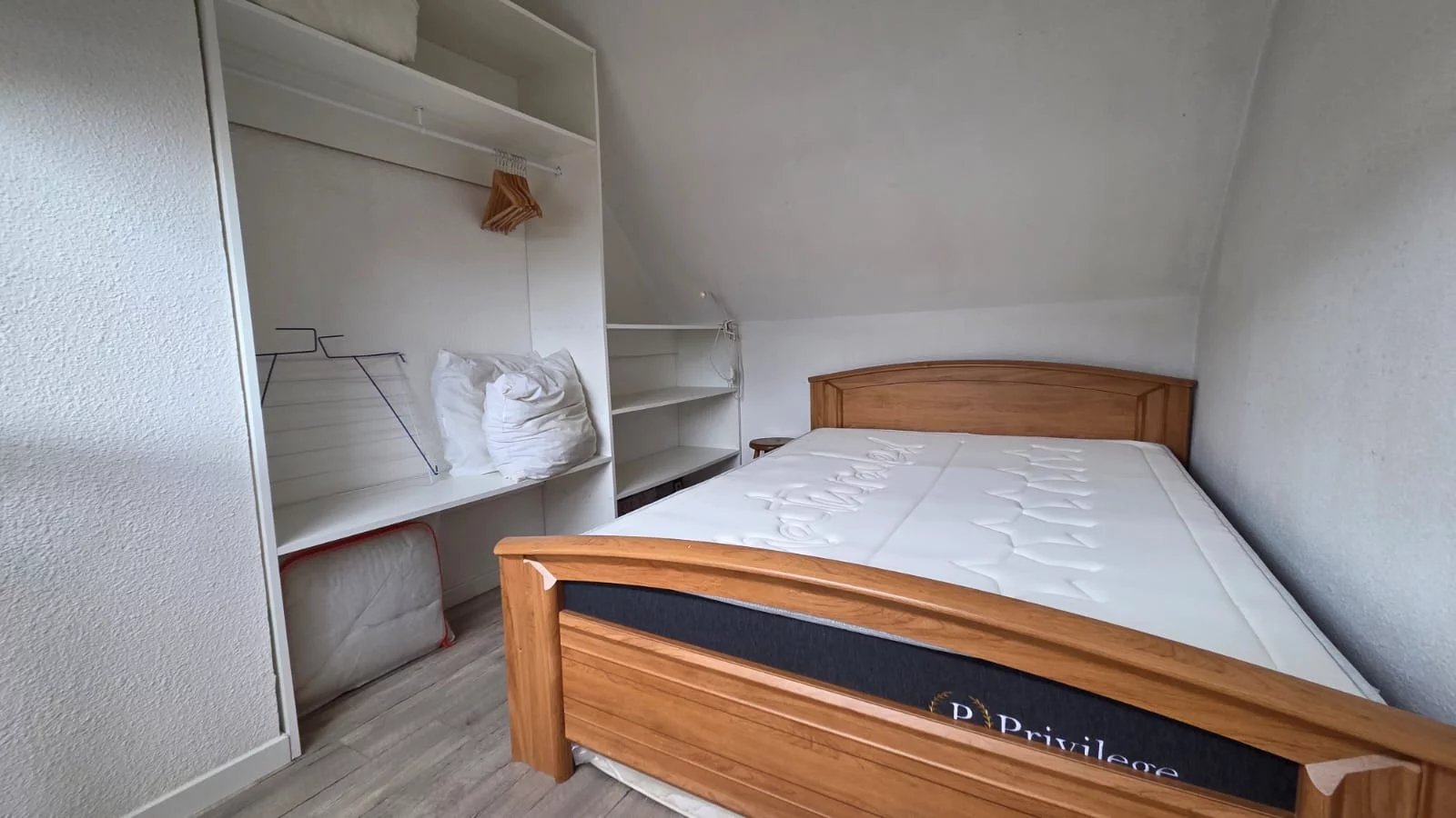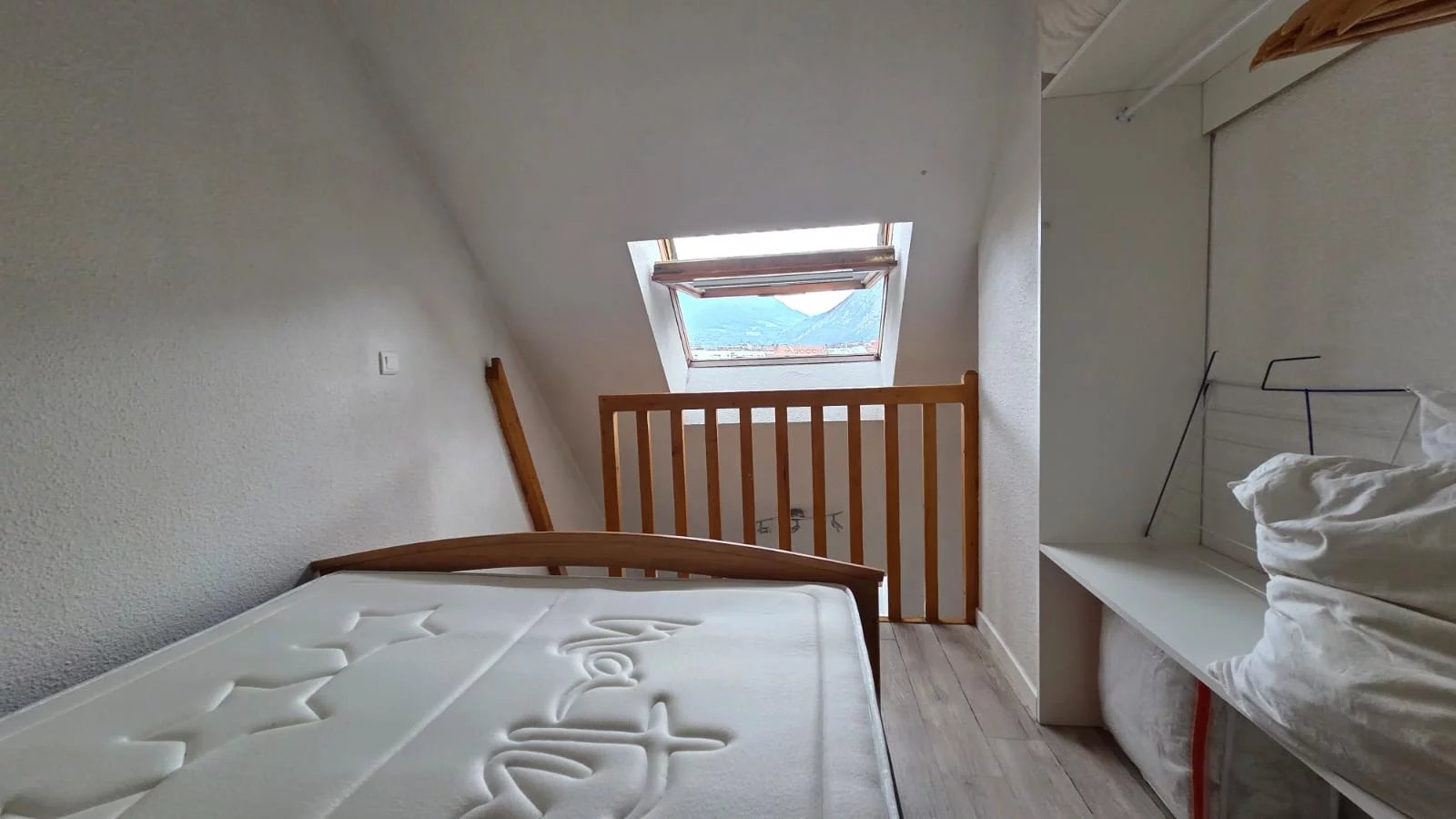 L’espace nuit sur la mezzanine comprend un lit en 140 et un placard ouvert avec de nombreux rangements. Couette et oreillers fournit.
