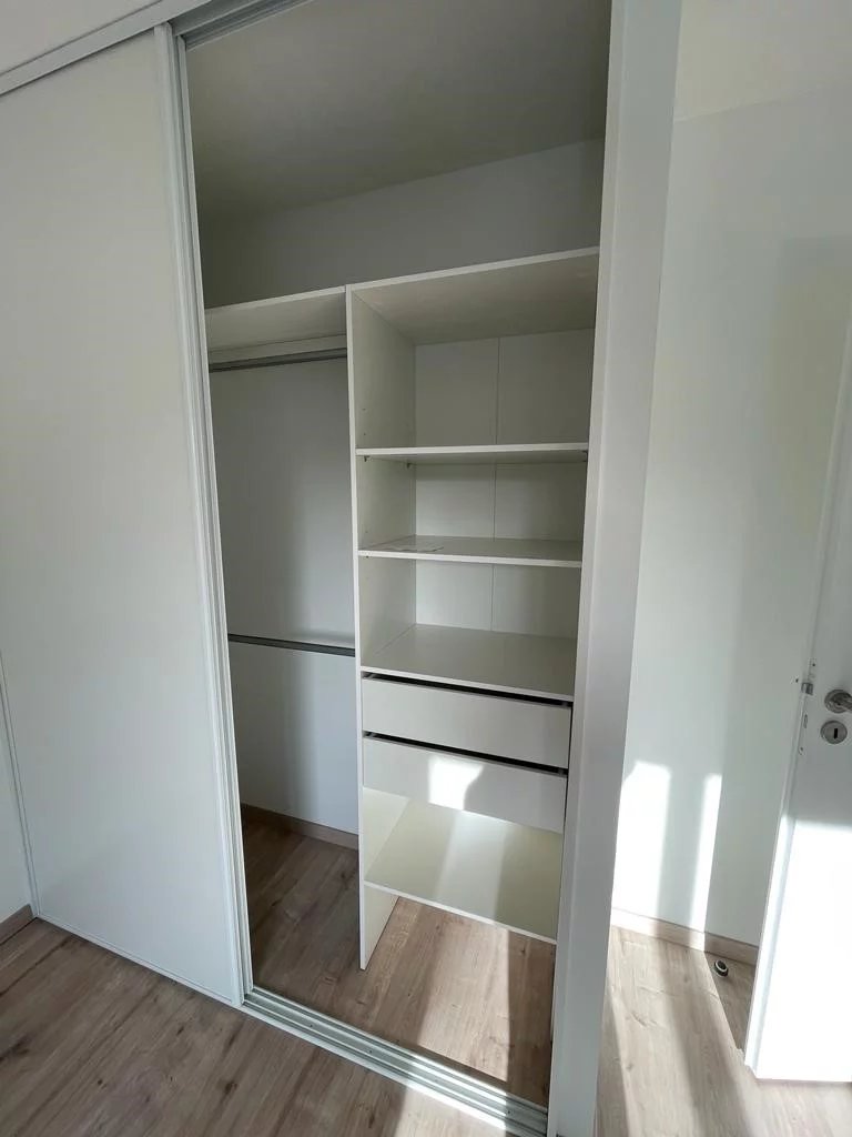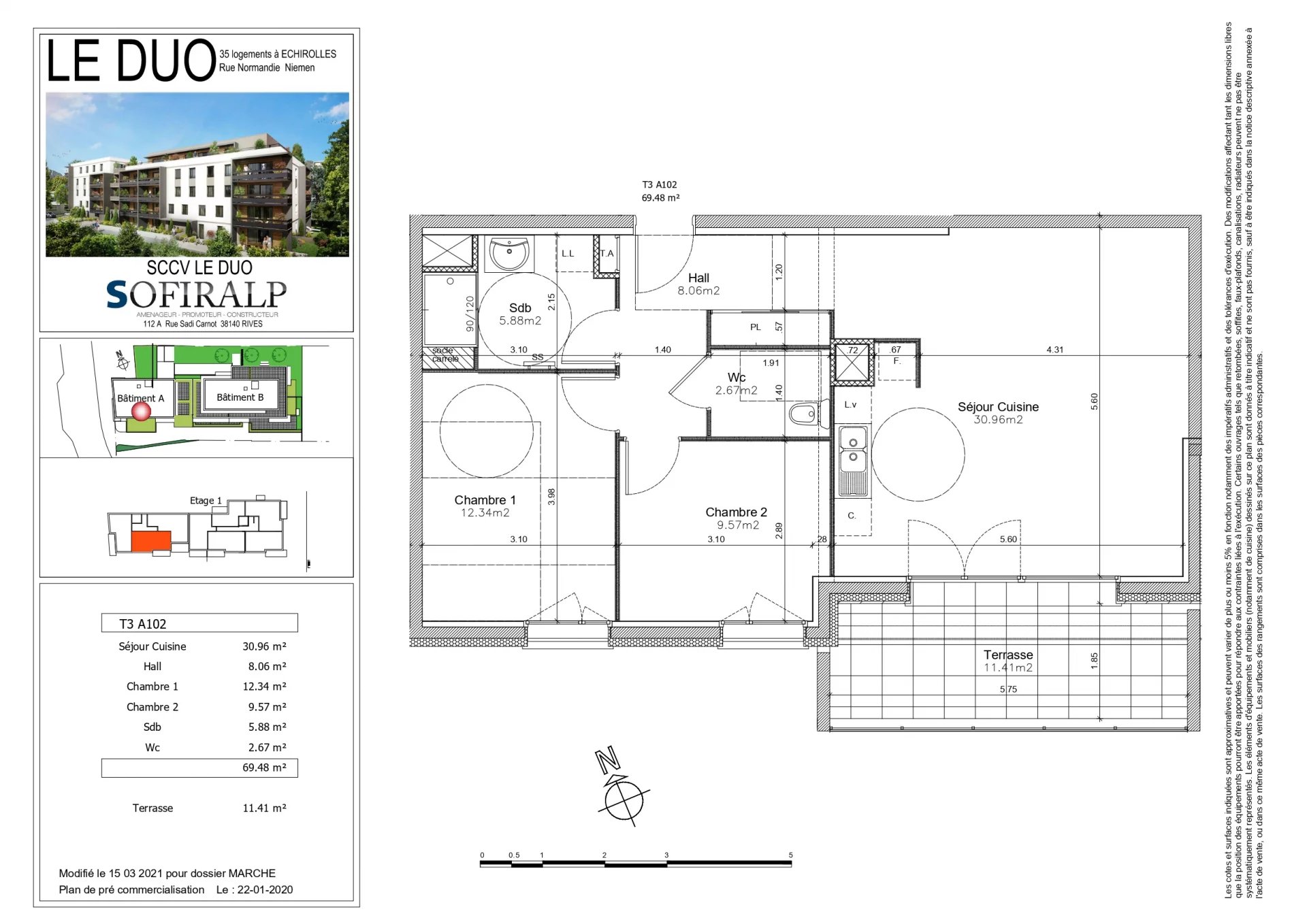 Appartement composé d’une entrée avec placard, d’un séjour/cuisine équipée de 30.96m² (meuble haut et bas, plaque de cuisson, hotte, emplacement four et emplacement lave-vaisselle) ouvrant sur la terrasse de 11.41m².