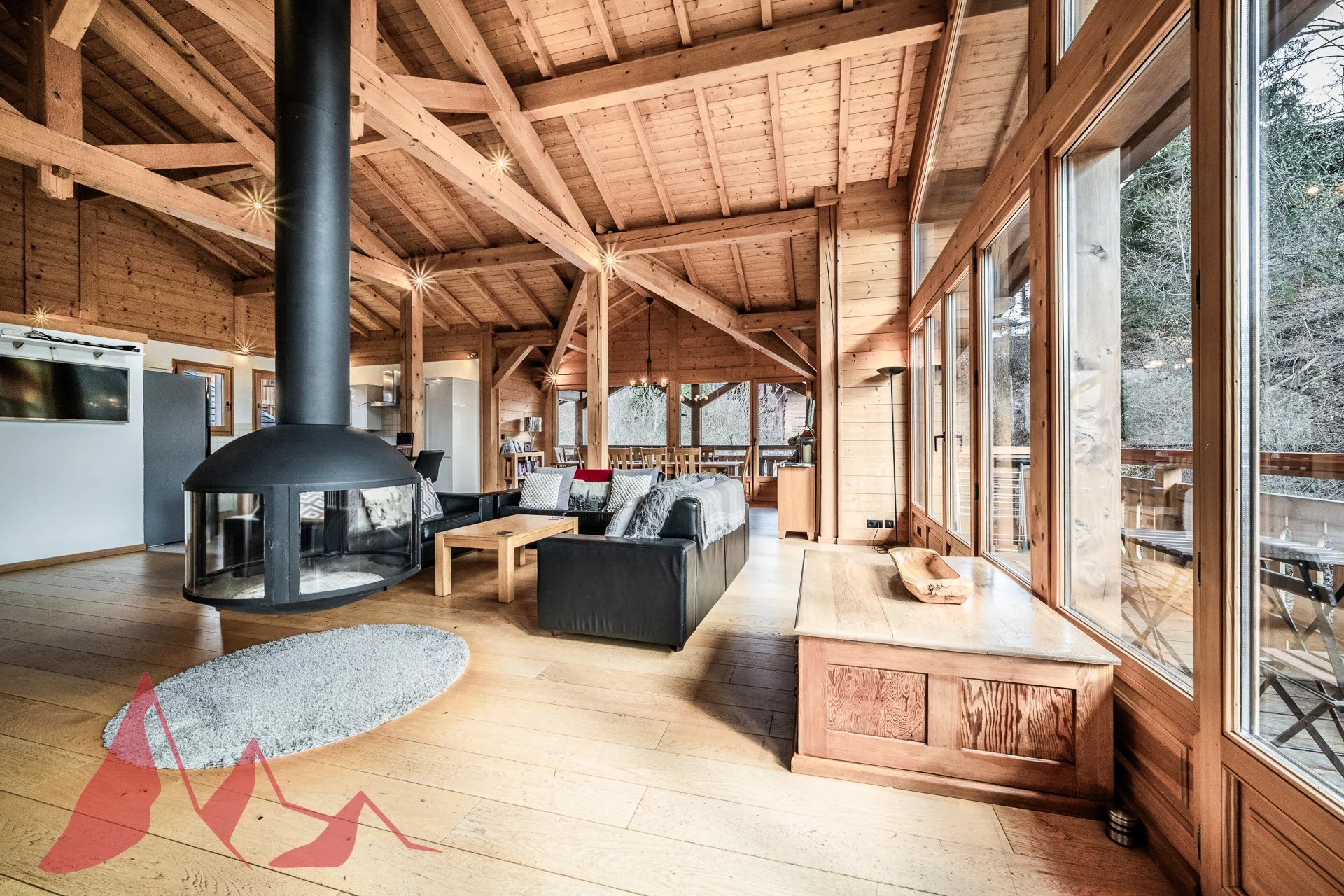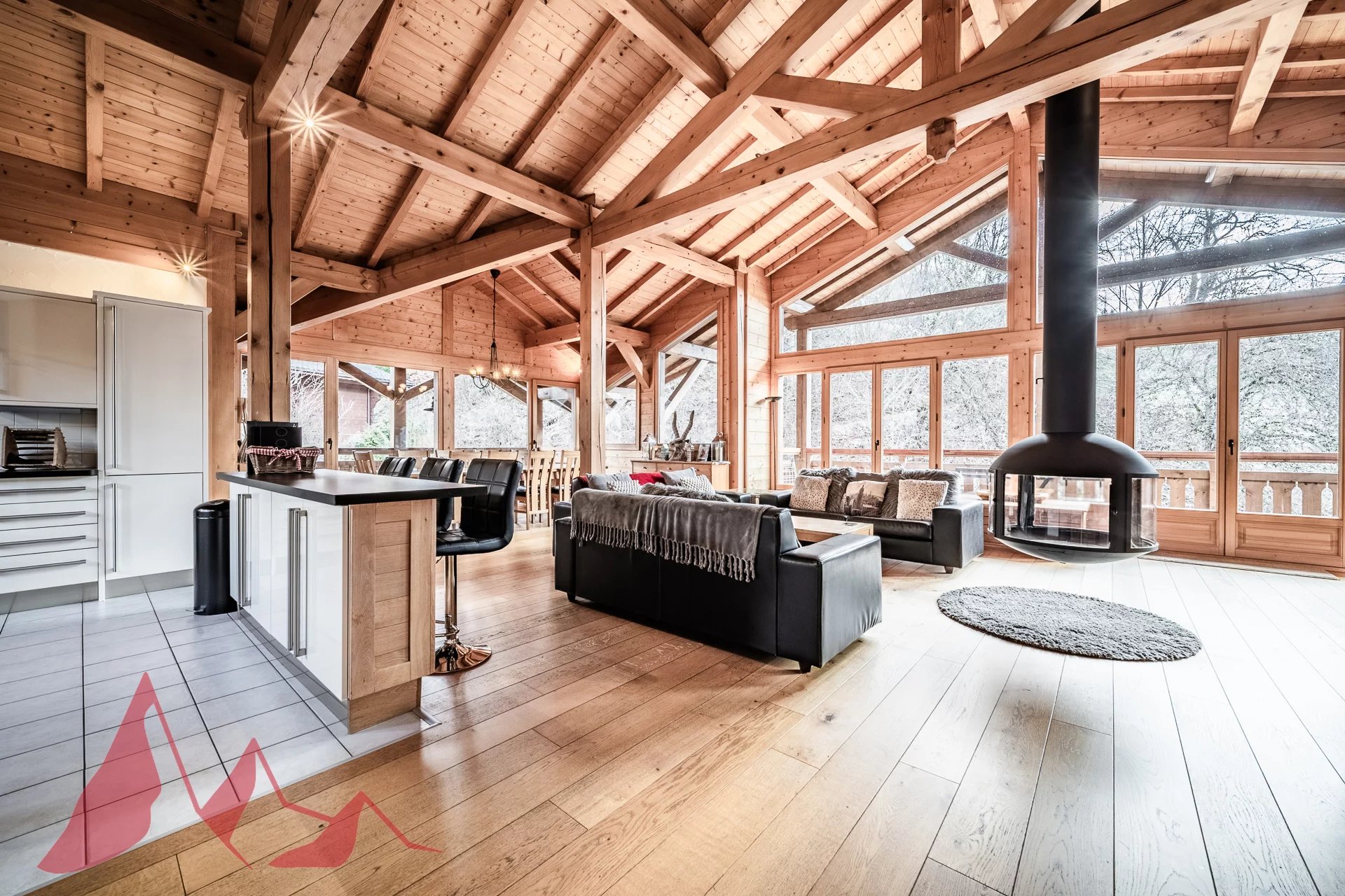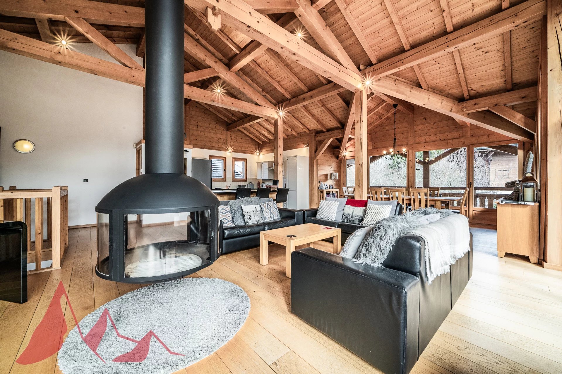 Plafonds voûtés et poêle à bois 360° : Un espace de vie époustouflant avec des hauteurs sous plafonds et un poêle à bois central, parfait pour se détendre après une journée en montagne.