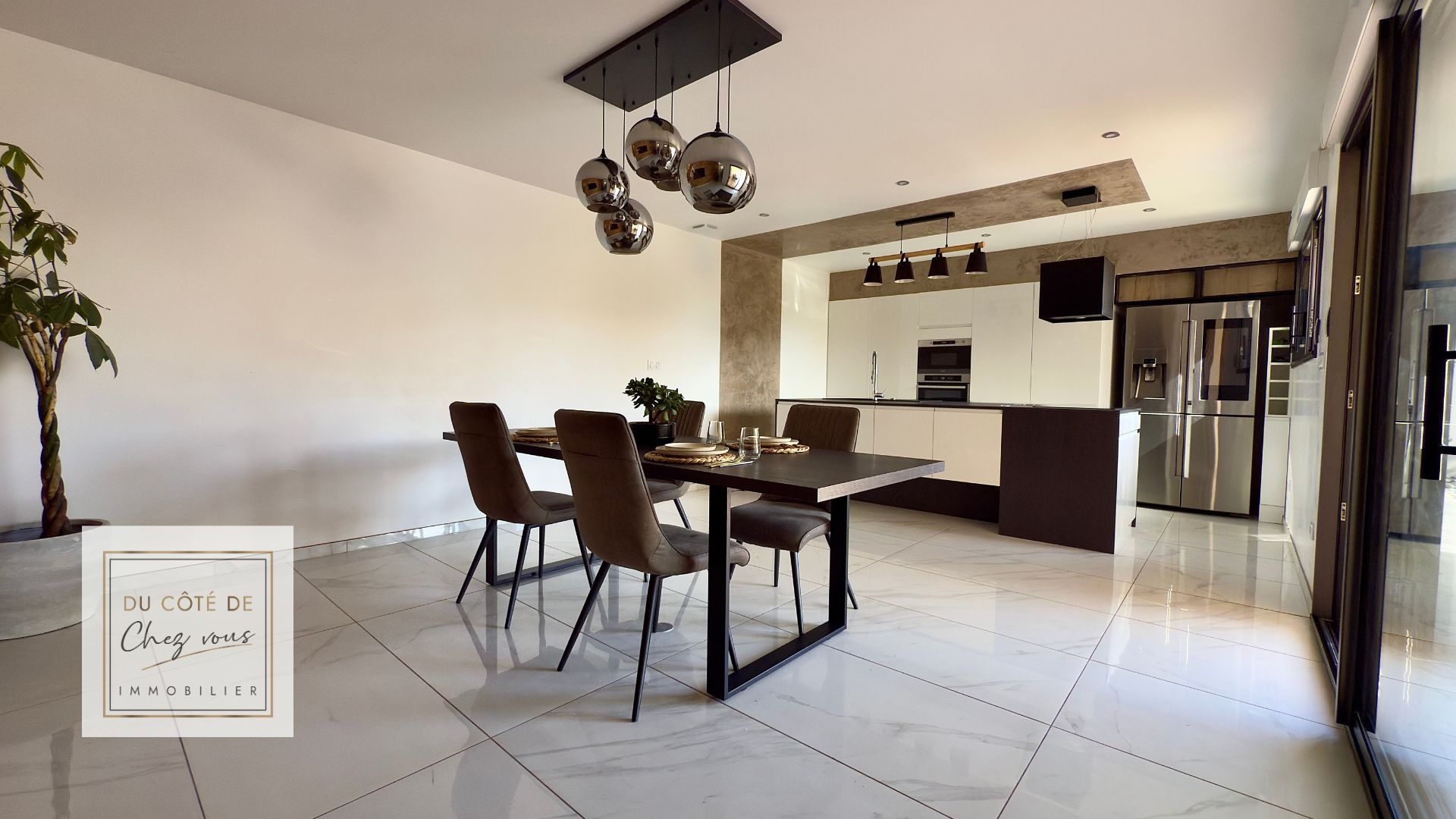 Puis viennent les espaces de vie : un séjour convivial, une salle à manger légèrement reculée, et une cuisine aux lignes épurées, aménagée et équipée, pensée pour la vie de tous les jours comme pour les grandes tablées. Détail précieux : derrière une porte dissimulée dans un meuble, se cache une arrière-cuisine complète, où tout est prévu pour cuisiner librement, sans odeur ni encombre.