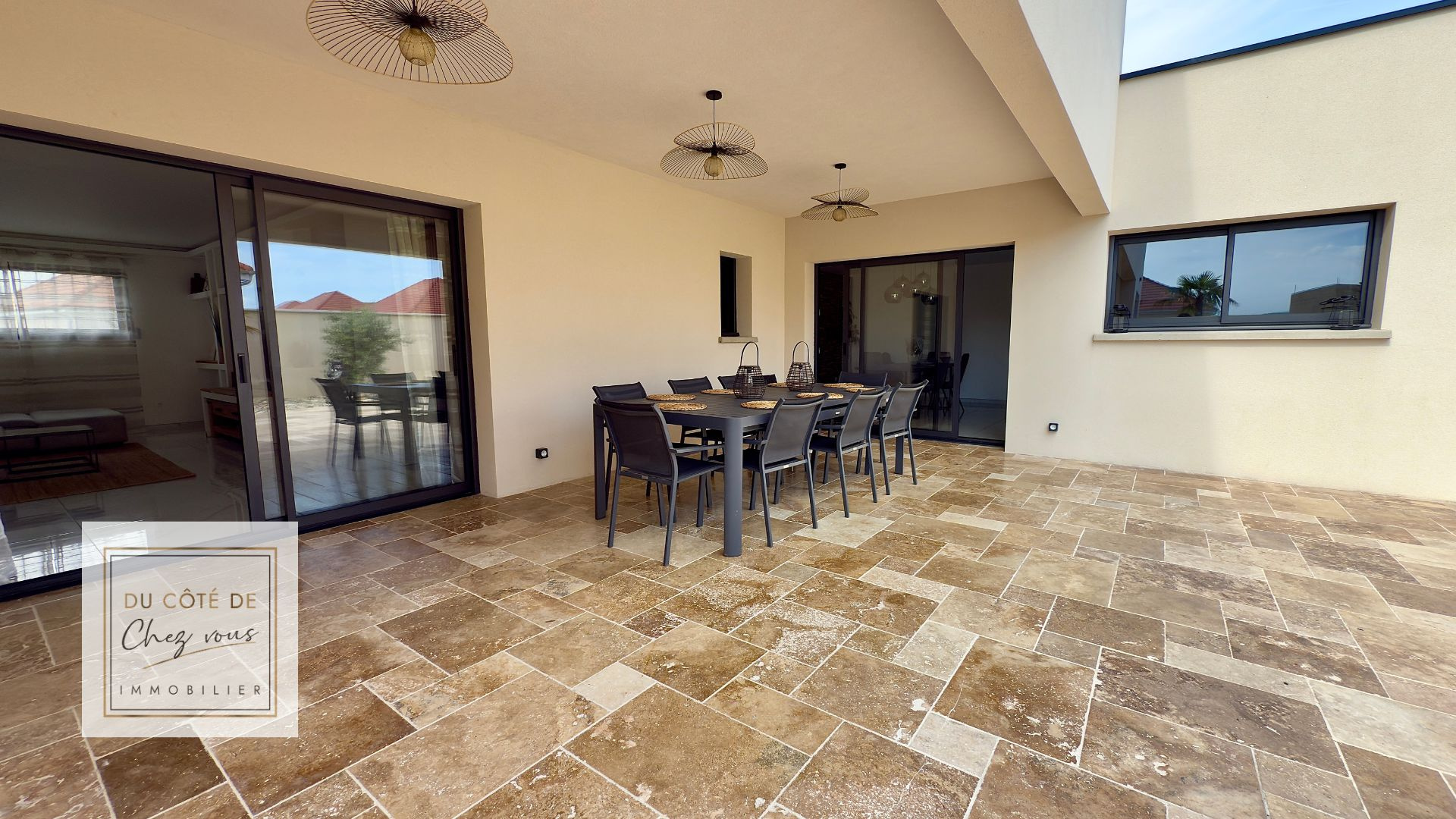 Toujours en rez-de-chaussée, une suite parentale ouvre directement, par baie vitrée en aluminium de très belle facture, sur la terrasse et la piscine. Ici, rien ne vient troubler l'intimité : les extérieurs sont sans vis-à-vis, protégés et baignés de soleil. Le travertin au sol, la piscine parfaitement intégrée, la douche et les toilettes extérieures permettent de vivre dehors, vraiment.