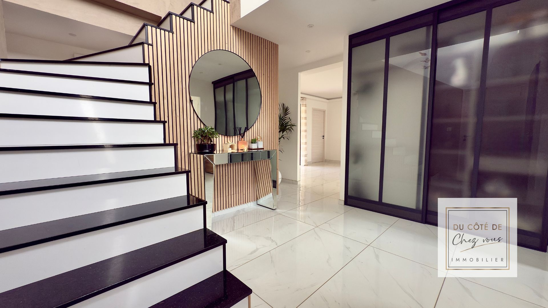 Dès l'entrée, le ton est donné : volumes impressionnants, plafond cathédrale, lumière traversante, matières sobres et chaleureuses. L'accueil est majestueux, avec placards intégrés et un espace bureau baigné de clarté.
