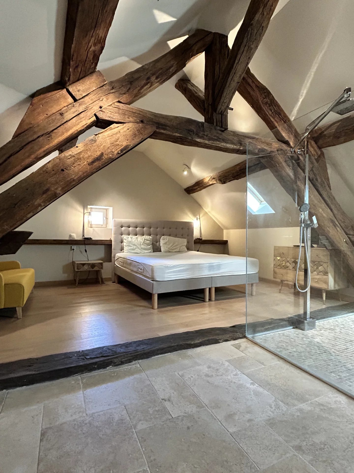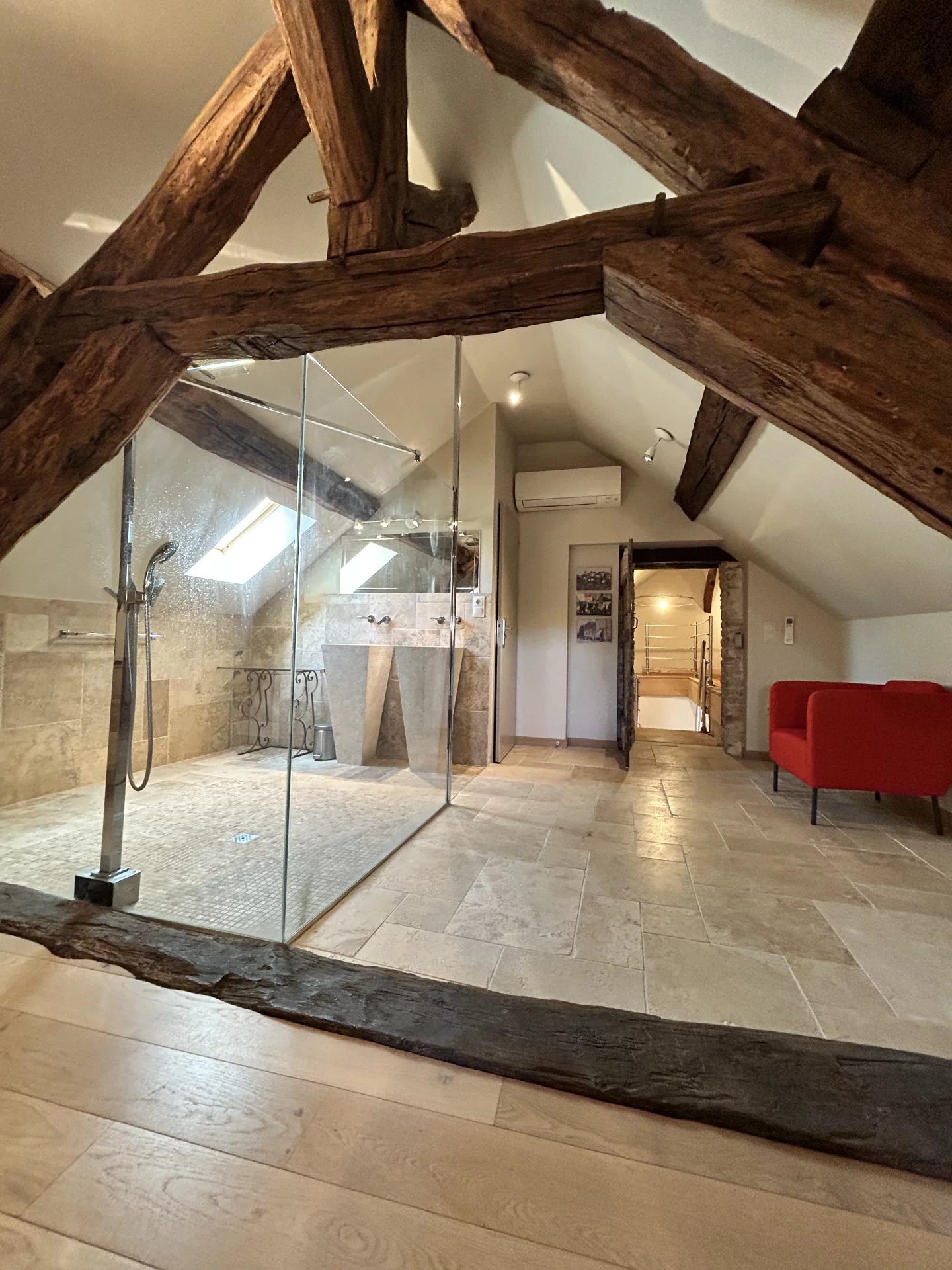 D’une surface habitable d’environ 110 m², elle séduit immédiatement par sa luminosité, ses volumes chaleureux et ses éléments de caractère : magnifiques poutres apparentes, matériaux authentiques et atmosphère pleine de cachet.