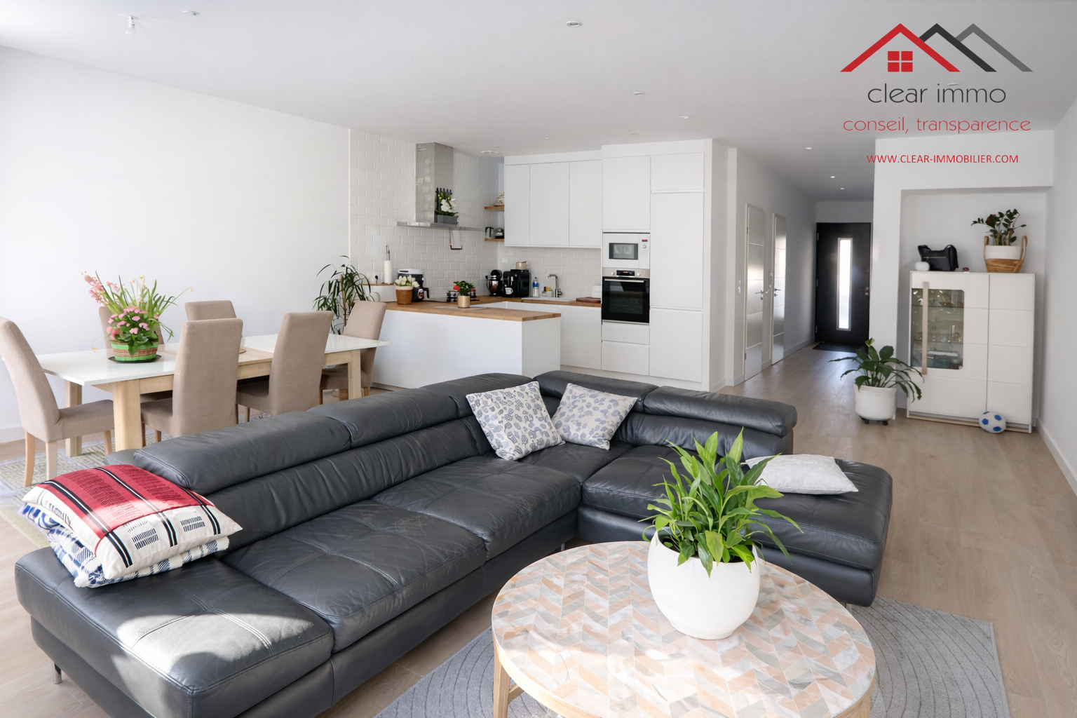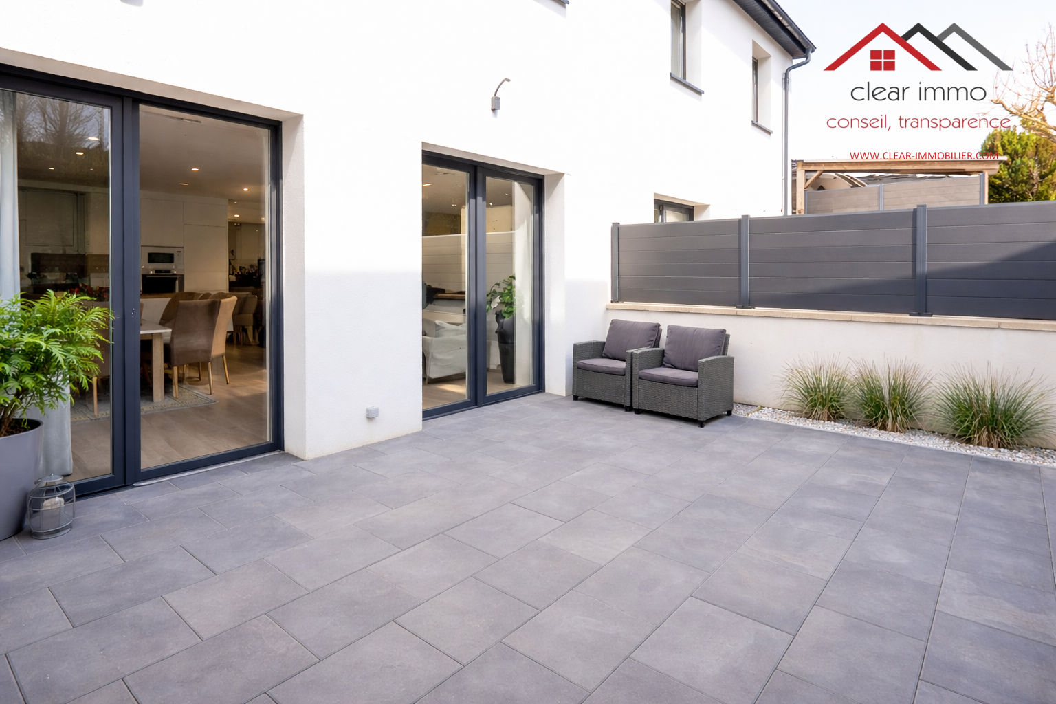 Au rez-de-chaussée :Espace de vie de 43m2 avec une cuisine équipée ouverte avec électroménager de marque Bosch (four, réfrigérateur-congélateur, hotte, lave-vaisselle, micro-ondes), donnant sur un spacieux et lumineux salon / salle à manger avec accès direct à une terrasse de 27 m2 et à un jardinet exposé sud-ouest.Un WC séparé avec lave-mains ainsi qu'un garage motorisé de 17,5 m2 complètent ce niveau.