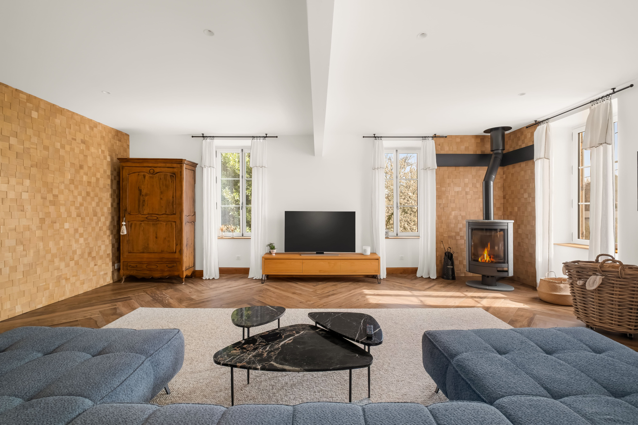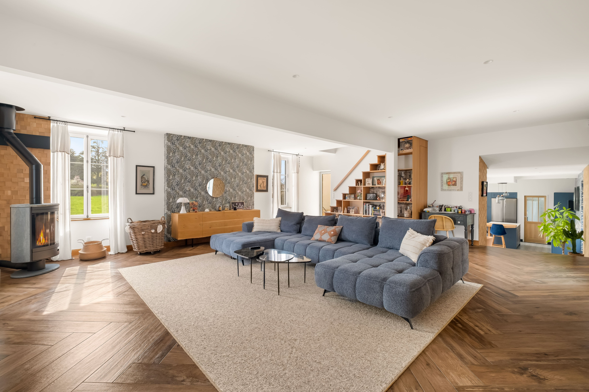 Dès l'entrée, vous serez séduits par une belle et spacieuse cuisine dînatoire équipée d'un poêle à granulés, idéale pour des moments de convivialité. Une arrière-cuisine avec un coin buanderie, des rangements, un WC ainsi qu'un chaleureux salon avec son poêle à bois complètent ce niveau.