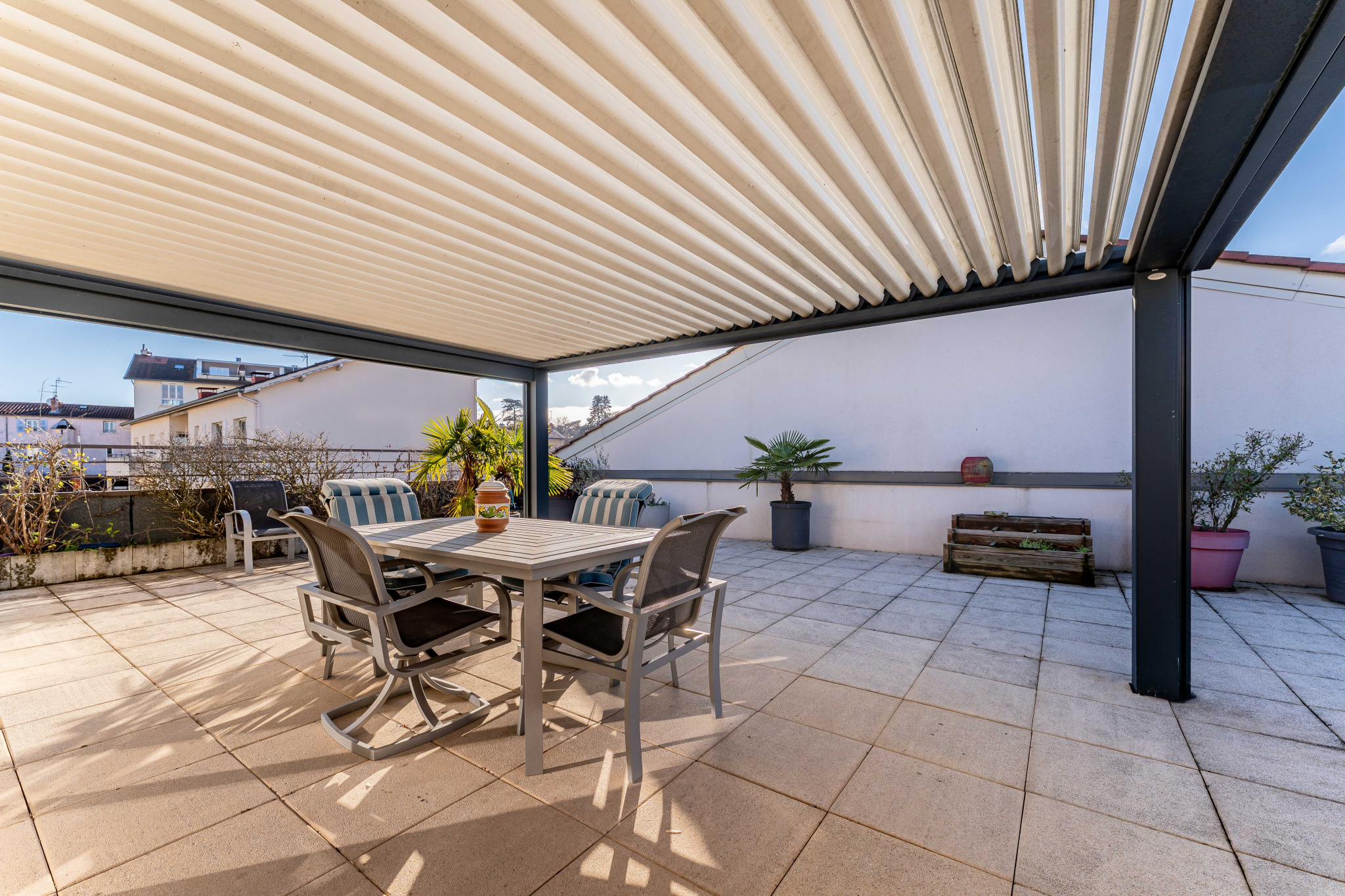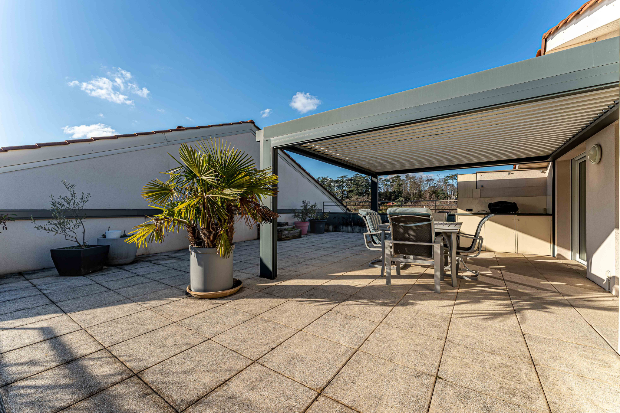 À l'étage, place à un vaste espace de vie lumineux, parfaitement pensé pour la vie de famille : Grande cuisine aménagée avec îlot central Salon / salle à manger avec rangements Accès direct à une exceptionnelle terrasse plein ciel de 87 m2, équipée d'une pergola bioclimatique