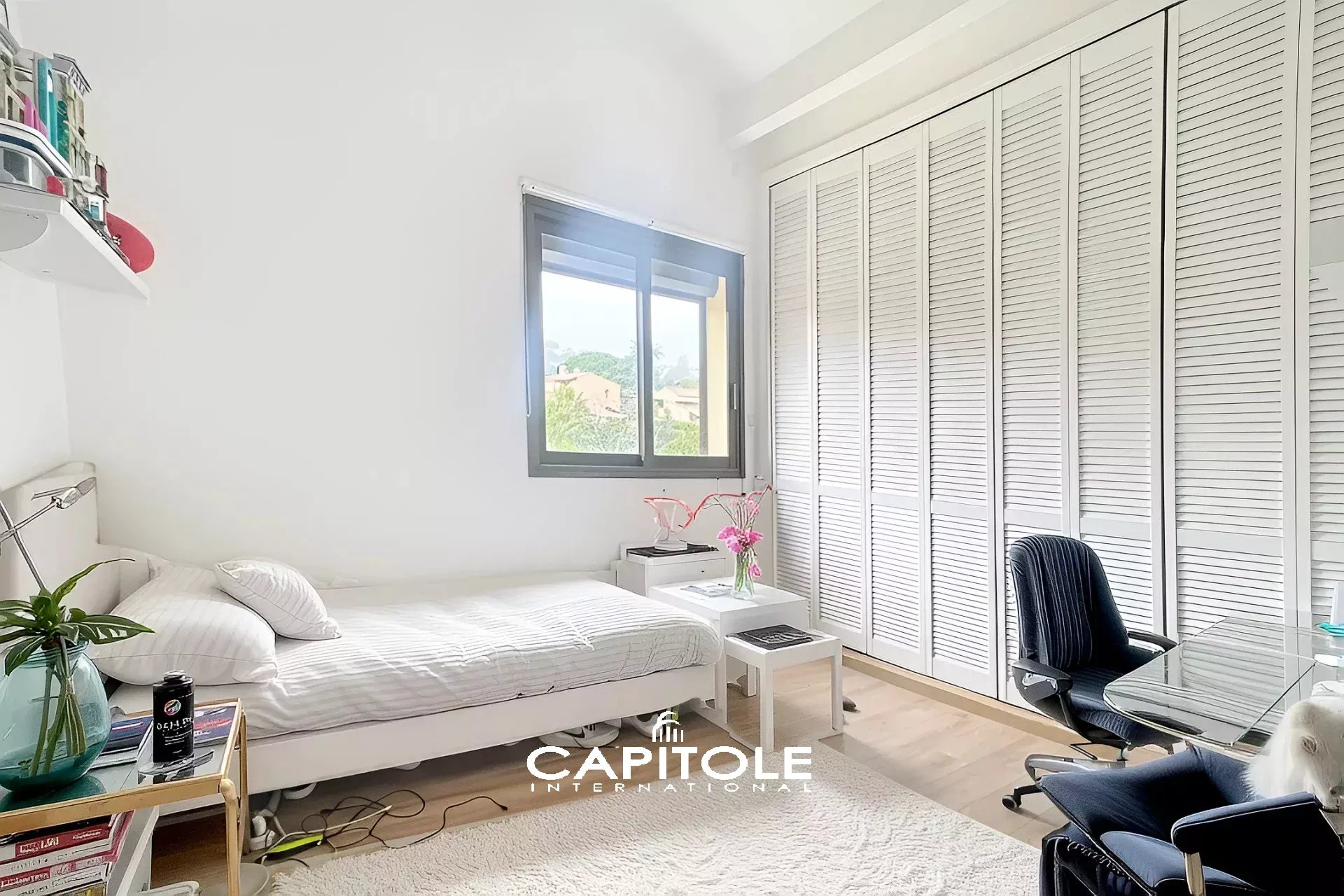 Deux chambres de plain-pied, dont une pouvant faire office de bureau ou de chambre d’enfant, une salle de douche, un WC invités avec lave-mains, ainsi qu’une buanderie complètent ce niveau.