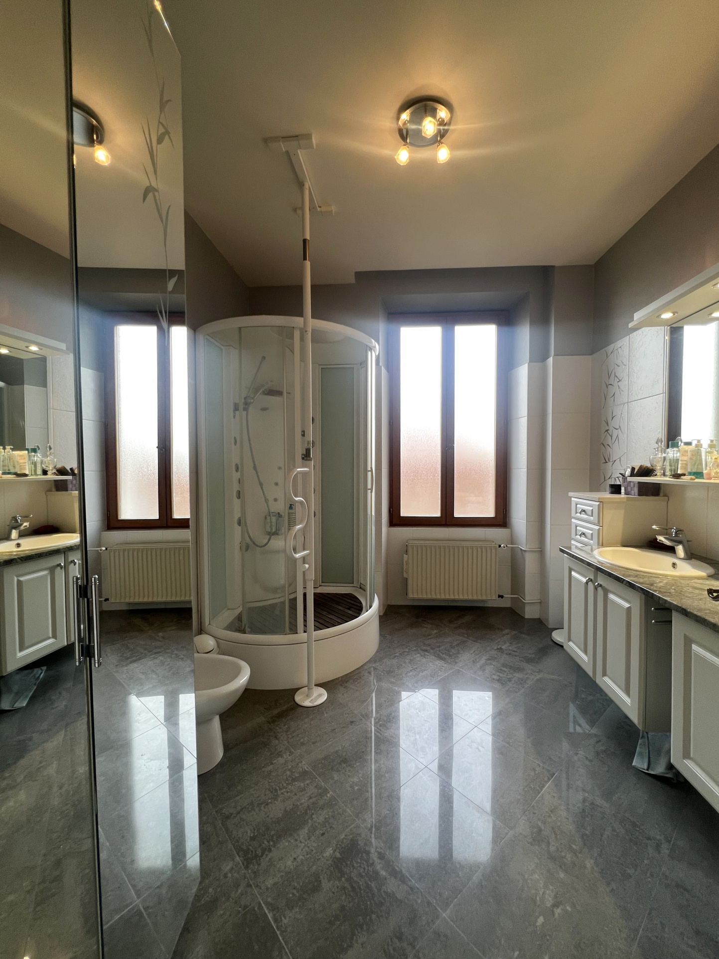 L'ensemble est en excellent état et se distingue par ses généreux volumes et sa remarquable hauteur sous plafond.