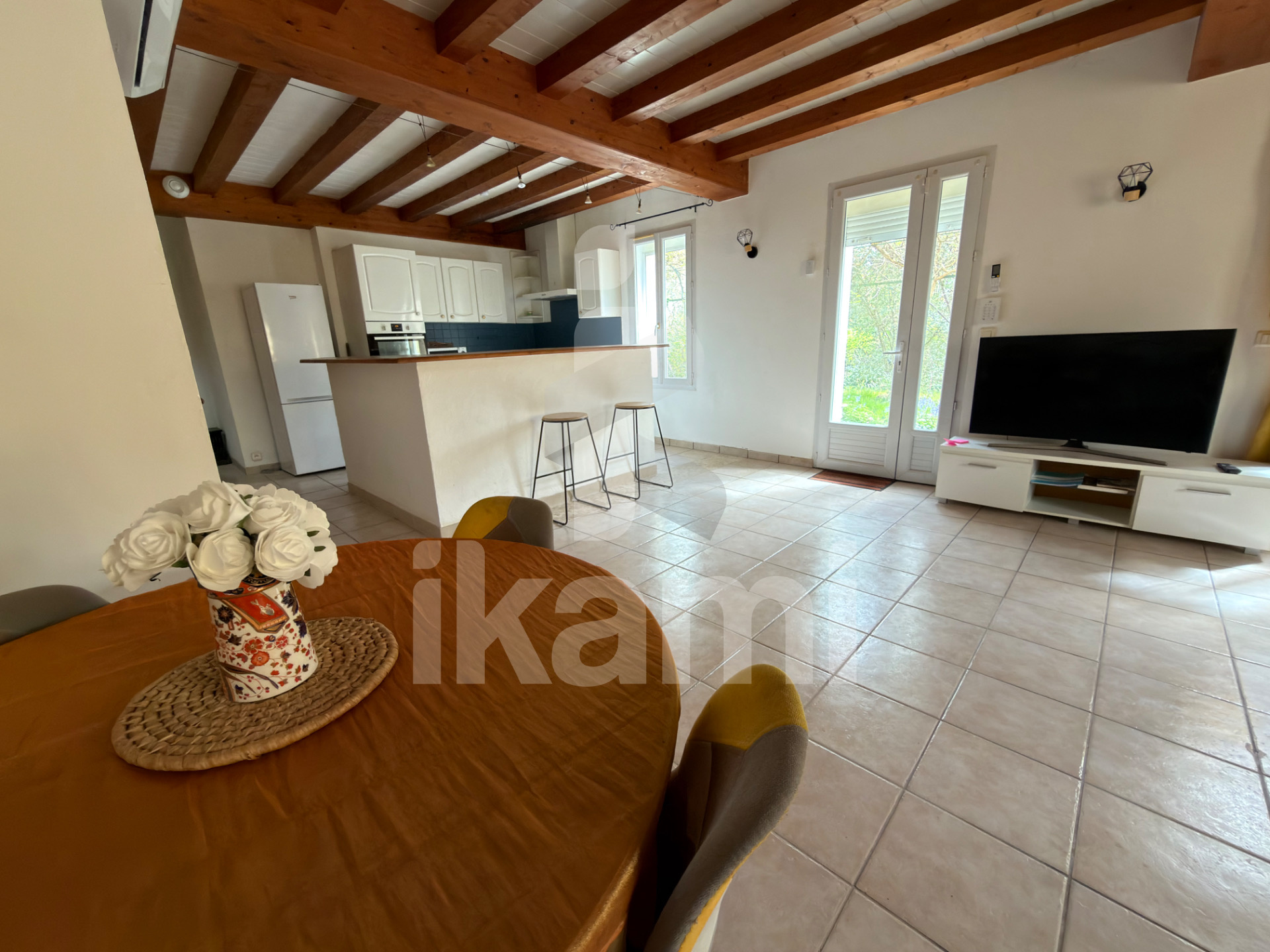 Dès l'entrée, vous découvrirez une agréable pièce de vie lumineuse, largement ouverte sur l'extérieur grâce à une porte-fenêtre et trois fenêtres. Cet espace convivial accueille un salon et une salle à manger harmonieusement agencés, ainsi qu'une cuisine ouverte moderne et équipée, idéale pour partager des moments en famille ou entre amis.