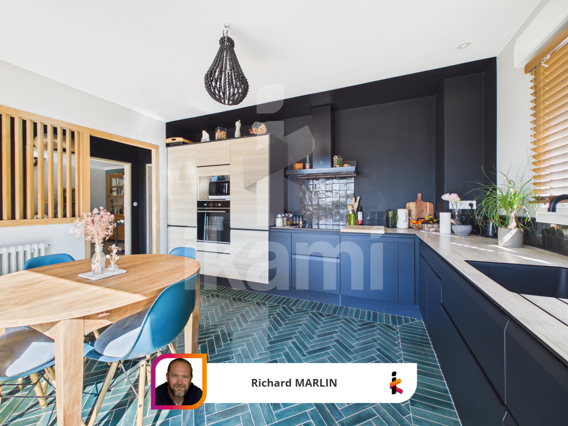 Au rez-de-chaussée, une entrée généreuse mène à un salon-séjour baigné de lumière, une cuisine séparée, aménagée et équipée, dont le sol en zellige apporte une touche de charme supplémentaire, ainsi qu'une chambre de plain-pied, une salle de bains et des WC indépendants.