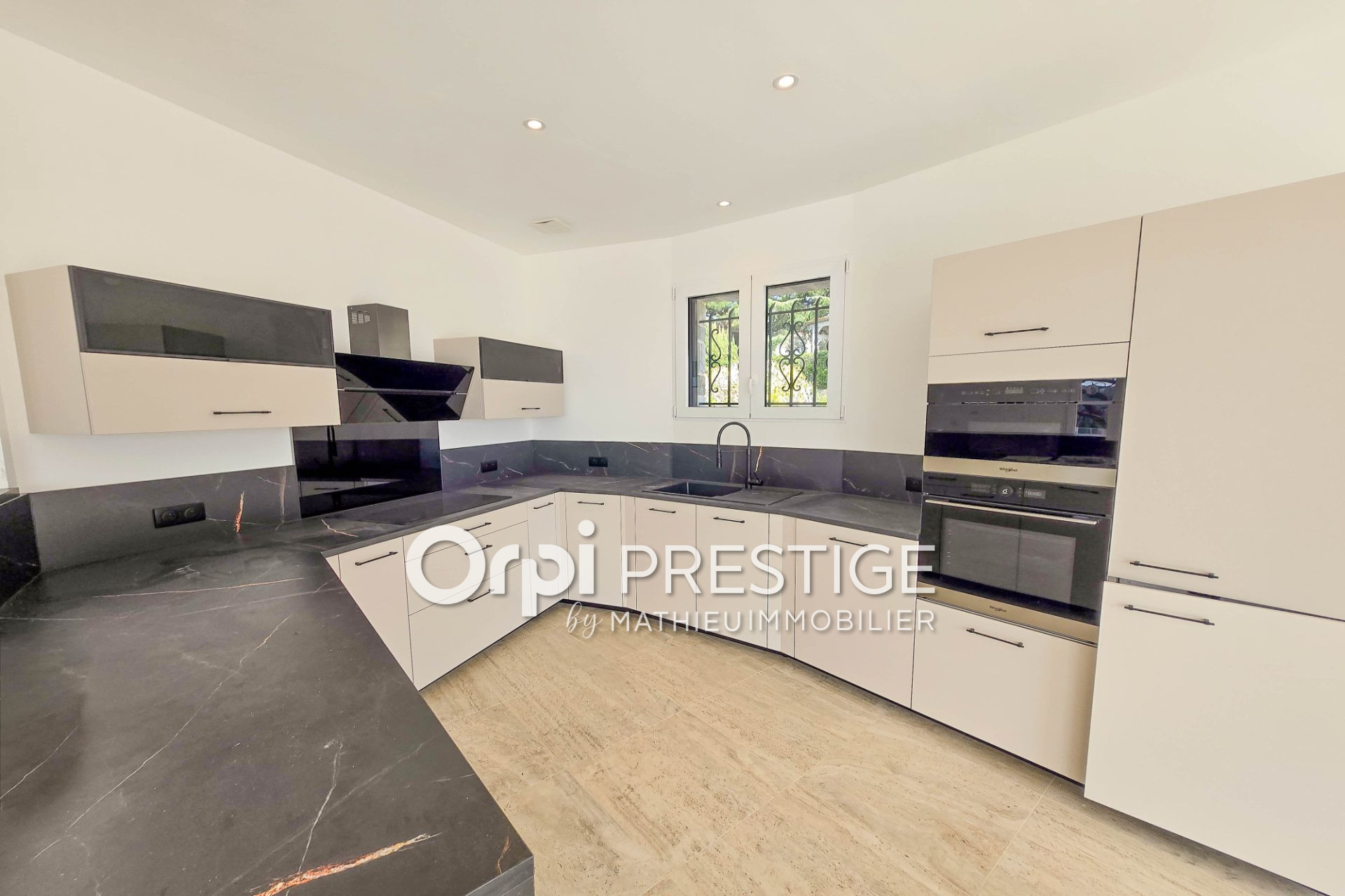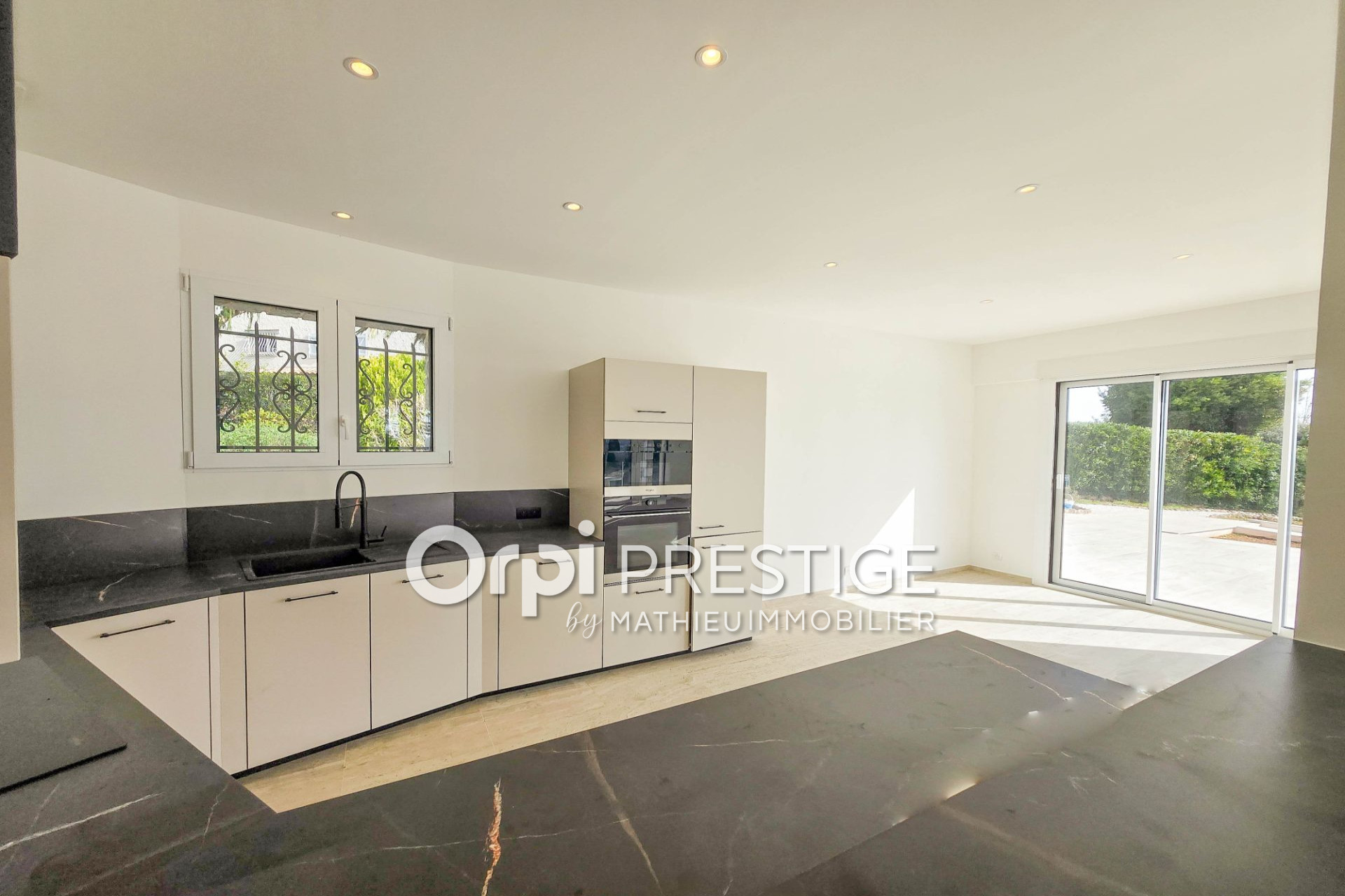 La villa, intégralement reprise, séduit dès l'entrée par ses volumes et la qualité de ses prestations. Le séjour-cuisine américaine de près de 60 m² s'ouvre sur la terrasse couverte, qui devient naturellement le prolongement du salon.
