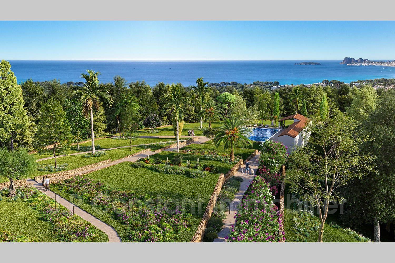 Ce bien d'exception profite d'une pièce de vie de plus de 76m2 baignée de lumière prolongée par de superbes terrasses offrant une vue panoramique sur la mer et les jardins verdoyants de la résidence.