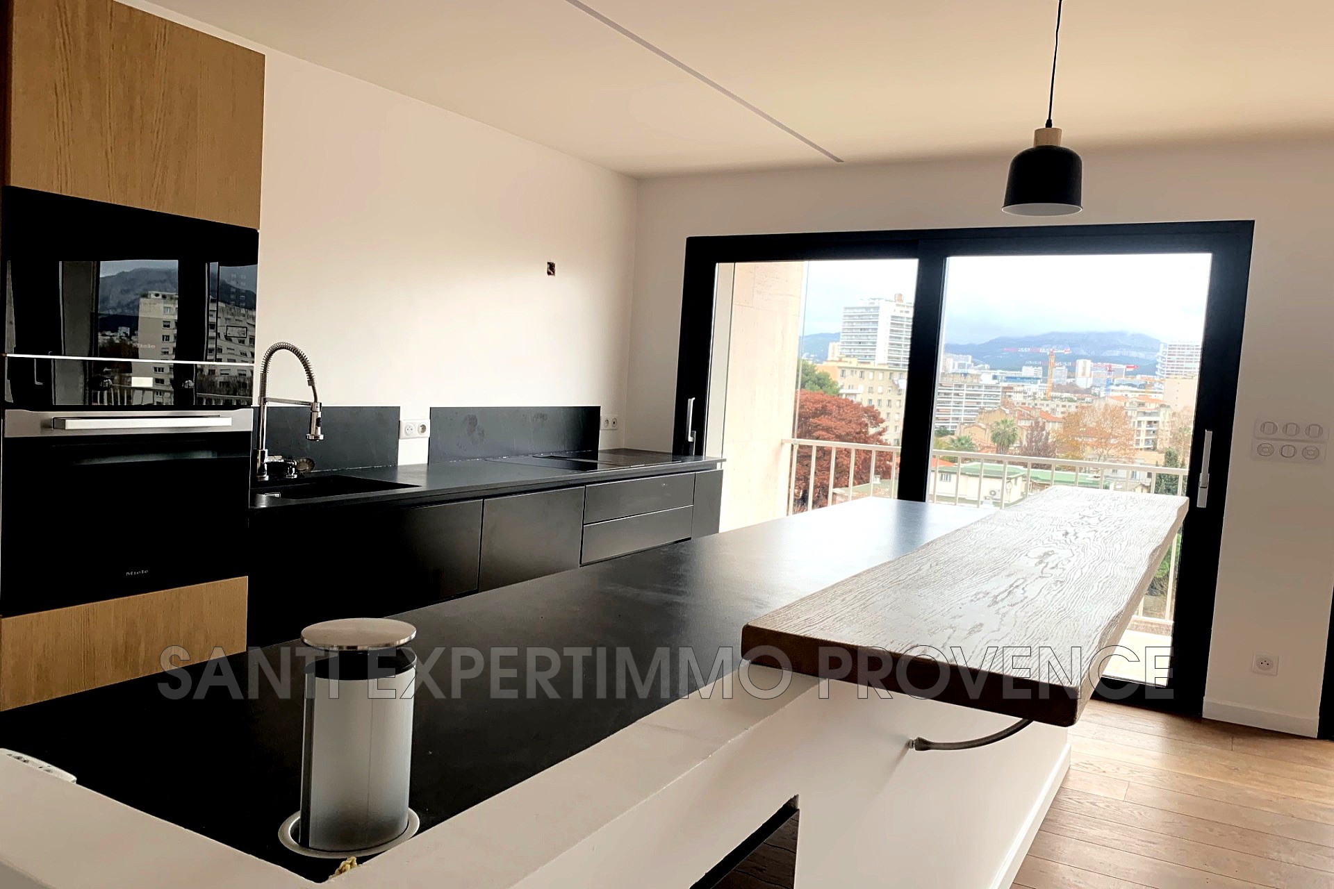 * Une cuisine ouverte complètement aménagée (plan de travail en granit...) et équipée sur séjour (37.6m²) avec de larges baies vitrées