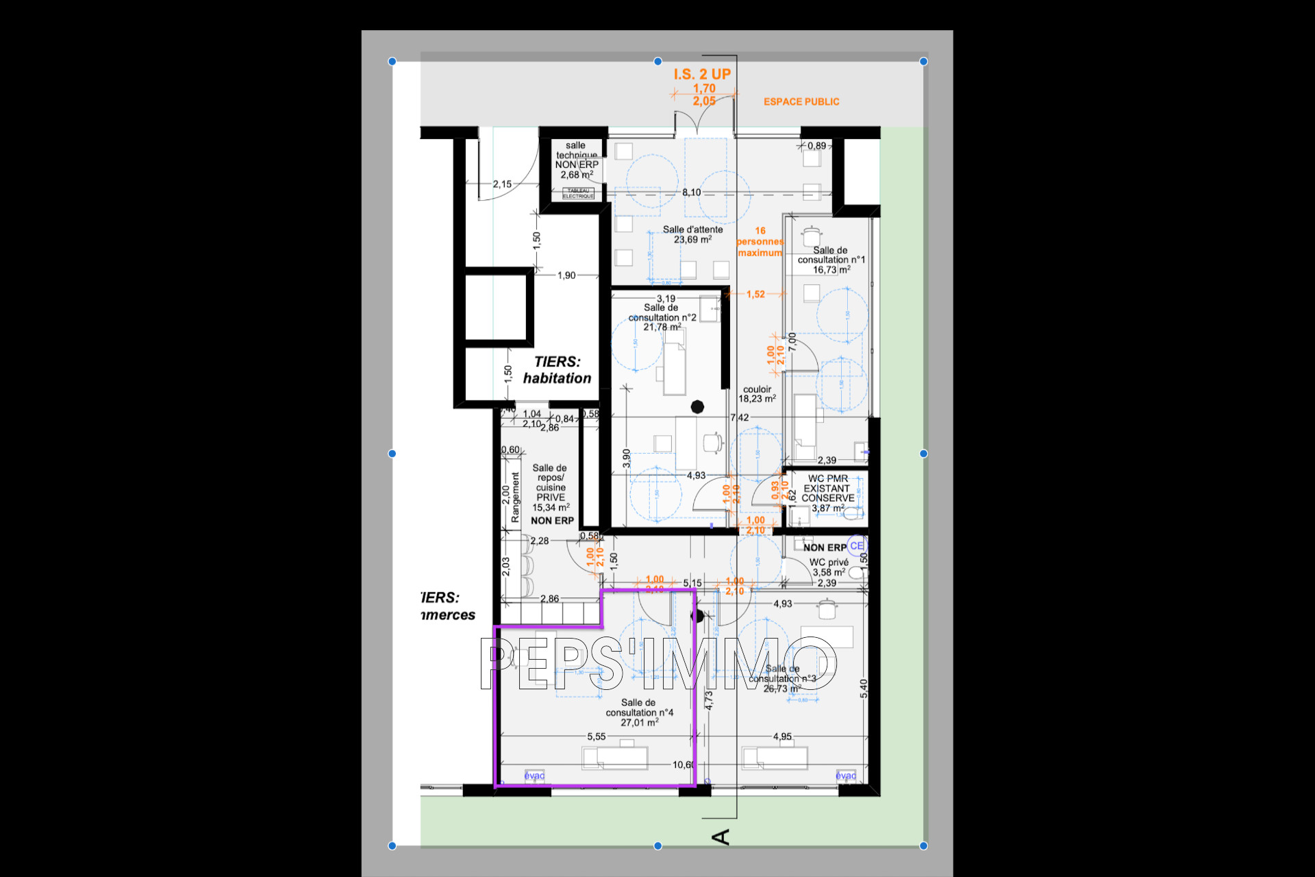 Le local concerné apparaît encadré en violet sur le plan joint.