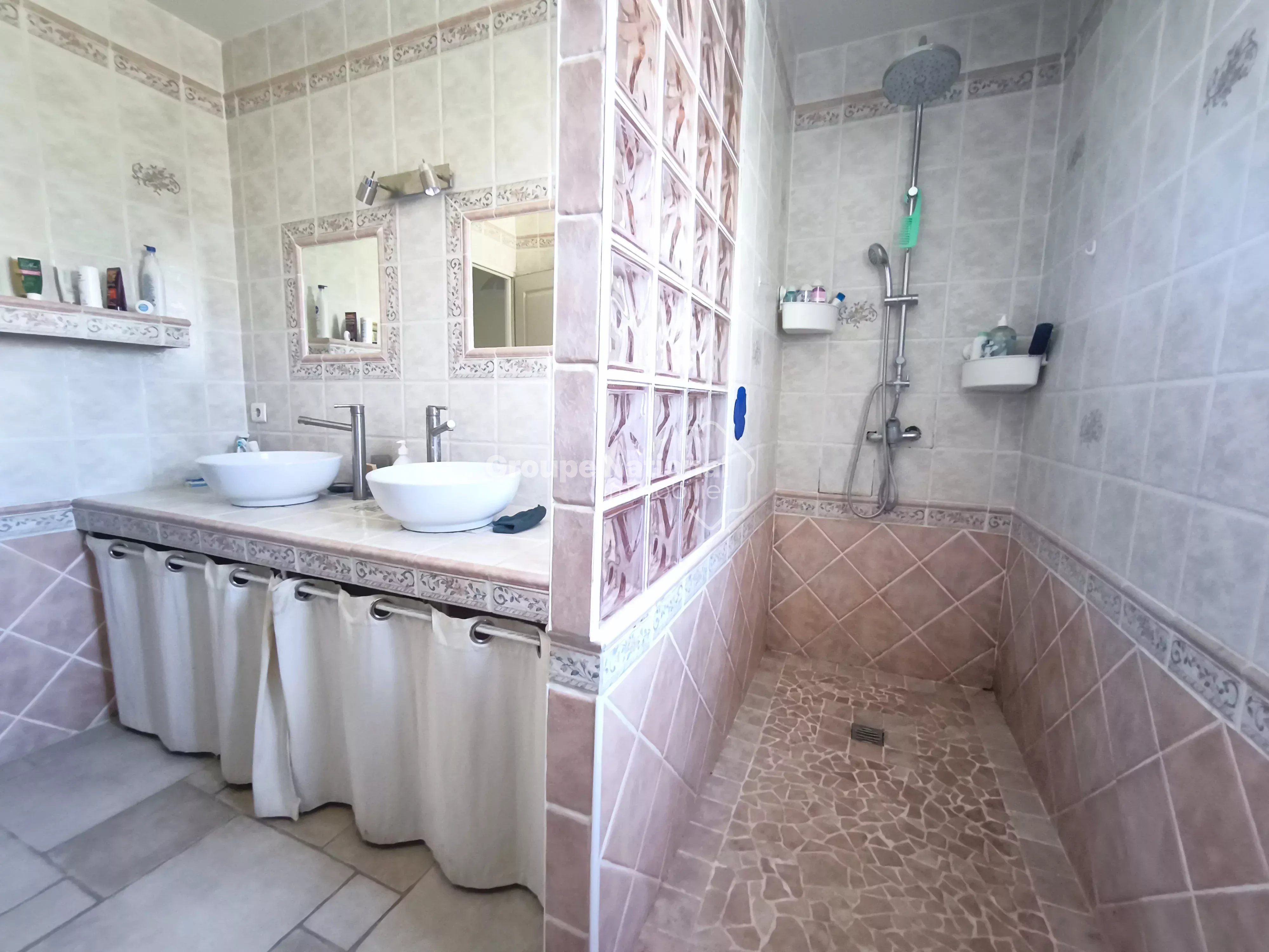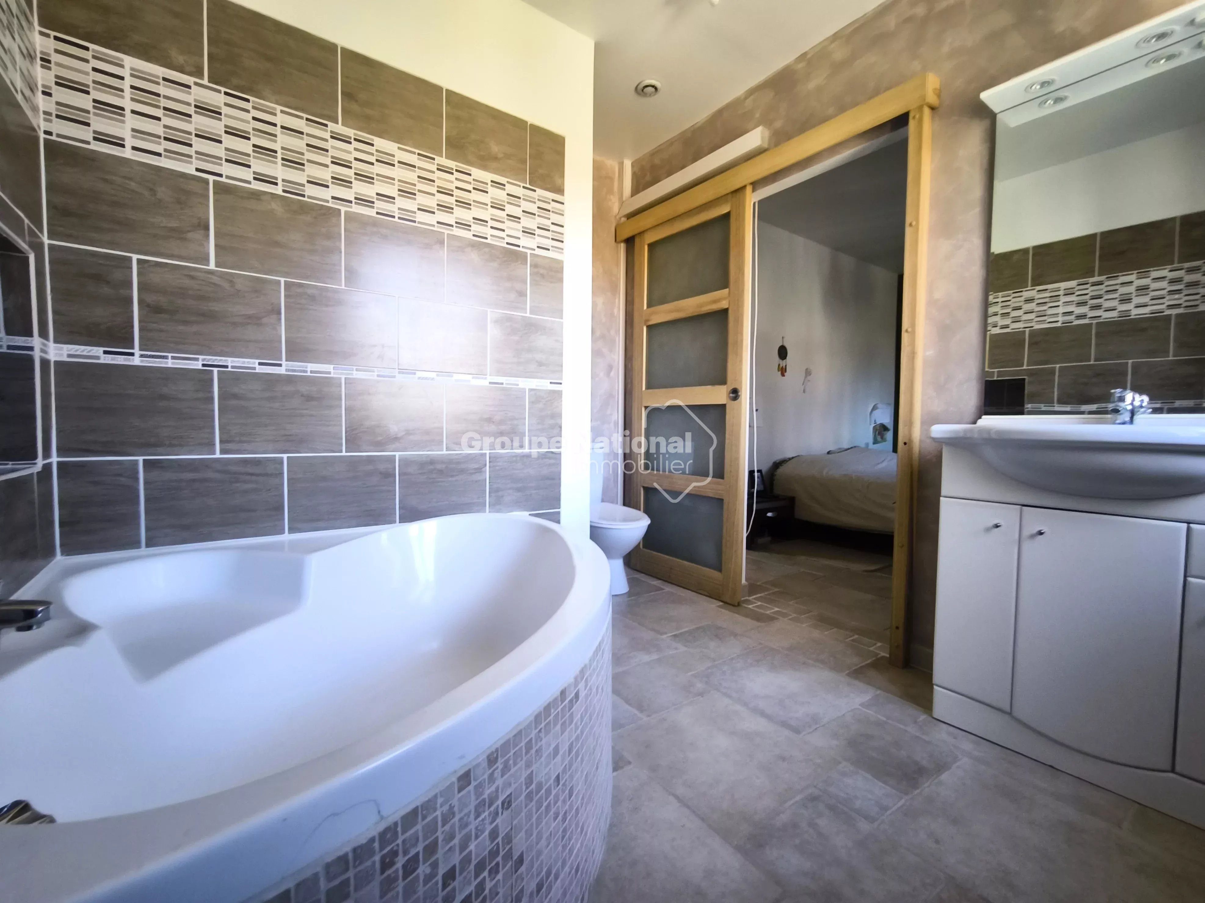 Une belle terrasse carrelée de 23 m² exposé plein sud sans oublié une terrasse en bois coté ouest avec une vue sur la piscine et le super terrain de pétanque.