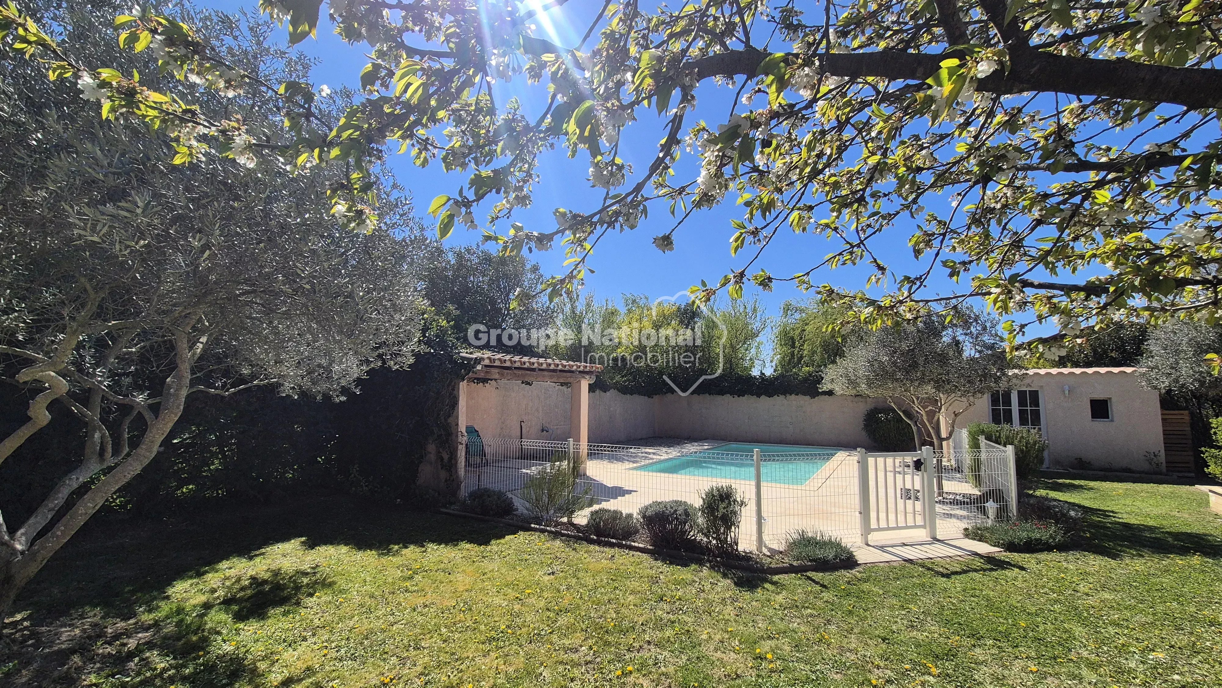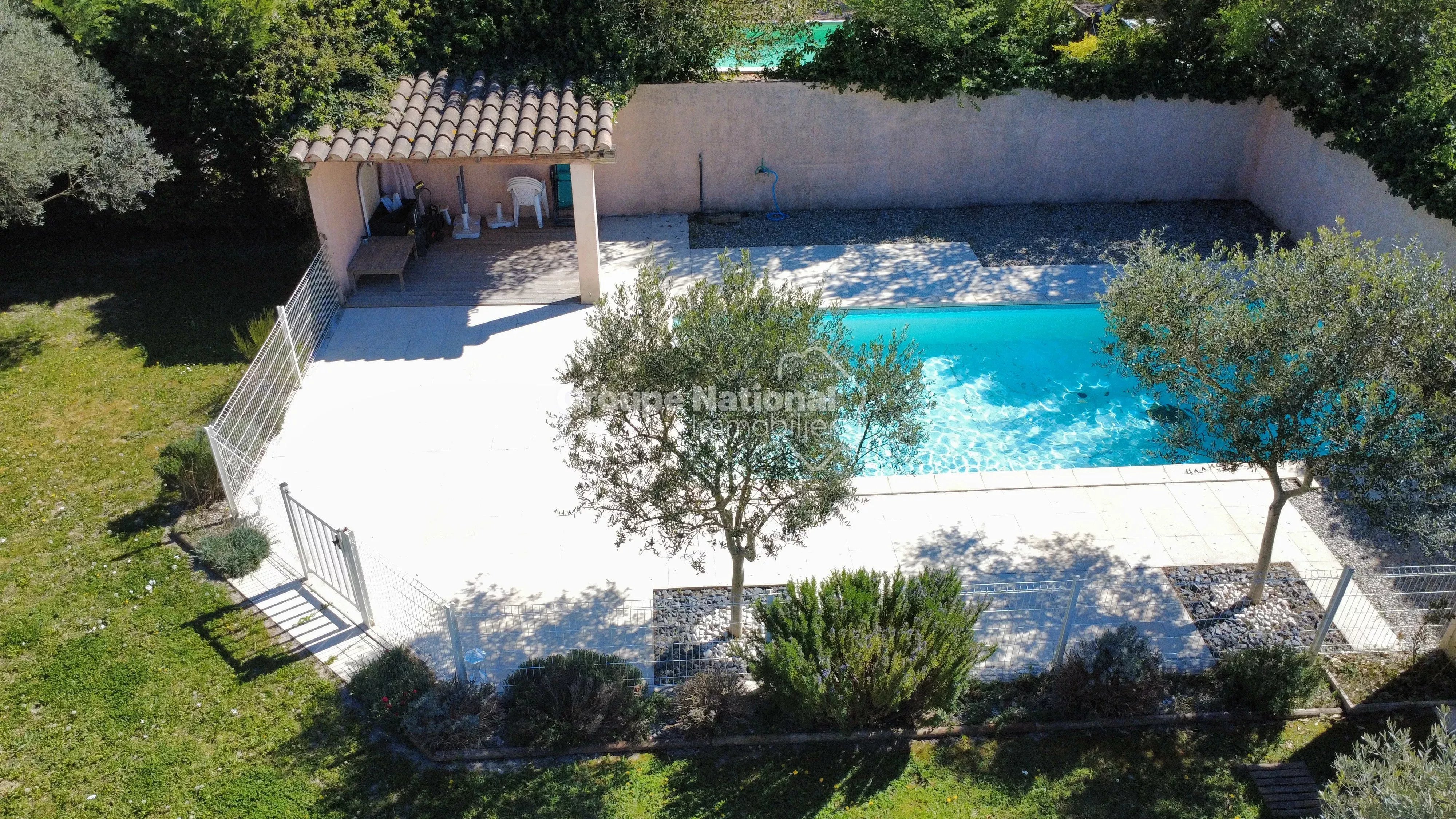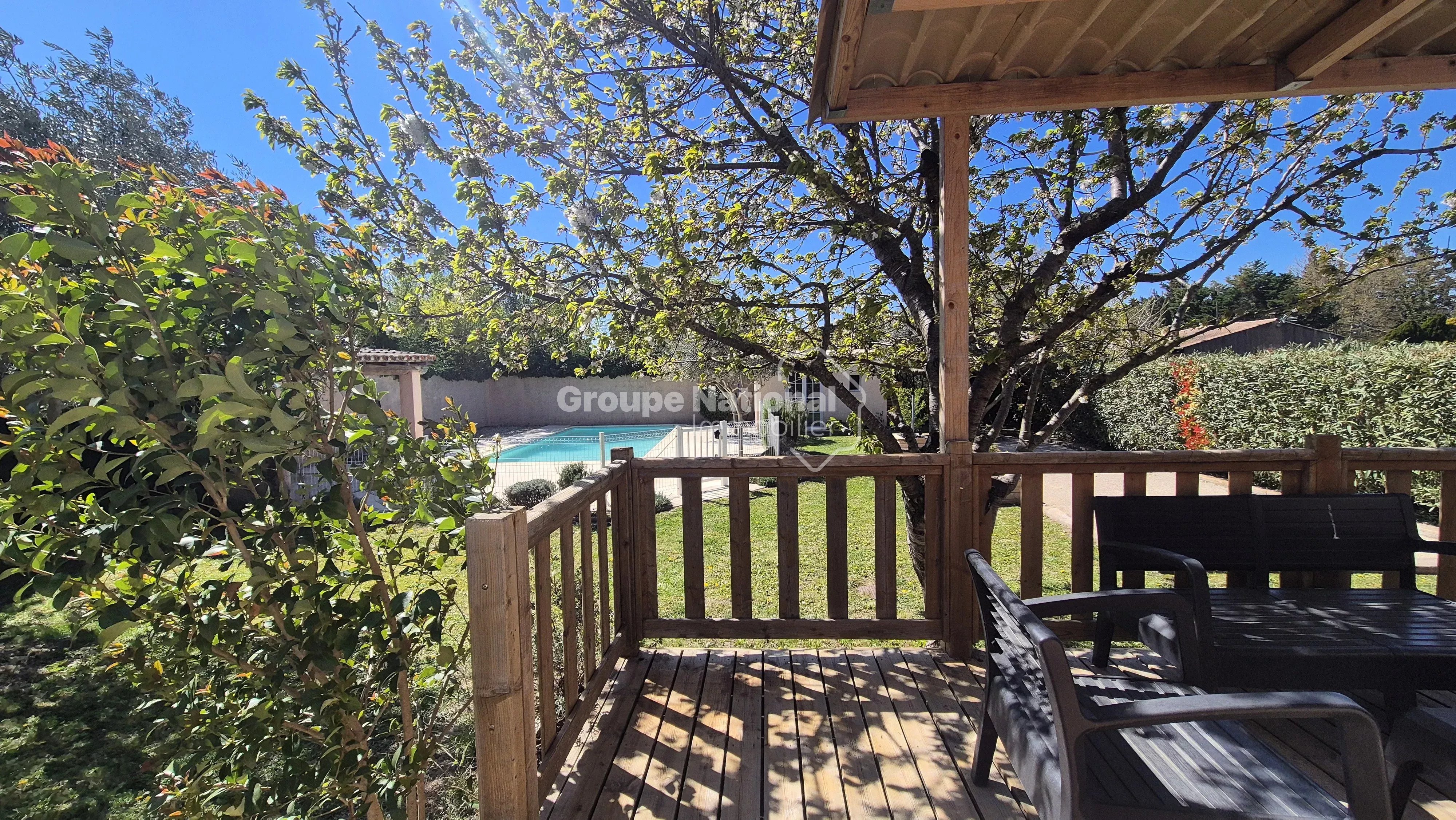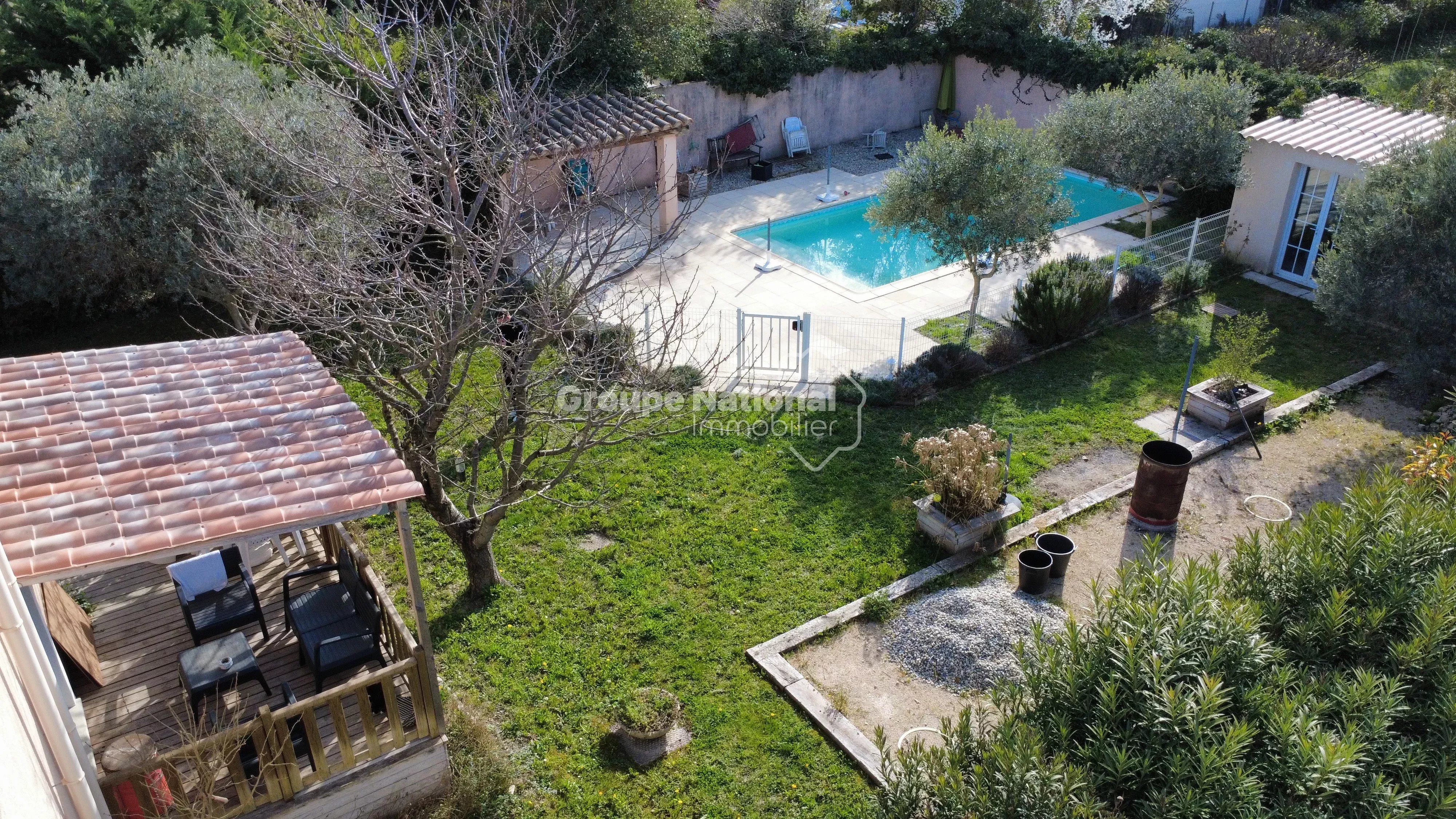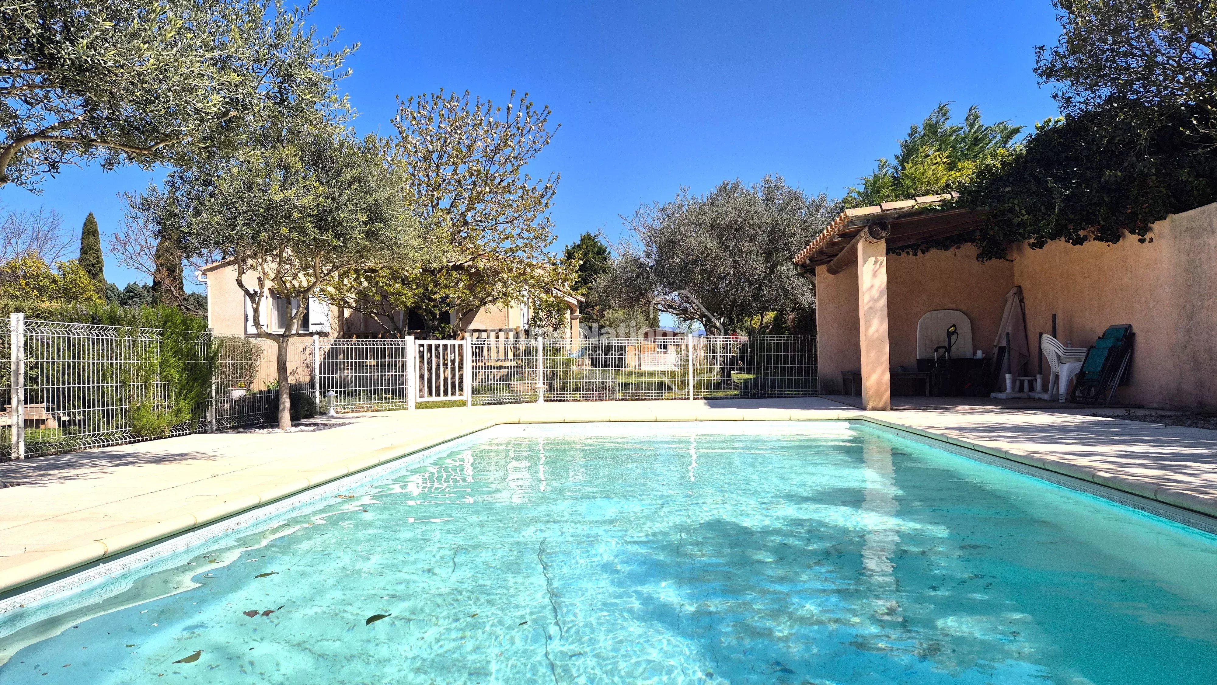 Idéalement située en fond d’impasse, elle bénéficie d’un environnement calme, sans nuisance ni vis-à-vis, sur un terrain clos et arboré de 1 258 m² avec piscine (liner) de 9 x 4 mètres.