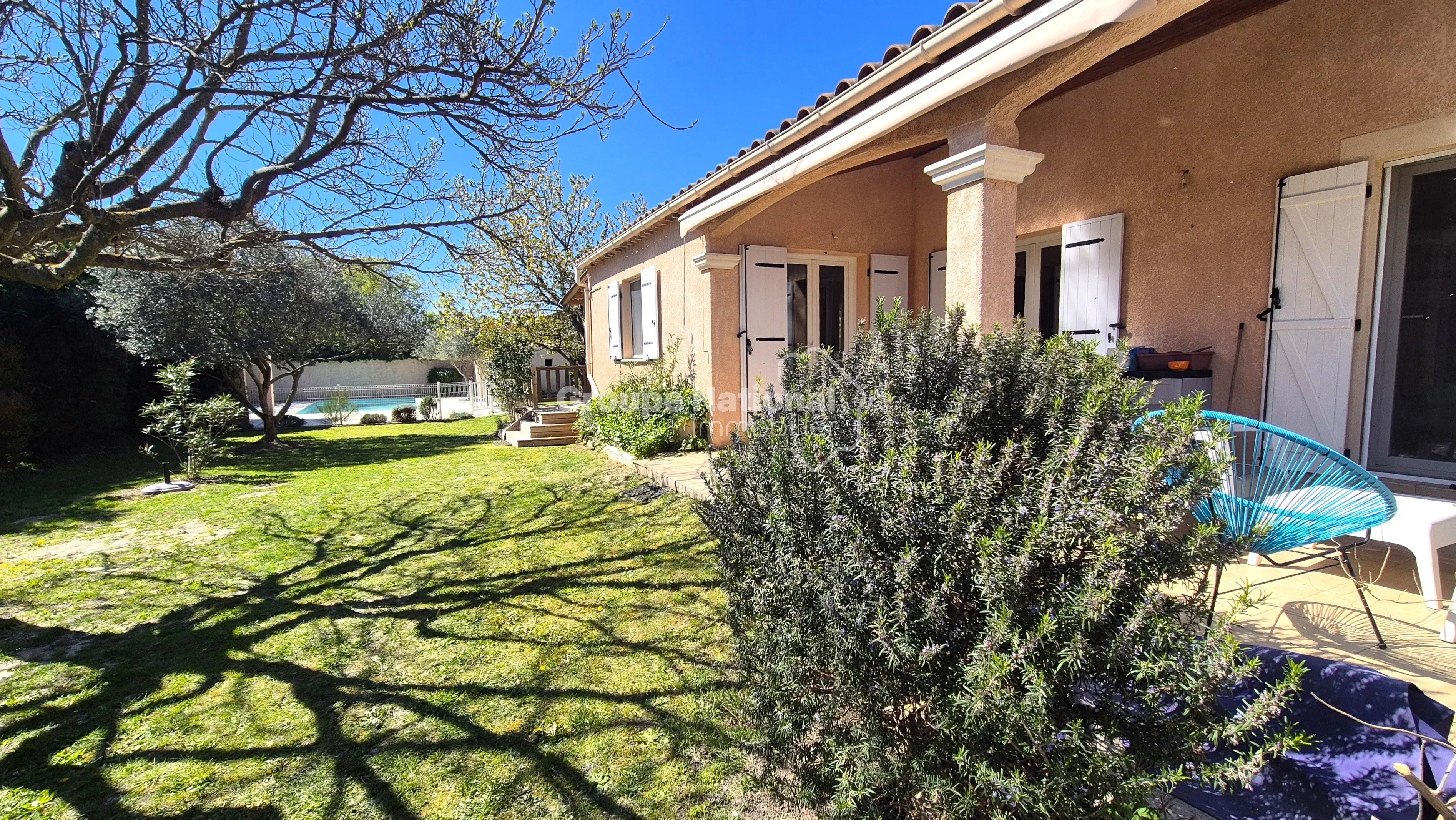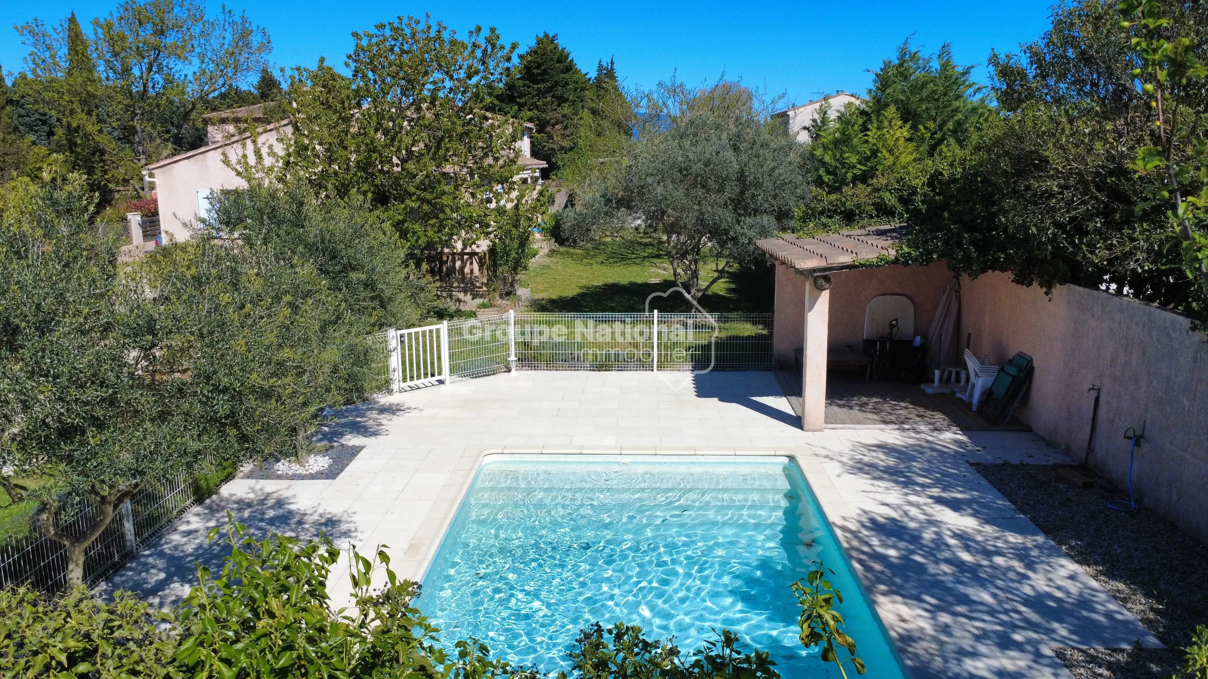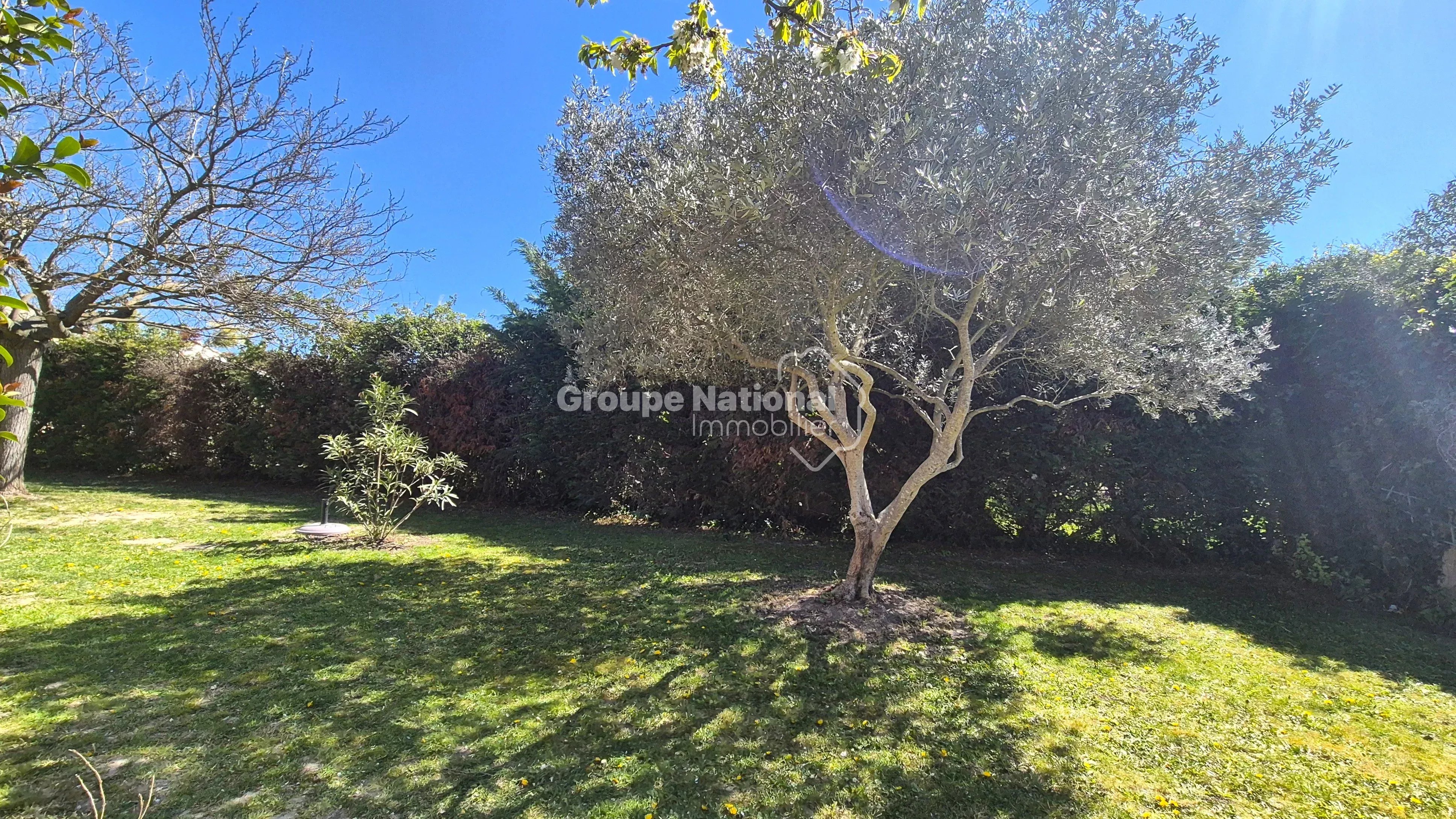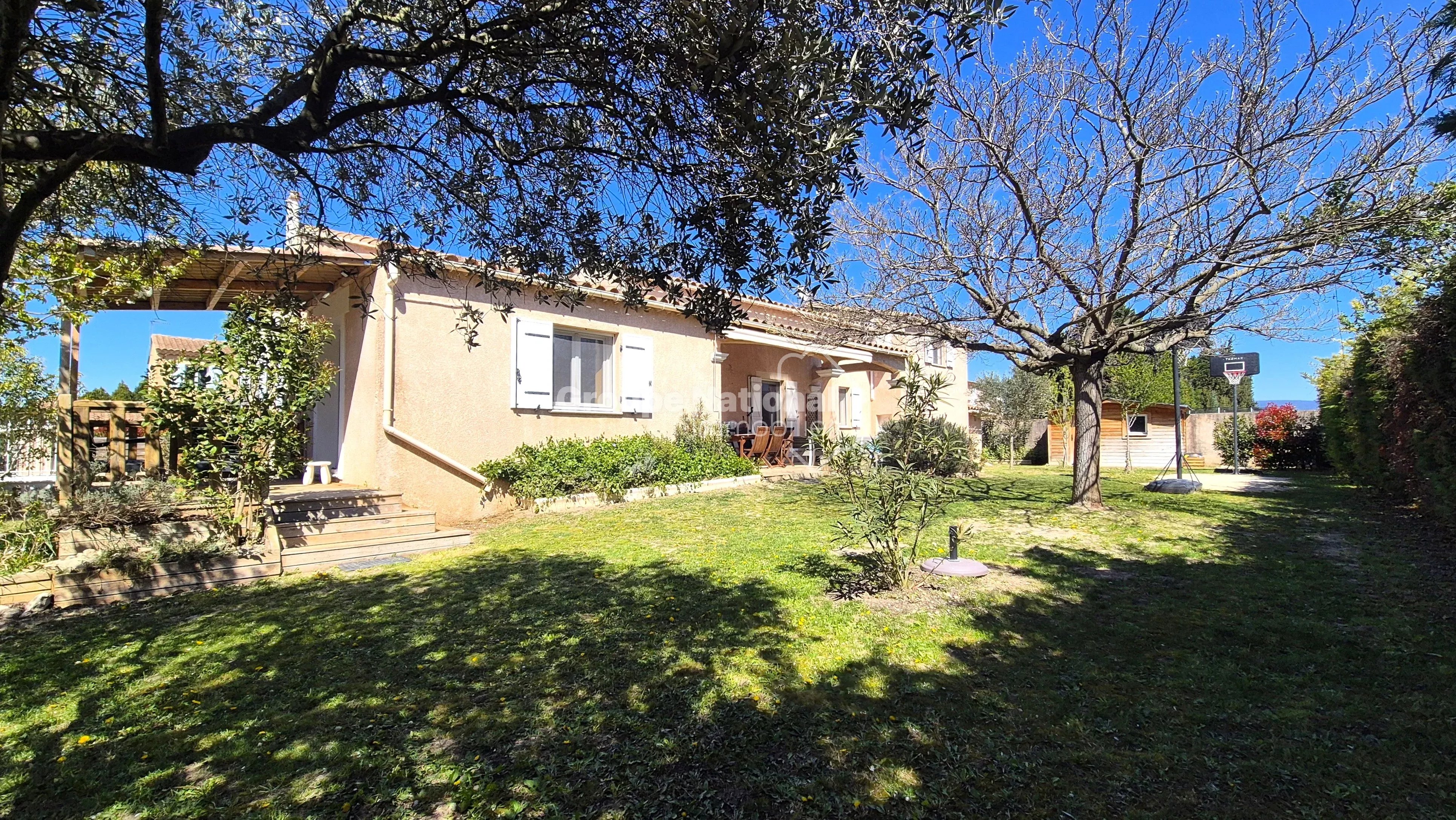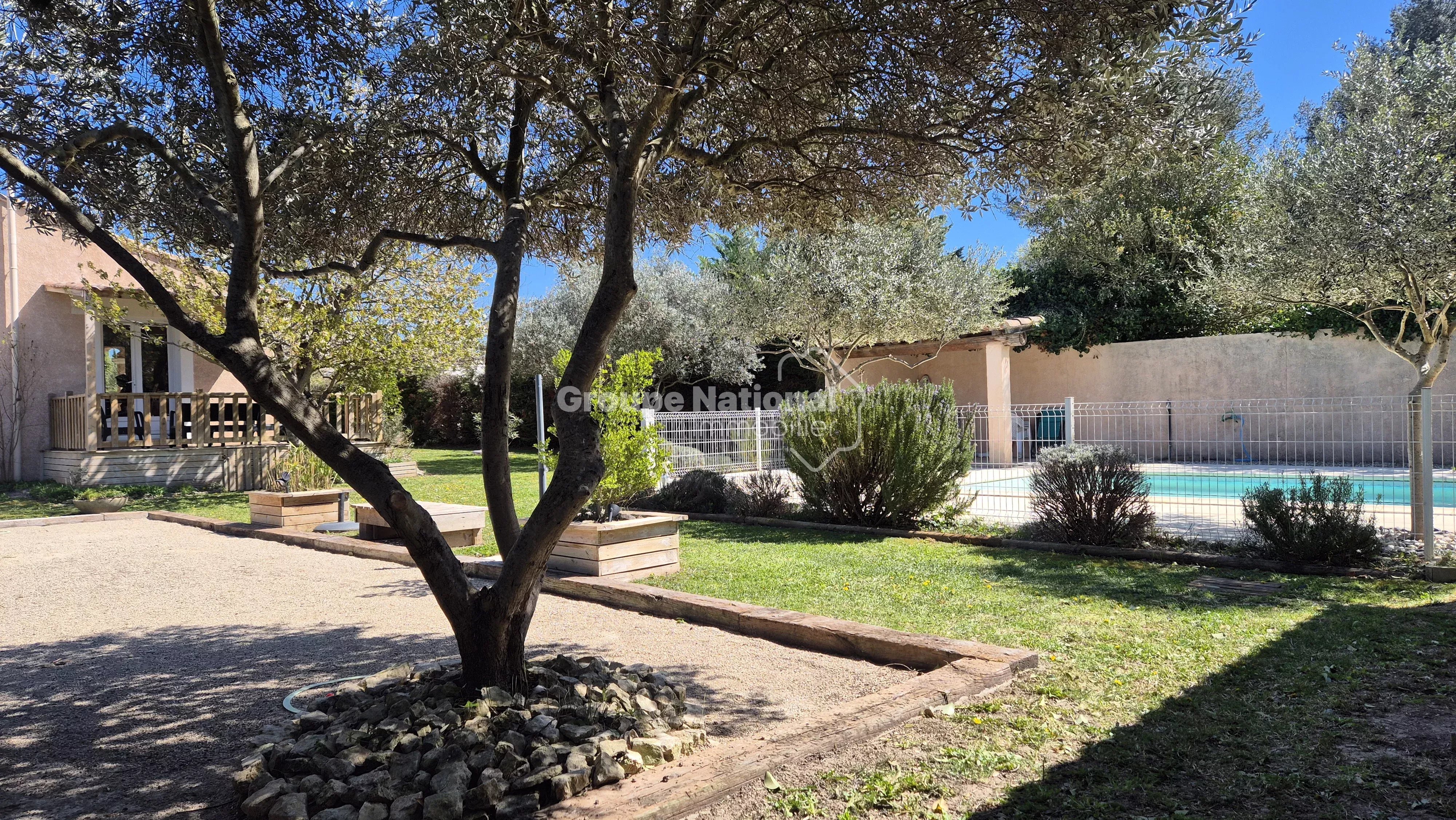 Idéalement située en fond d’impasse, elle bénéficie d’un environnement calme, sans nuisance ni vis-à-vis, sur un terrain clos et arboré de 1 258 m² avec piscine (liner) de 9 x 4 mètres.