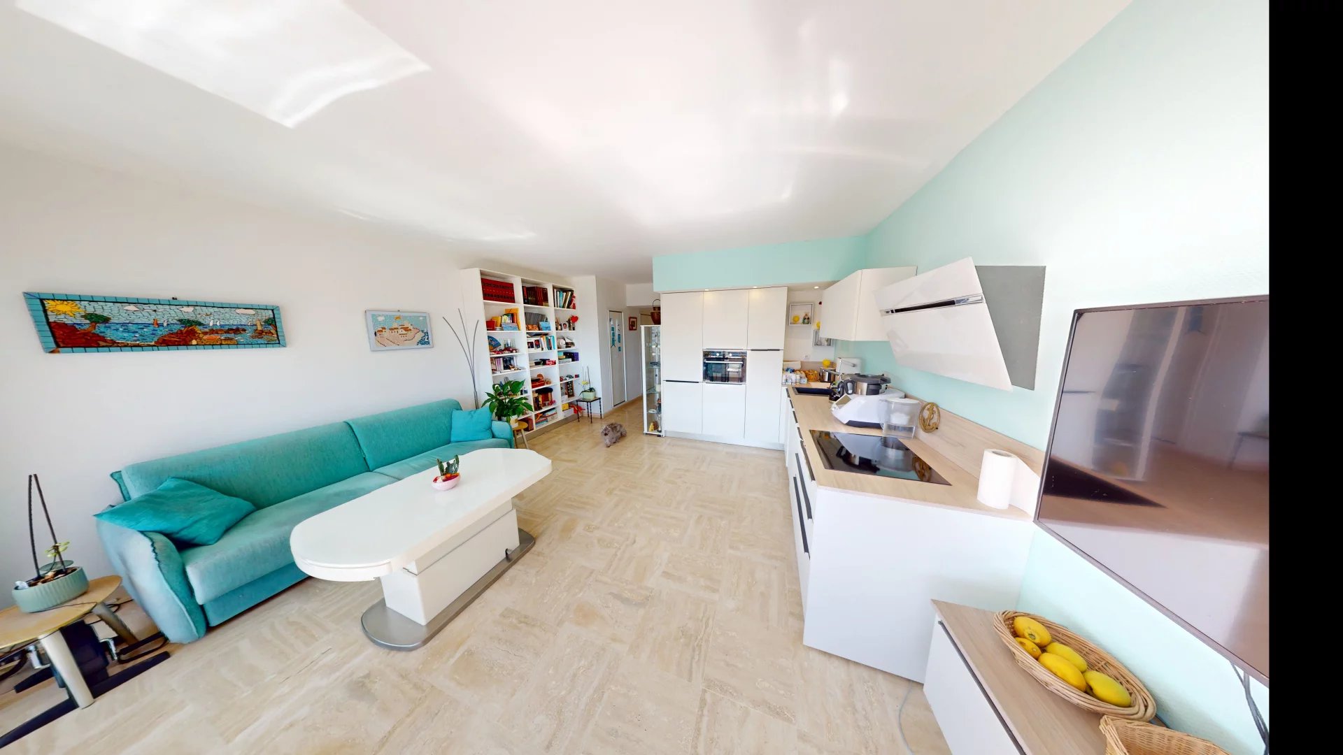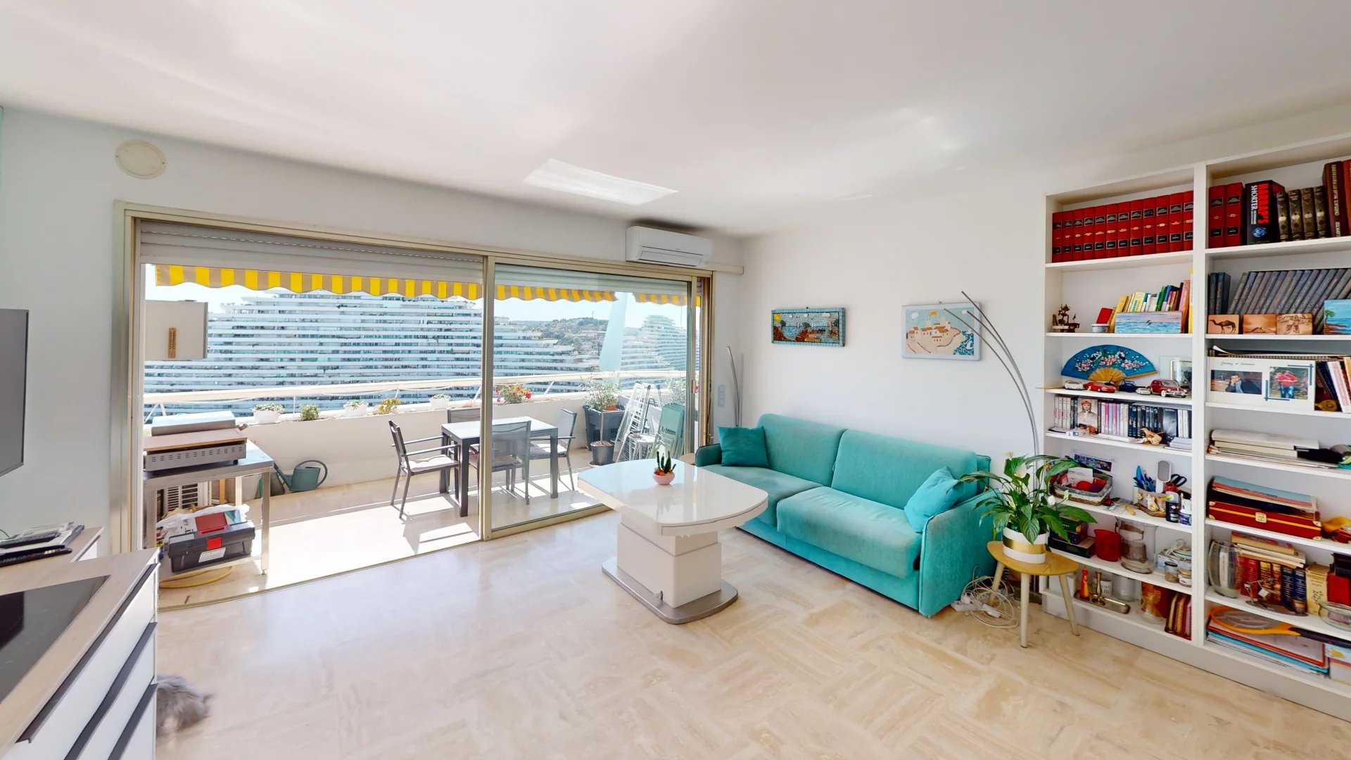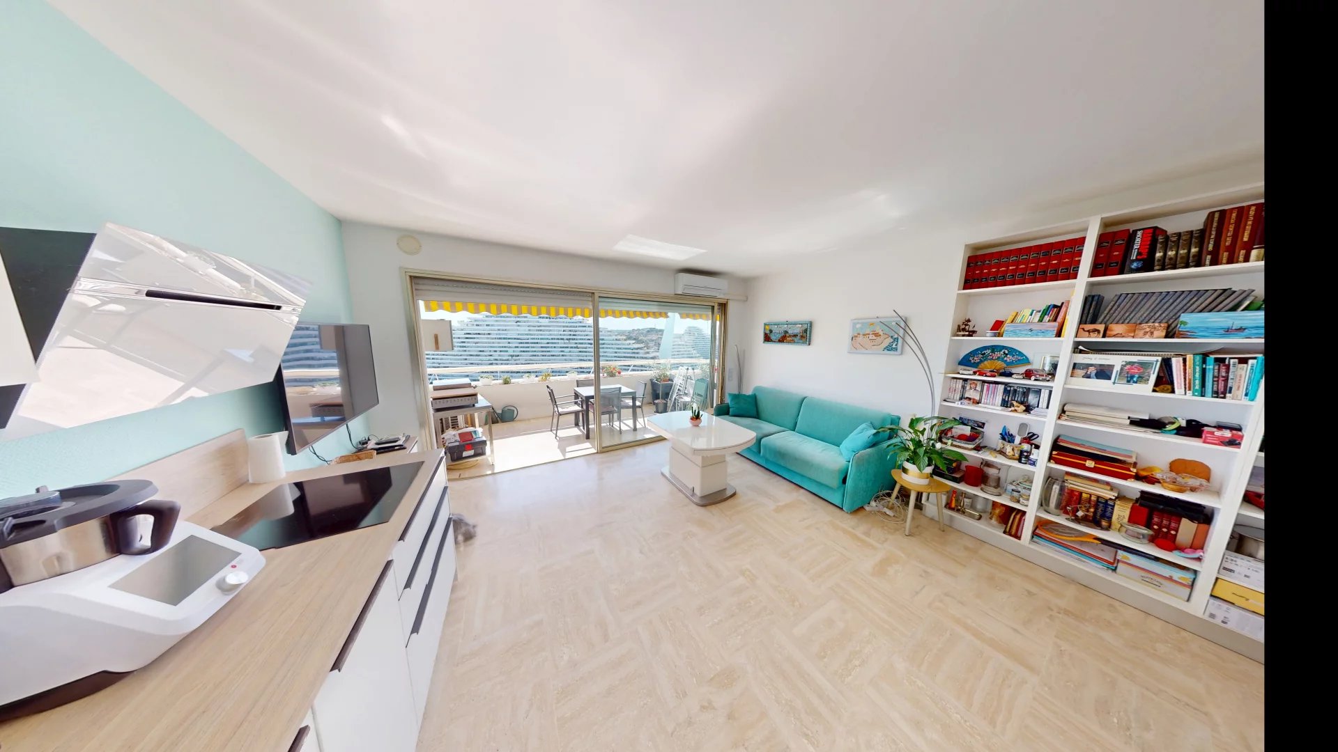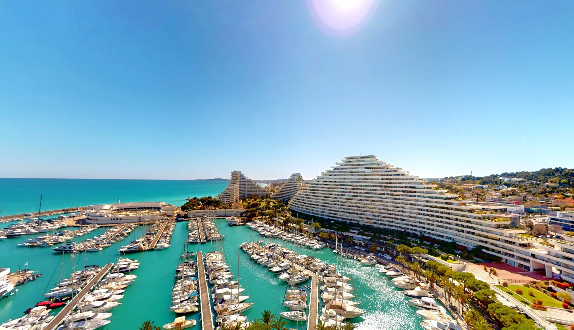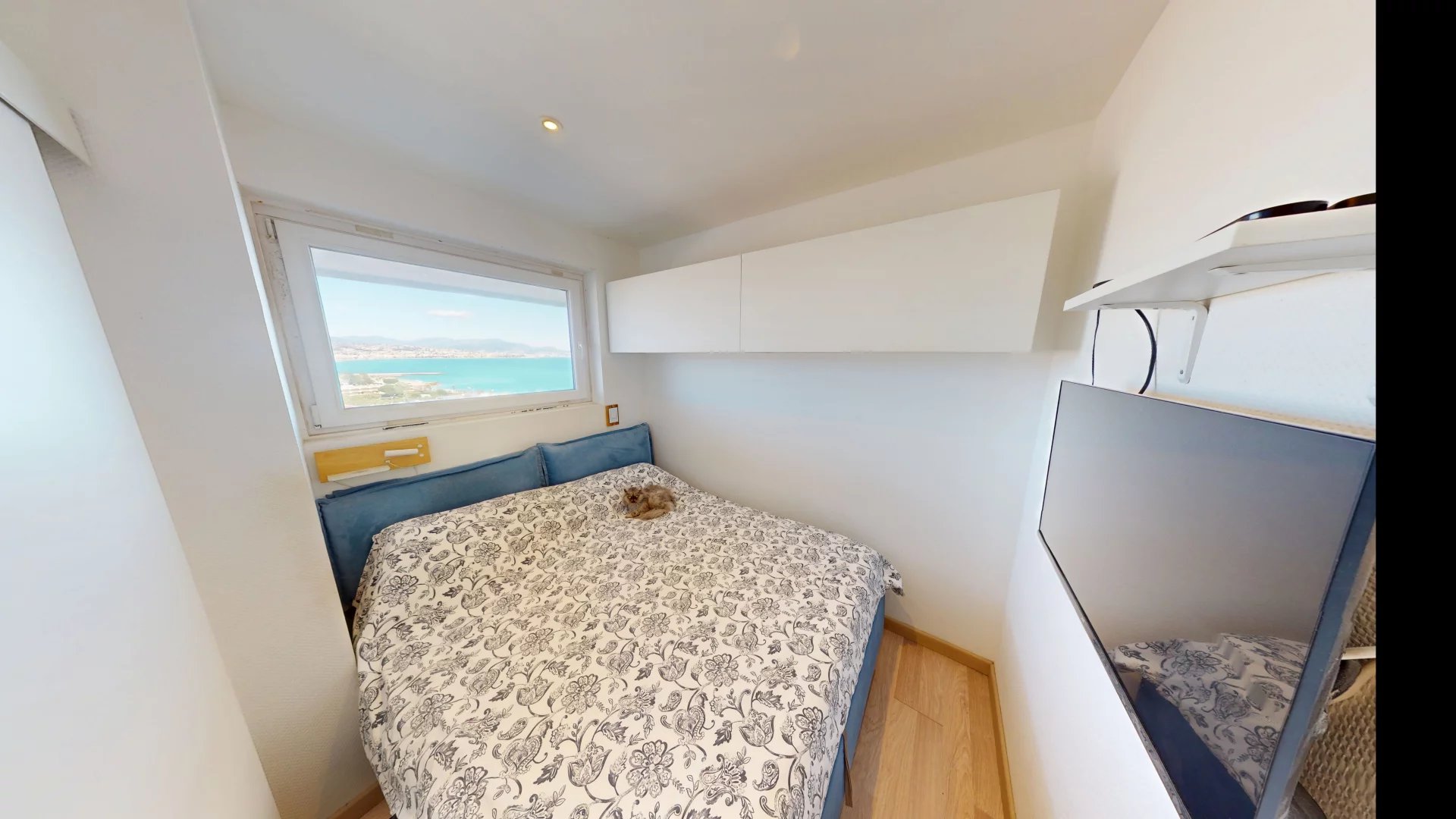 Situé en étage très élevé, exposition plein Sud, il offre une superbe vue sur la mer, le port de Marina et jusqu'au Cap d'Antibes. L'appartement est composé d'un vaste séjour avec cuisine américaine neuve donnant sur une terrasse de 12m². Chambre avec elle aussi un aperçu mer et Mercantour.
